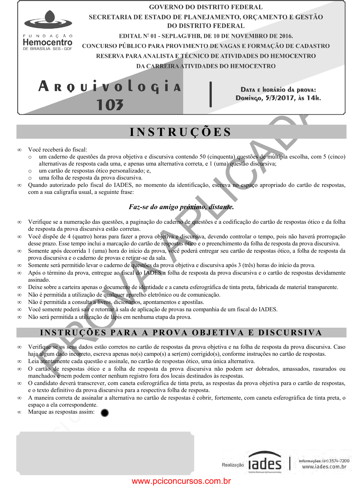 pcimarkpci MDAwMDowMDAwOjAwMDA6MDAwMDowMDAwOmZmZmY6YmFmOTpiNDVi:RnJpLCAyMyBNYXkgMjAyNSAxMToyNzoxMSAtMDMwMA== www.pciconcursos.com.br PROVA A PLIC ADA I N S T R U Ç Õ E S • Você receberá do fiscal: o um caderno de questões da prova objetiva e discursiva contendo 50 (cinquenta) questões de múltipla escolha, com 5 (cinco) alternativas de resposta cada uma, e apenas uma alternativa correta, e 1 (uma) questão discursiva; o um cartão de respostas ótico personalizado; e, o uma folha de resposta da prova discursiva. • Quando autorizado pelo fiscal do IADES, no momento da identificação, escreva no espaço apropriado do cartão de respostas, com a sua caligrafia usual, a seguinte frase: Faz-se do amigo próximo, distante. • Verifique se a numeração das questões, a paginação do caderno de questões e a codificação do cartão de respostas ótico e da folha de resposta da prova discursiva estão corretas. • Você dispõe de 4 (quatro) horas para fazer a prova objetiva e discursiva, devendo controlar o tempo, pois não haverá prorrogação desse prazo. Esse tempo inclui a marcação do cartão de respostas ótico e o preenchimento da folha de resposta da prova discursiva. • Somente após decorrida 1 (uma) hora do início da prova, você poderá entregar seu cartão de respostas ótico, a folha de resposta da prova discursiva e o caderno de provas e retirar-se da sala. • Somente será permitido levar o caderno de questões da prova objetiva e discursiva após 3 (três) horas do início da prova. • Após o término da prova, entregue ao fiscal do IADES a folha de resposta da prova discursiva e o cartão de respostas devidamente assinado. • Deixe sobre a carteira apenas o documento de identidade e a caneta esferográfica de tinta preta, fabricada de material transparente. • Não é permitida a utilização de qualquer aparelho eletrônico ou de comunicação. • Não é permitida a consulta a livros, dicionários, apontamentos e apostilas. • Você somente poderá sair e retornar à sala de aplicação de provas na companhia de um fiscal do IADES. • Não será permitida a utilização de lápis em nenhuma etapa da prova. I NSTRUÇÕES PARA A PROVA OBJETI VA E D I SCURSI VA • Verifique se os seus dados estão corretos no cartão de respostas da prova objetiva e na folha de resposta da prova discursiva. Caso haja algum dado incorreto, escreva apenas no(s) campo(s) a ser(em) corrigido(s), conforme instruções no cartão de respostas. • Leia atentamente cada questão e assinale, no cartão de respostas ótico, uma única alternativa. • O cartão de respostas ótico e a folha de resposta da prova discursiva não podem ser dobrados, amassados, rasurados ou manchados e nem podem conter nenhum registro fora dos locais destinados às respostas. • O candidato deverá transcrever, com caneta esferográfica de tinta preta, as respostas da prova objetiva para o cartão de respostas, e o texto definitivo da prova discursiva para a respectiva folha de resposta. • A maneira correta de assinalar a alternativa no cartão de respostas é cobrir, fortemente, com caneta esferográfica de tinta preta, o espaço a ela correspondente. • Marque as respostas assim: www.pciconcursos.com.br pcimarkpci MDAwMDowMDAwOjAwMDA6MDAwMDowMDAwOmZmZmY6YmFmOTpiNDVi:RnJpLCAyMyBNYXkgMjAyNSAxMToyNzoxMSAtMDMwMA== www.pciconcursos.com.br PROVA A PLIC ADA CONCURSO PÚBLICO – HEMOCENTRO 103 – ARQUIVOLOGIA – TIPO A PÁGINA 2/12 CONHECIMENTOS BÁSICOS Questões de 1 a 25 LÍNGUA PORTUGUESA Questões de 1 a 8 Texto 1 para responder às questões 1 e 2. Disponível em: . Acesso em: 20 dez. 2016. QUESTÃO 1 _______________________ Com base na leitura compreensiva do texto, assinale a alternativa correta. (A) A mensagem principal é um apelo para que a população faça parte de uma campanha de doação de sangue. (B) Somente a partir dos 19 anos de idade, uma pessoa pode doar sangue sem precisar apresentar formalmente o consentimento do respectivo responsável. (C) Desde que com consentimento formal do respectivo responsável, qualquer pessoa menor de 18 anos de idade pode ser doadora de sangue. (D) Uma pessoa que pesa precisamente 50 kg, mesmo que atenda a todas as outras orientações, não pode ser doadora de sangue. (E) Uma pessoa que consome alimentos gordurosos não pode doar sangue, pois deixa de observar a orientação “Estar bem de saúde”. QUESTÃO 2 _______________________ Com base apenas nas regras prescritas pela norma-padrão acerca da acentuação gráfica e do uso do sinal indicativo de crase, assinale a alternativa correta. (A) A construção “Orientações para o doador” poderia ser substituída pela redação Orientações à toda pessoa que pretende doar. (B) Caso o emissor decidisse explicitar o local de doação de sangue, poderia substituir a construção “Levar documento oficial de identidade com foto” por qualquer uma das seguintes redações: Levar à sua unidade de doação documento oficial de identidade com foto ou Levar a sua unidade de doação documento oficial de identidade com foto. (C) Assim como o vocábulo “saúde”, também estão corretamente acentuados saída, gratuíto e rúbrica . (D) O emissor poderia substituir a expressão “alimentos gordurosos” pela redação alimentos que contém gordura. (E) O trecho “nas três horas que antecedem a doação” poderia ser substituído por apenas uma das seguintes redações: nas três horas anteriores a doação ou à três horas antes da doação. Texto 2 para responder às questões de 3 a 5. 1 4 7 10 13 16 18 Doação de sangue Ninguém está livre de precisar de uma transfusão de sangue. Ninguém está livre de sofrer um acidente, de passar por uma cirurgia ou por um procedimento médico em que a transfusão seja absolutamente indispensável. Como não existe sangue sintético produzido em laboratórios, quem precisa de transfusão tem de contar com a boa vontade de doadores, uma vez que 