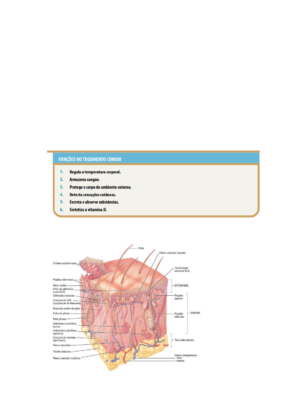 Descrever a histologia da pele Analisar a anatofisiologia da pele Sistema Tegumentar O tegumento comum é composto por pele, pêlos, glândulas sebáceas e sudoríparas, unhas e receptores sensitivos. Possui função de manter a temperatura corporal constante, proteger o corpo e fornecer informações sensitivas do ambiente. A pele é dividida em derme, epiderme e hipoderme Epiderme Composta por epitélio pavimentoso estratificado queratinizado. Possui 4 tipos de células principais: → Queratinócitos (90%): Organizados em 4 ou 5 camadas e produzem a queratina, que ajuda a proteger a pele e outros tecidos de calor, microrganismos e subst. químicas. Também produzem grânulos lamelares, que liberam uma subst. que repele a água, diminuindo a entrada e perda de água e a entrada de materiais estranhos. → Melanócitos (8%): Produzem a melanina, que contribui para a cor da pele e absorve a luz UV perigosa. Os grânulos dos melanócitos possuem projeções longas que levam a melanina até os queratinócitos. *OS MELANÓCITOS EM SI SÃO AFETADOS PELOS DANOS CAUSADOS PELA RADIAÇÃO UV* → Células de Langerhans: Surgem na medula e migram para a epiderme. Participam das respostas imunes contra microrganismos invasores. Seu papel é ajudar outras células do sist. imune a reconhecer tal patógeno. → Células de Merkel: Se localizam na camada mais profunda da epiderme, entrando em contato com processos de um neurônio sensorial, chamada de disco tátil (disco de Merkel). Detectam sensações de toque. A epiderme possui de 4 a 5 camadas, sendo 4 na maioria das regiões do corpo (pele fina) e 5 onde há maior atrito (pés, mãos e ponta dos dedos) (pele espessa). Camada basal Camada mais profunda da epiderme, composta por um conjunto de queratinócitos cúbicos ou colunares. Nesta camada existem células tronco, capazes de produzir novos queratinócitos. Os núcleos dos queratinócitos presentes nessa camada possuem muitos ribossomos, 1 complexo de Golgi, poucas mitocôndrias e RER’s. O citoesqueleto dos queratinócitos possui filamentos intermediários de queratina, que formam a queratina nas camadas epidérmicas mais superficiais. Camada espinhosa Composta por grande quantidade de queratinócitos dispostos em 8 a 10 camadas. As mais superficiais vão se achatando. Os queratinócitos dessa camada produzem feixes mais grossos de queratina . Camada granulosa Composta de 3 a 5 camadas de queratinócitos achatados sofrendo apoptose. Conforme eles se afastam dos vasos dérmicos, os núcleos e organelas dessas células começam a se degenerar. *Essa camada marca a transição entre as camadas mais profundas e metabolicamente ativas para as superficiais de células mortas* Essa camada também possui a presença de grânulos escuros de uma proteína chamada querato-hialina, que une os filamentos de queratina. Estão presentes também os grânulos lamelares, que produzem uma secreção rica em lipídios, que possui a função de impermeabilizar as camadas, diminuindo a perda de água. Camada lúcida Presente apenas em áreas de pele espessa, consistindo de 4 a 6 camadas de queratinócitos achatados e mortos e muita queratina. Isso provoca um nível adicional de proteção e rigidez em determinadas áreas. Camada córnea Consiste de 25 a 30 camadas de queratinócitos mortos e achatados. São um envelope de queratina revestido por memb. plasmática. As múltiplas camadas ajudam a proteger as camadas mais profundas de lesões e invasões microbianas. Um calo é um espessamento da camada córnea devido à exposição constante da pele ao atrito. *Queratinização: O acúmulo de queratina quando as células se movem de uma camada para a outra é chamado de queratinização. A caspa é decorrente de uma quantidade excessiva de células queratinizadas liberadas no couro cabeludo.* Derme Composta por tecido conjuntivo denso não modelado, contendo fibras elásticas e colágenas. Essa rede de fibras faz com que essa camada tenha grande resistência ao estiramento e tração. Existem poucas células nessa camada, como os fibroblastos, macrófagos e alguns adipócitos próximos à região subcutânea. Ela possui vasos sanguíneos, nervos, glândulas e folículos pilosos. Ela pode ser dividida em: → Região papilar: ⅕ da espessura total da derme. Possui fibras elásticas e colágenas finas e possui uma área de superfície grande, devido às papilas dérmicas, que são pequenas estruturas que se projetam para baixo da epiderme. Todas as papilas possuem vasos sanguíneos (alças capilares). Além disso, algumas possuem os corpúsculos de Meissner, responsáveis pelo tato. → Região reticular: Se liga à tela subcutânea. Possui fibras colágenas espessas, fibroblastos e macrófagos. Alguns adipócitos podem ser vistos na região mais profunda da camada, juntamente com fibras elásticas grossas. As fibras colágenas dessa região são organizadas como uma rede que ajuda a pele na resistência contra o estiramento. Entre as fibras existem vasos, nervos, folículos pilosos, glândulas sebáceas e sudoríparas. *A COMBINAÇÃO DAS FIBRAS PROMOVE EXTENSIBILIDADE (resistência ao estiramento) E ELASTICIDADE (capacidade de voltar ao normal após o estiramento) Cor da pele Os três pigmentos que contribuem para a cor da pele são melanina, hemoglobina e caroteno. A diferença no tom de pele das pessoas ocorre pela quantidade de pigmentos que os melanócitos produzem e transferem aos queratinócitos. A melanina é produzida pelos melanócitos a partir do aminoácido tirosina, na presença de uma enzima chamada tirosinase. Quanto maior a exposição de raios UV, maior é a atividade enzimática e maior será a produção de melanina. Tanto a cor da melanina quanto a sua produção são aumentados quando há um contato maior com a luz UV. A pele pode apresentar tons variando de rosa a vermelho, dependendo do teor de oxigênio que flui nos capilares. Essa mudança de cor ocorre devido à hemoglobina. O caroteno é 