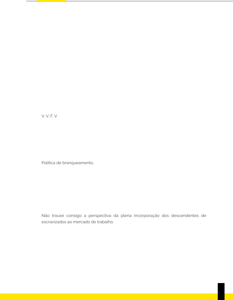 1. A respeito da discussão sobre raça, analise as a昀椀rmativas a seguir e assinale (V) para a(s) Verdadeira(s) e (F) para a(s) Falsa(s): I - No século XIX, circulavam teorias racistas consideradas ciência. II - As raças eram hierarquizadas a partir de diferenças fenotípicas, e os brancos consideravam-se os superiores. III - Essas diferenças e hierarquias foram comprovadas cienti昀椀camente. IV - As raças indígena e negra eram consideradas pelos brancos as piores. As a昀椀rmativas I, II, III e IV são, respectivamente: a) F, F, V, V. b) V, F, V, F. c) F, F, F, F. d) V, V, V, V. e) V, V, F, V. 2. Qual foi a solução encontrada pela elite intelectual e política para superar o então considerado “problema racial” daquele momento? a) Mestiçagem. b) Imigração de povos estrangeiros de qualquer lugar. c) Política de branqueamento. d) Extermínio da população negra. e) Elevação do indígena como símbolo cultural brasileiro. 3. Considerando o 昀椀m do sistema escravista no Brasil, assinale a alternativa correta: a) Não impôs a alteração do regime jurídico dos antigos escravizados. b) Foi acompanhada de uma profunda mudança nos poderes político e econômico. c) Não trouxe consigo a perspectiva da plena incorporação dos descendentes de escravizados ao mercado de trabalho. d) Representa uma revolução democrática. e) Corroborou com as aspirações da população afrodescendente. AUTOATIVIDADE 3 9 Evelyn Evelyn Evelyn 1. No debate sobre a formação do povo brasileiro, os intelectuais discorreram sobre três aspectos fundamentais que constituíam a realidade brasileira que analisaram. Quais são esses aspectos? a) Clima, território e elite dominante. b) Diversidade cultural, meio ambiente e território. c) Clima e meio ambiente, diversidade étnica e processo histórico colonial. d) Meio ambiente, sociedade patriarcal e catolicismo. e) Nenhuma das alternativas anteriores. 2. Em relação às convergências dos estudos clássicos do pensamento brasileiro, analise as a昀椀rmativas a seguir: I - O clima e o meio ambiente tropical eram descritos como elementos propícios à formação do cidadão brasileiro. II - A diversidade racial possibilitava fazer do Brasil um país racional de modo peculiar. III - O passado colonial gerou uma sociedade atrasada em relação ao ideal de nação. IV - O clima dos trópicos amolecia o ser humano e di昀椀cultava o desenvolvimento racional. É correto o que se a昀椀rma em: a) Apenas I e II. b) Apenas II e III. c) Apenas I. d) Apenas II, III e IV. e) Apenas III e IV. 3. O campo do pensamento social brasileiro é tributário de um amplo debate. Assinale a alternativa que corresponde aos elementos formadores desse campo: a) Intelectuais brasileiros. b) Intelectuais orientados pela ciência europeia. c) Intelectuais da literatura, das artes e da ciência. d) Intelectuais vinculados à política. e) Nenhuma das alternativas anteriores. AUTOATIVIDADE 7 1 Evelyn Evelyn Evelyn 1. No século XIX, o Brasil passou por diferentes processos políticos que indicavam os con昀氀itos do período. Apresente brevemente esse contexto e explique como isso repercute no ideal de nacionalismo. 2. A história do Brasil converge para uma sociedade cuja identidade nacional é marcada pela diversidade, fator que torna complexa a tarefa de levar o país à modernidade pretendida pela elite no 昀椀nal do século XIX. A complexidade mencionada no enunciado se deve: I - Ao Brasil colonial e sua herança escravista. II - Às diferentes interpretações sobre a realidade social. III - À tentativa de adequar o Brasil, tão diverso, ao modelo europeu. IV - Ao fato de que os intelectuais assumem engajamento político. É correto o que se a昀椀rma em: a) Apenas I e II. b) Apenas II e III. c) Apenas I e III. d) Apenas I, II e III. e) Apenas II, III e IV. AUTOATIVIDADE 9 5 Evelyn 3. Considerando a efervescência intelectual do século XIX no Brasil, a literatura tem grande importância para a valorização da questão nacional, que impulsionou o projeto de nação brasileira. Considerando a temática apresentada no enunciado, analise as a昀椀rmativas a seguir e assinale (V) para a(s) Verdadeira(s) e (F) para a(s) Falsa(s): I - O Romantismo e o Modernismo, no Brasil, contribuíram para a disseminação da cultura nacional no país. II - O Romantismo impulsionou a questão nacional, ao rechaçar o que vinha de fora e elogiar o que era interno, buscando compor um herói nacional em um indígena imaginado. III - O Modernismo compõe um cenário político no Brasil, fomentando ideias nacionalistas e intelectuais engajados. As a昀椀rmativas I, II e III são, respectivamente: a) V, V, F. b) F, F, V. c) V, F, V. d) F, F, F. e) V, V, V AUTOATIVIDADE 9 6 Evelyn 1. Considerando o tema relativo à vizinhança trabalhado por Willems, é correto a昀椀rmar que: a) A condição social não in昀氀ui nos laços vicinais. b) Dentre as classes mais elevadas, essas relações acontecem com mais solidez, pois o padrão de vida as aproxima. c) Dentre as classes trabalhadoras, essas relações acontecem com mais facilidade. d) A condição social não in昀氀ui nas relações vicinais. e) As relações não têm in昀氀uência para a compreensão do espaço urbano. 2. Cada integrante da confraria só pode receber o deus ao qual está ligado pelos ritos de iniciação. Certo número de casos excepcionais pode, contudo, suceder, e deles diremos algumas palavras (BASTIDE, 1961). Considerando o texto-base apresentado, assinale a alternativa correta: a) Para Bastide, os aspectos mais importantes no estudo do candomblé são o histórico e o cultural. b) Bastide investiga somente o aspecto místico do candomblé. A sociologia do estudioso se caracteriza por esse aspecto. c) No estudo do candomblé, Bastide não considera as manifestações corporais. d) Para Bastide, os aspectos mais relevantes no estudo do candomblé são os transes e as manifestações corporais. e) B