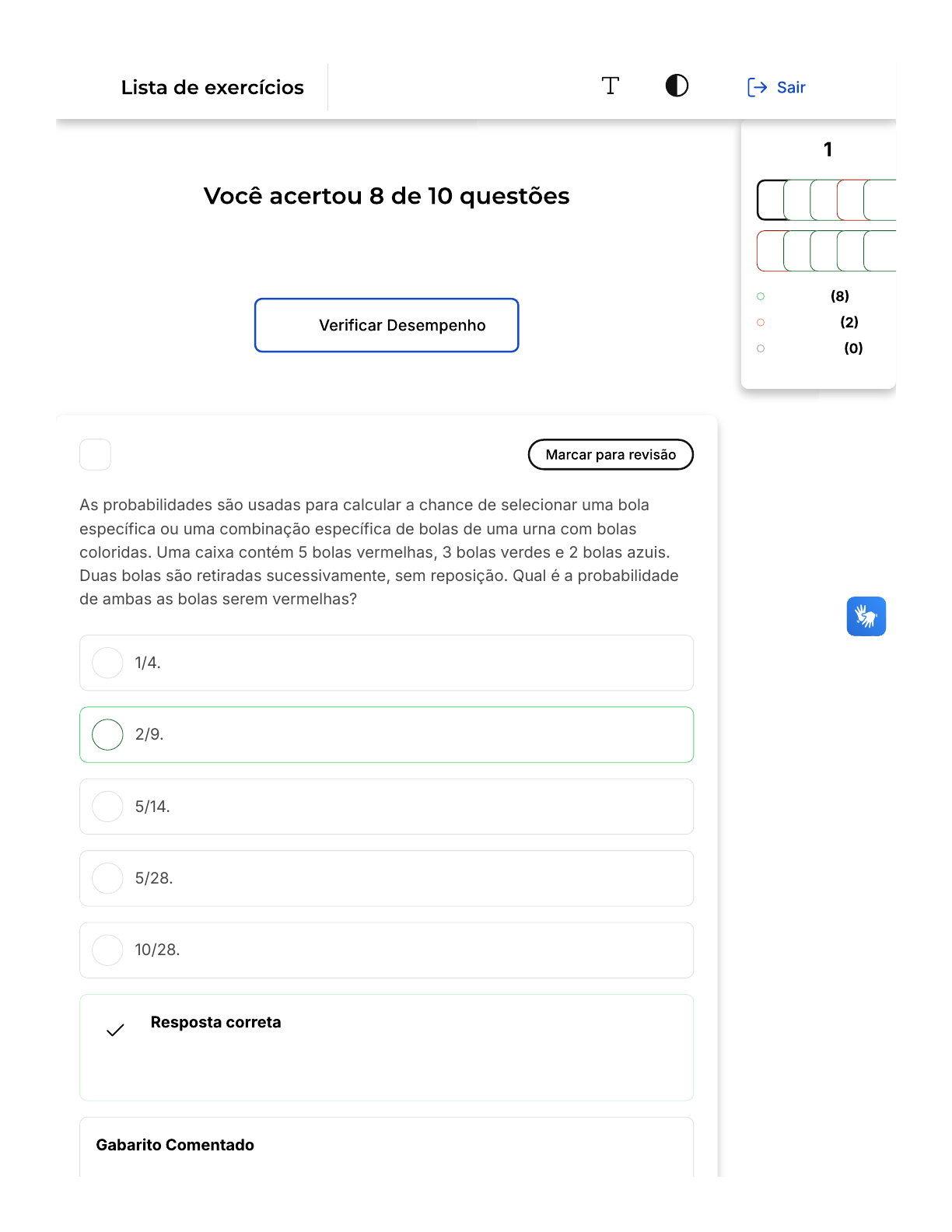 Verifique o seu desempenho e continue treinando! Você pode refazer o exercício quantas vezes quiser. A B C D E 1 As probabilidades são usadas para calcular a chance de selecionar uma bola específica ou uma combinação específica de bolas de uma urna com bolas coloridas. Uma caixa contém 5 bolas vermelhas, 3 bolas verdes e 2 bolas azuis. Duas bolas são retiradas sucessivamente, sem reposição. Qual é a probabilidade de ambas as bolas serem vermelhas? 1/4. 2/9. 5/14. 5/28. 10/28. Parabéns, você selecionou a alternativa correta. Confira o gabarito comentado! Questão de 10 Corretas Incorretas Em branco 1 2 3 4 5 6 7 8 9 10 Probabilidades Firefox https://estacio.saladeavaliacoes.com.br/exercicio/681d3ddfd5dd6a68e3... 1 of 10 14/05/2025, 21:07 A B C D E A probabilidade de selecionar uma bola vermelha na primeira retirada é 5/10, e na segunda retirada é 4/9 (já que não há reposição). Portanto, a probabilidade de ambas as bolas serem vermelhas é �5/10) x �4/9� = 20/90, que pode ser simplificado para 2/9. 2 A taxação de determinados valores de coberturas irá depender da probabilidade de estes ocorrerem. Uma seguradora oferece um seguro de vida que paga uma indenização de R$ 500.000 em caso de morte acidental. Com base em dados estatísticos, a probabilidade de uma pessoa falecer em um determinado período é de 0,02%. Qual é o valor esperado dessa cobertura de seguro? R$ 500. R$ 1.000. R$ 100. R$ 10.000. R$ 100.000. Parabéns, você selecionou a alternativa correta. Confira o gabarito comentado! O valor esperado é calculado multiplicando o valor da indenização pelo valor da probabilidade. Neste caso, o cálculo seria R 100. Portanto, a resposta correta é R$ 100. 500.000multiplicadopor0, 0002, oqueresultaemR Firefox https://estacio.saladeavaliacoes.com.br/exercicio/681d3ddfd5dd6a68e3... 2 of 10 14/05/2025, 21:07 A B C D E 3 Um torneio será disputado por 4 tenistas (entre os quais A e B) de mesma habilidade, isto é, em qualquer jogo entre 2 dos 4 jogadores, ambos têm a mesma chance de ganhar. Na primeira rodada, eles se enfrentarão em 2 jogos, com adversários definidos por sorteio. Os vencedores disputarão a final. A probabilidade de que o torneio termine com A derrotando B na final é: 1/2 1/4 1/6 1/8 1/12 Parabéns, você selecionou a alternativa correta. Confira o gabarito comentado! A probabilidade de cada tenista vencer uma partida é de . Portanto, o tenista A tem de probabilidade de passar para a primeira fase e o tenista B também tem de probabilidade de passar para a primeira fase. No entanto, na primeira fase, podemos ter os seguintes confrontos: 1° caso: A enfrenta C B enfrenta D 2° caso: A enfrenta D B enfrenta C 3° caso: A enfrenta B 1 2 1 2 1 2 Firefox https://estacio.saladeavaliacoes.com.br/exercicio/681d3ddfd5dd6a68e3... 3 of 10 14/05/2025, 21:07 A B C D E C enfrenta D Portanto, para que A e B cheguem juntos à final, temos que considerar apenas dos casos, pois isso ocorre apenas nos casos 1° e 2°. Finalmente, a probabilidade de A vencer B é de , então a probabilidade total é: 2 3 1 2 . . . =1 2 1 2 2 3 1 2 1 12 4 Empresas frequentemente usam pesquisas de mercado para estimar a probabilidade de sucesso de um novo produto ou serviço, com base nas respostas dos consumidores em amostras representativas. Considere uma urna contém 4 bolas vermelhas, 3 bolas azuis e 5 bolas verdes. Qual é a probabilidade de selecionar uma bola azul? 1/3. 3/5. 1/4. 3/8. 4/9. Opa! A alternativa correta é a letra C. Confira o gabarito comentado! A probabilidade de selecionar uma bola azul é o número de bolas azuis dividido pelo número total de bolas na urna. Portanto, a resposta correta é 3/12, que pode ser simplificado para 1/4. Firefox https://estacio.saladeavaliacoes.com.br/exercicio/681d3ddfd5dd6a68e3... 4 of 10 14/05/2025, 21:07 A B C D E 5 Ao jogar um jogo de cartas como o pôquer, as probabilidades são usadas para calcular a chance de obter uma determinada mão, como um flush ou uma sequência. Um dado justo é lançado. Qual é a probabilidade de obter um número primo? 1/2. 1/3. 2/3. 1/6. 2/6. Parabéns, você selecionou a alternativa correta. Confira o gabarito comentado! Um dado justo possui 6 faces, com os números 1, 2, 3, 4, 5 e 6. Dentre esses números, apenas os números 2, 3 e 5 são primos. Portanto, a probabilidade de obter um número primo é 3 (número de primos) dividido por 6 (número total de resultados possíveis), que resulta em 1/2. 6 Um dado não viciado, com a forma de um cubo e com as faces numeradas de 1 até 6, foi lançado 3 vezes. Sabendo que a soma dos resultados obtidos foi igual a 5, qual é a probabilidade de o resultado do segundo lançamento do dado ter sido igual a 2? Firefox https://estacio.saladeavaliacoes.com.br/exercicio/681d3ddfd5dd6a68e3... 5 of 10 14/05/2025, 21:07 A B C D E A 1/18 1/6 1/5 1/3 1/2 Opa! A alternativa correta é a letra D. Confira o gabarito comentado! Existem 6 casos de lançamentos cuja soma dos números é 5� �1, 2, 2� , �2, 1, 2�, �2, 2, 1�, �1, 1, 3�, �3, 1, 1) e �1, 3, 1�. Dessas 6 possibilidades, duas apresentam o segundo número sendo 2. Logo, a probabilidade é 2/6 � 1/3. 7 Uma prova consta de 35 questões do tipo múltipla escolha, com 5 opções cada uma, onde apenas uma opção é verdadeira. Um candidato que não sabe resolver nenhuma das questões vai respondê-las aleatoriamente. Ele sabe que as respostas certas das 35 questões estão distribuídas igualmente entre as opções A, B, C, D e E. Então, resolve marcar suas respostas seguindo este critério: escolherá aleatoriamente 7 questões para marcar a opção A, outras 7 para a opção B, e assim sucessivamente. A probabilidade de ele acertar todas as questões é: 1/35! Firefox https://estacio.saladeavaliacoes.com.br/exercicio/681d3ddfd5dd6a68e3... 6 of 10 14/05/2025, 21:07 B C D E 7.5!/35! 5.7!/35! (7!)5/35! (5!)7/35! Parabéns, você selecionou a alternativa correta. Confira o gabarito com