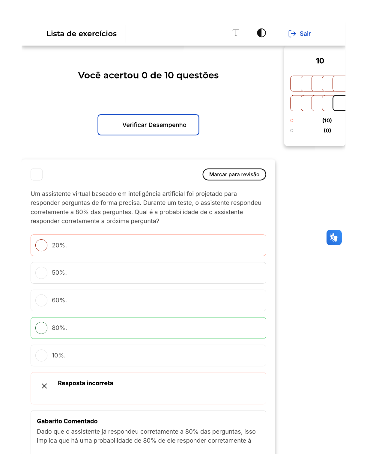 Verifique o seu desempenho e continue treinando! Você pode refazer o exercício quantas vezes quiser. A B C D E 1 Um assistente virtual baseado em inteligência artificial foi projetado para responder perguntas de forma precisa. Durante um teste, o assistente respondeu corretamente a 80% das perguntas. Qual é a probabilidade de o assistente responder corretamente a próxima pergunta? 20%. 50%. 60%. 80%. 10%. Opa! A alternativa correta é a letra D. Confira o gabarito comentado! Dado que o assistente já respondeu corretamente a 80% das perguntas, isso implica que há uma probabilidade de 80% de ele responder corretamente à Questão de 10 Incorretas Em branco 1 2 3 4 5 6 7 8 9 10 Probabilidades Firefox https://estacio.saladeavaliacoes.com.br/exercicio/6818280dd3a4307e0... 1 of 10 14/05/2025, 21:06 A B C D E próxima pergunta. Portanto, a resposta correta é 80%. 2 As probabilidades são usadas para calcular a chance de selecionar uma bola específica ou uma combinação específica de bolas de uma urna com bolas coloridas. Uma caixa contém 5 bolas vermelhas, 3 bolas verdes e 2 bolas azuis. Duas bolas são retiradas sucessivamente, sem reposição. Qual é a probabilidade de ambas as bolas serem vermelhas? 1/4. 2/9. 5/14. 5/28. 10/28. Opa! A alternativa correta é a letra B. Confira o gabarito comentado! A probabilidade de selecionar uma bola vermelha na primeira retirada é 5/10, e na segunda retirada é 4/9 (já que não há reposição). Portanto, a probabilidade de ambas as bolas serem vermelhas é �5/10) x �4/9� = 20/90, que pode ser simplificado para 2/9. 3 Em um grupo de 200 adultos, 130 são do sexo masculino. Das mulheres desse grupo, 40% são casadas. Entre essas 200 pessoas, 94 delas não são casadas. Ao Firefox https://estacio.saladeavaliacoes.com.br/exercicio/6818280dd3a4307e0... 2 of 10 14/05/2025, 21:06 A B C D E escolher aleatoriamente 1 desses adultos, qual é a probabilidade de que ele seja um homem, sabendo que o adulto sorteado é casado? 3/5. 13/20. 14/39. 14/53. 39/53. Opa! A alternativa correta é a letra E. Confira o gabarito comentado! No grupo de 200 adultos, temos 130 homens e 70 mulheres. Como 40% das mulheres são casadas, temos 28 mulheres casadas. Como 94 pessoas não são casadas, temos 106 pessoas casadas �200 � 94�. Dentre os homens, 78 são casados �130 � 52�, pois 52 são solteiros �200 � 106 � 28 mulheres casadas). Portanto, se o adulto sorteado é casado, a probabilidade de ser homem é de 78/106, que simplificado resulta em 39/53. 4 O gráfico a seguir mostra, em percentuais, a distribuição do número de mulheres de 15 anos ou mais de idade, segundo o número de filhos, no Brasil: Firefox https://estacio.saladeavaliacoes.com.br/exercicio/6818280dd3a4307e0... 3 of 10 14/05/2025, 21:06 A B C D E A B Selecionando aleatoriamente 1 filho dessa população, a probabilidade de que ele seja filho único é, aproximadamente: 17/55. 17/71. 17/100. 17/224. 17/1000. Opa! A alternativa correta é a letra C. Confira o gabarito comentado! A resposta correta é: 17/100. Interpretação direta do gráfico. A probabilidade de que um filho seja filho único é igual à proporção de mulheres com 1 filho, ou seja, 17%, que corresponde a 17/100. 5 Uma aplicação prática de probabilidades está seleção de pessoas dentro de um universo de possibilidades. Uma sala possui 15 alunos, dos quais 8 são mulheres e 7 são homens. Se um aluno é selecionado aleatoriamente, qual é a probabilidade de ser um homem? 1/2. 7/8. Firefox https://estacio.saladeavaliacoes.com.br/exercicio/6818280dd3a4307e0... 4 of 10 14/05/2025, 21:06 C D E A B C D E 7/15. 8/15. 8/7. Opa! A alternativa correta é a letra C. Confira o gabarito comentado! A probabilidade de selecionar um homem é o número de homens dividido pelo número total de alunos na sala. Portanto, a resposta correta é 7/15. 6 Ao jogar um jogo de cartas como o pôquer, as probabilidades são usadas para calcular a chance de obter uma determinada mão, como um flush ou uma sequência. Um dado justo é lançado. Qual é a probabilidade de obter um número primo? 1/2. 1/3. 2/3. 1/6. 2/6. Firefox https://estacio.saladeavaliacoes.com.br/exercicio/6818280dd3a4307e0... 5 of 10 14/05/2025, 21:06 A B C D E Opa! A alternativa correta é a letra A. Confira o gabarito comentado! Um dado justo possui 6 faces, com os números 1, 2, 3, 4, 5 e 6. Dentre esses números, apenas os números 2, 3 e 5 são primos. Portanto, a probabilidade de obter um número primo é 3 (número de primos) dividido por 6 (número total de resultados possíveis), que resulta em 1/2. 7 A taxação de determinados valores de coberturas irá depender da probabilidade de estes ocorrerem. Uma seguradora oferece um seguro de vida que paga uma indenização de R$ 500.000 em caso de morte acidental. Com base em dados estatísticos, a probabilidade de uma pessoa falecer em um determinado período é de 0,02%. Qual é o valor esperado dessa cobertura de seguro? R$ 500. R$ 1.000. R$ 100. R$ 10.000. R$ 100.000. Opa! A alternativa correta é a letra C. Confira o gabarito comentado! O valor esperado é calculado multiplicando o valor da indenização pelo valor da probabilidade. Neste caso, o cálculo seria R 100. Portanto, a500.000multiplicadopor0, 0002, oqueresultaemR Firefox https://estacio.saladeavaliacoes.com.br/exercicio/6818280dd3a4307e0... 6 of 10 14/05/2025, 21:06 A B C D E resposta correta é R$ 100. 8 Uma urna contém 10 bolas numeradas de 1 a 10. Foram sacadas, sucessivamente com reposição, 2 dessas bolas. A probabilidade de a primeira bola ter um número par e a segunda ter um número múltiplo de 5 é igual a: 1/20 1/18 7/90 1/10 1/9 Opa! A alternativa correta é a letra D. Confira o gabarito comentado! A probabilidade de a A probabilidade de a Como os eventos são independentes (devido à reposição), a probabilidade conjunta de a e a é o produto das probabilidades individuais: P(Primeira bola par) = = = Números pares Total de bola