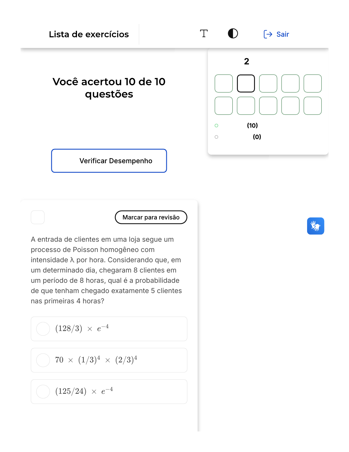 Verifique o seu desempenho e continue treinando! Você pode refazer o exercício quantas vezes quiser. A B C 1 A entrada de clientes em uma loja segue um processo de Poisson homogêneo com intensidade λ por hora. Considerando que, em um determinado dia, chegaram 8 clientes em um período de 8 horas, qual é a probabilidade de que tenham chegado exatamente 5 clientes nas primeiras 4 horas? (128/3) × e−4 70 × (1/3)4 × (2/3)4 (125/24) × e−4 Questão de 10 Corretas Em branco 1 2 3 4 5 6 7 8 9 10 Variáveis… Firefox https://estacio.saladeavaliacoes.com.br/exercicio/68210df9a863e464b0... 1 of 17 14/05/2025, 21:16 D E (256/30) × e−4 3003 × (1/2)15 Parabéns, você selecionou a alternativa correta. Confira o gabarito comentado! A probabilidade de um evento em um processo de Poisson é dada pela fórmula , onde é a taxa média de ocorrência do evento e k é o número de ocorrências do evento. Neste caso, a taxa média de chegada de clientes é de 1 cliente por hora �8 clientes em 8 horas). Portanto, a probabilidade de que exatamente 5 clientes cheguem nas primeiras 4 horas é dada por X = k = e−λλk k! λ P(X = 5) = = 3003 × (1/2)15e−445 5! 2 Um estudante marca, ao acaso, as respostas de um teste de 10 questões de múltipla escolha, com 4 alternativas por questão. O número mais provável de acertos é: Firefox https://estacio.saladeavaliacoes.com.br/exercicio/68210df9a863e464b0... 2 of 17 14/05/2025, 21:16 A B C D E 1. 2. 3. 4. 5. Parabéns, você selecionou a alternativa correta. Confira o gabarito comentado! Para calcular o número mais provável de acertos em um teste de múltipla escolha com 10 questões, cada uma com 4 alternativas, você pode usar a distribuição binomial. A distribuição binomial modela a probabilidade de sucesso (acerto) ou fracasso (erro) em cada tentativa independente. Nesse caso, a probabilidade de acertar cada questão é de 1/4, já que há 4 alternativas e apenas uma delas é a correta. A média (valor esperado) de acertos em um teste binomial pode ser calculada usando a fórmula: Firefox https://estacio.saladeavaliacoes.com.br/exercicio/68210df9a863e464b0... 3 of 17 14/05/2025, 21:16 A B Média = n * p onde: • n é o número de tentativas (neste caso, 10 questões). • p é a probabilidade de sucesso em cada tentativa (neste caso, 1/4�. Média = 10 * �1/4� = 10/4 � 2,5 Portanto, o número mais provável de acertos é 2,5. No entanto, como não é possível ter um número fracionário de acertos em um teste real, arredondamos para o valor inteiro mais próximo. Nesse caso, o número mais provável de acertos é 2. 3 Um fabricante de brinquedos realiza testes de qualidade em seus produtos. Durante o processo de produção, há uma probabilidade de 0,2 de um brinquedo ser considerado defeituoso. Considerando a importância da distribuição binomial, qual das alternativas abaixo melhor representa a natureza dessa distribuição nesse contexto? Número total de brinquedos produzidos pela empresa. Cor da embalagem utilizada para os brinquedos. Firefox https://estacio.saladeavaliacoes.com.br/exercicio/68210df9a863e464b0... 4 of 17 14/05/2025, 21:16 C D E Probabilidade de um brinquedo ser selecionado aleatoriamente para o teste de qualidade. Identificação única de cada brinquedo produzido. Média aritmética da quantidade de brinquedos defeituosos encontrados nos testes. Parabéns, você selecionou a alternativa correta. Confira o gabarito comentado! A distribuição binomial é aplicada quando há um experimento com um número fixo de tentativas independentes, cada uma com dois resultados possíveis, sucesso ou fracasso. No contexto do fabricante de brinquedos realizando testes de qualidade, a distribuição binomial é utilizada para analisar a quantidade de brinquedos defeituosos encontrados nos testes. A média aritmética dessa quantidade é um indicador importante para a qualidade dos produtos e representa a natureza dessa distribuição nesse contexto. Portanto, a alternativa “Média aritmética da quantidade de brinquedos defeituosos encontrados nos testes.” é a correta, pois está relacionada à aplicação da distribuição binomial para calcular a média da Firefox https://estacio.saladeavaliacoes.com.br/exercicio/68210df9a863e464b0... 5 of 17 14/05/2025, 21:16 A quantidade de brinquedos defeituosos nos testes de qualidade, de acordo com a definição e as características dessa distribuição. 4 Um restaurante popular em uma cidade recebe diariamente um grande número de clientes para suas refeições. A administração está interessada em estudar a ocorrência de um evento específico: o número de vezes que um cliente derruba um utensílio durante o horário do almoço. O processo de Poisson é utilizado para modelar esse evento, considerando que ele ocorre em intervalos contínuos de tempo. Qual dos seguintes exemplos se encaixa como um processo de Poisson? I. Número de acidentes de trânsito por mês em uma cidade. II. Número de encomendas online recebidas por hora em uma loja virtual. III. Número de pacotes de correspondência extraviados por dia em um centro de distribuição. IV. Número de gols marcados por partida em um campeonato de futebol. V. Número de erros ortográficos por página em um livro. É correto o que se afiram afirma apenas em: I, II e III. Firefox https://estacio.saladeavaliacoes.com.br/exercicio/68210df9a863e464b0... 6 of 17 14/05/2025, 21:16 B C D E II, IV e V. III, IV e V I, II, III e V. I, II, III e IV. Parabéns, você selecionou a alternativa correta. Confira o gabarito comentado! O processo de Poisson é aplicado quando eventos discretos ocorrem em intervalos contínuos. Nos exemplos I, II, III e V, os eventos mencionados podem ocorrer em intervalos contínuos de tempo ou em uma área específica, seguindo a natureza do processo de Poisson. No entanto, o número de gols marcados por partida em um campeonato de futebol não é adequado para ser modelado por um processo de Po