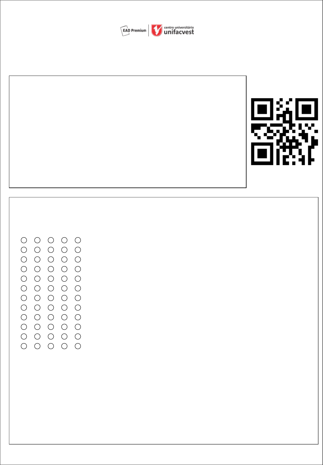 Requisição: 8401918 Matricula: 901196 Data: 23/05/2025 07:28 Página: 1/4 Prova presencial regular Curso: 12 MESES - SEGUNDA LICENCIATURA EM CIÊNCIAS BIOLÓGICAS - UNIFACVEST EAD Módulo: 1 Grupo: 248 Disciplina(s): 102964 - BIOLOGIA MOLECULAR Nome: 901196 - VANUZA DOS REIS DIAS BARBOSA Município: SETE LAGOAS - MG Data: ___/___/_________ Hora:___:___:___ Assinatura do aluno: ________________________________________________________ Preencha o gabarito assinalando por completo o campo de resposta. Atente para a coluna de numeração e das alternativas. A B C D E 1 2 3 4 5 6 7 8 9 10 11 12 Requisição: 8401918 Matricula: 901196 Data: 23/05/2025 07:28 Página: 2/4 1 ) Sobre o uso de marcadores moleculares na identificação humana, assinale a alternativa correta. A ) Para ensaios com o marcador STR, cinco loci são suficientes para uma identificação assertiva. B ) Testes de identificação criminal utilizam o marcador molecular STR devido à sua rapidez e reprodutibilidade. C ) A amelogenina é utilizada como um dos loci alvo da STR pela sua capacidade em fornecer informações sobre a idade dos indivíduos. D ) Para avaliar com segurança a probabilidade de paternidade por meio dos marcadores moleculares, basta utilizar o DNA do filho e do suposto pai. E ) O marcador STR, utilizado na identificação humana, evidencia a presença de genes associados a patologias ou a características físicas do indivíduo. 2 ) Sobre as diferenças entre as genéticas clássica e molecular, assinale a alternativa correta. A ) A genética clássica baseia-se nas características observáveis dos indivíduos, e a genética molecular, nos mecanismos bioquímicos por trás dessas características. B ) A genética clássica tem como objeto de estudo os processos bioquímicos da hereditariedade, e a genética molecular estuda a molécula de DNA. C ) Ambas - a genética clássica e a molecular - apresentam o mesmo objeto de estudo: os mecanismos de produção de proteínas no interior das células. D ) A genética clássica era o nome utilizado antes da descoberta da função e da estrutura do DNA, a partir do que passou a ser denominada genética molecular. E ) A genética molecular também pode ser denominada genética mendeliana devido à influência dos estudos de Mendel no desenvolvimento dessa ciência. 3 ) Versões dos genes produzidos a partir de mutações nas sequências de DNA, atribuem características distintas a organismos, dependendo da sua quantidade nos cromossomos. Assinale a alternativa que menciona corretamente a que a sentença se refere. A ) Cromossomos B ) RNA C ) Alelos D ) Genoma E ) Nucleotídeos 4 ) Assinale a alternativa correta: No início de 1970, o desenvolvimento do marcador molecular RFLP (polimorfismo de comprimento de fragmento de restrição) inovou a biologia molecular ao permitir a diferenciação entre indivíduos ou entre grupos taxonômicos. Sobre essa técnica, assinale a alternativa correta. A ) Pela técnica RFLP, é possível distinguir entre indivíduos homozigotos ou heterozigotos para determinada característica. B ) As enzimas de restrição reconhecem um determinado sítio de restrição no DNA alvo mesmo se houver uma deleção ou mutação nessa região. C ) Todas as endonucleases de restrição reconhecem como sítio de clivagem a sequência GAATTC. D ) Por ser um marcador molecular robusto, é possível realizar a análise mesmo com amostras de DNA degradado. E ) O RFLP deve ser realizado utilizando-se uma endonuclease por vez, não sendo indicado o uso de uma combinação dessas enzimas. Requisição: 8401918 Matricula: 901196 Data: 23/05/2025 07:28 Página: 3/4 5 ) É um dos códons de parada da tradução, promovendo a terminação da síntese polipeptídica e a liberação da proteína formada. Essa definição se refere a qual sequência? A ) UAA B ) AUU C ) CUA D ) CGC E ) AGG 6 ) Assinale a alternativa correta. Atributo definido por dois ou mais genes, cujos efeitos aditivos resultam em diversos fenótipos distintos. Trata-se de uma característica: A ) recessiva. B ) intermediária. C ) dominante. D ) multialélica. E ) polialélica. 7 ) Qual é a molécula responsável pela clivagem (corte) da sequência alvo de DNA na técnica de edição de genes CRISPR/Cas9? A ) RNA guia (sgRNA) B ) microRNA C ) Enzima Cas9 D ) Enzima EcoRI E ) RNA transativador de CRISPR (transcrRNA) 8 ) Local no ribossomo em que o RNA de transferência se liga inicialmente, trazendo consigo o aminoácido correspondente ao códon a ser lido. Como é denominado esse local de entrada do tRNA no ribossomo? Assinale a alternativa correta. A ) Iniciador B ) Promotor C ) Sítio A D ) Sítio P E ) Sítio E 9 ) Assinale a alternativa que completa corretamente a sentença a seguir. A tecnologia sempre andou junto com a ciência, e a evolução em equipamentos para identificação biológica auxiliou na descoberta de inúmeras estruturas, como a do DNA. Nesse caso, a técnica utilizada, que permitiu identificar a dupla hélice dessa molécula, foi _______________________. A ) cromatografia gasosa B ) Reação em Cadeia da Polimerase C ) eletroforese em poliacrilamida Requisição: 8401918 Matricula: 901196 Data: 23/05/2025 07:28 Página: 4/4 D ) cristalografia de raios X E ) espectrometria de massas 10 ) Processo a partir do qual o DNA é duplicado, produzindo várias cópias de si mesmo. A que essa definição se refere? Assinale a alternativa correta. A ) Replicação B ) Dobramento C ) Codificação D ) Tradução E ) Transcrição 11 ) Durante a síntese proteica, uma molécula de RNA tem um papel fundamental: transportar os aminoácidos corretos para a cadeia nascente de proteína. Como é denominado esse RNA responsável por reconhecer o códon relacionado ao aminoácido que ele carrega? A ) RNA de interferência B ) RNA ribossomal C ) Micro RNA D ) RNA mensageiro E ) RNA de transferência 12 ) Sobre as estruturas primária, secundária e terciária da molécula de DNA, assinale