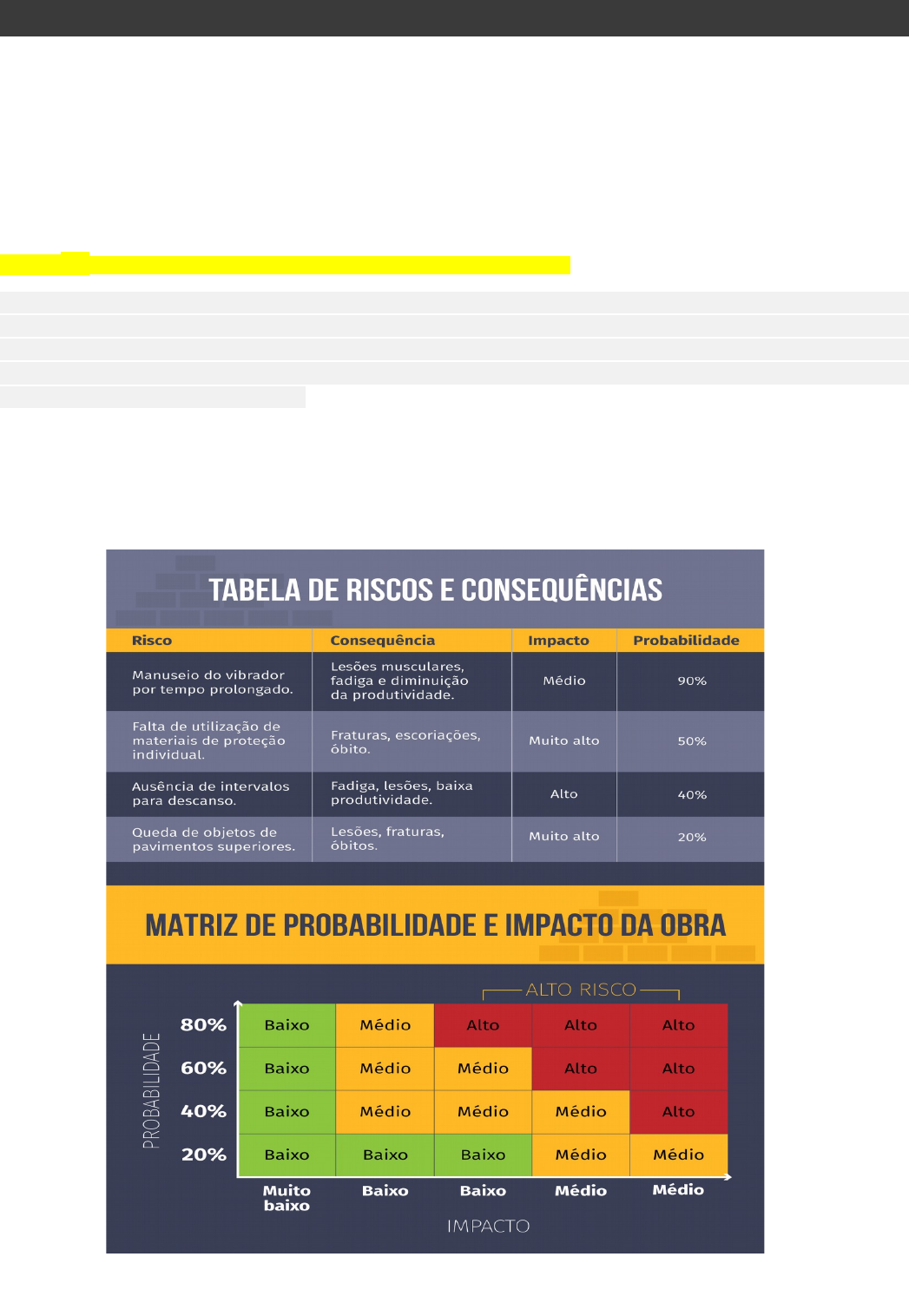 ANÁLISE DE RISCOS NA CONSTRUÇÃO CIVIL - F 1-1 Riscos na gestão de obras 1. A elaboração da matriz de riscos para uma obra comumente passa por quatro etapas: identificação, análise, resposta e monitoramento dos riscos. Na fase de identificação de riscos, é importante saber diferenciar risco e consequência, um erro comum nessa etapa. Escolha a opção que apresente corretamente um risco e sua consequência, respectivamente. RESP: B. Variação do preço de importação / Aumento do custo da obra. O risco se caracteriza como ameaça à obra, algo que pode ou não acontecer, enquanto a consequência é o fator que de fato pesa negativamente e prejudica a obra, ocorrendo quando o risco se concretiza. A variação do preço de importação é uma ameaça à obra, algo que pode ou não acontecer, e o aumento do custo da obra é o prejuízo real a que a obra estará sujeita caso ocorra o aumento de preços de importação. 2. A concretagem de peças em obras de construção civil é uma rotina comum. Veja a seguir uma lista de riscos e consequências dessa atividade. Agora imagine que você é o gestor de uma obra e realizou a análise desses riscos, identificando suas probabilidades de acontecer e seus impactos, presentes na mesma tabela. A partir da matriz de probabilidade e impacto da obra, responda: qual, ou quais, pode ser classificado como sendo de alto risco para a obra? RESP: A. Manuseio do vibrador por tempo prolongado e falta de utilização de materiais de proteção individual. Classificando cada risco conforme a matriz de probabilidade e impacto, pode-se perceber que as atividades de manuseio do vibrador por tempo prolongado e a falta de utilização de materiais de proteção individual são de alto risco para a obra. 3. Na construção civil, as contratações podem ser regidas pelo Código Civil ou pela Consolidação das Leis do Trabalho (CLT). Qual é a diferença entre estes? RESP: E. O Código Civil regula as contratações de direito privado, como contratos de empreitada, prestação de serviços e terceirizações, enquanto a CLT regula os contratos de trabalho que necessitam carteira de trabalho e previdência social. O Código Civil regula contratações de direito privado, como contratos de empreitada, prestação de serviços e terceirizações, estas últimas contando também com regulamentações específicas. As contratações regidas pela CLT, por sua vez, são voltadas aos trabalhos que necessitam carteira de trabalho e previdência social. 4. Você é gestor da obra de uma barragem de terra e sua empresa terceirizou os serviços de compactação de solo. No total são 20 trabalhadores terceirizados trabalhando na sua obra. Porém, durante os serviços, a empresa terceirizada não consegue mais pagar os 20 trabalhadores que estão em sua obra, nem sua previdência social. Nesse caso, quem ficará responsável pelas despesas e responsabilidades trabalhistas dos 20 operários? RESP: D. A sua empresa, pois pela lei da terceirização a empresa tomadora é subsidiariamente responsável pelos débitos trabalhistas. Pela lei da terceirização, a empresa tomadora tem responsabilidade subsidiária sobre as obrigações trabalhistas dos operários durante o período em que o trabalho está sendo realizado. Assim, se a empresa terceirizada não pode pagar seus trabalhadores, a empresa que contratou a empresa terceirizada deverá arcar com os prejuízos. 5. Você será gestor de uma obra de ampliação de uma universidade que foi construída recentemente. O projeto envolve, entre a construção de novos prédios, a criação de prédios anexos aos já existentes. Para realizar os projetos executivos, seu chefe lhe pede que busque o As Built da obra anterior, para que os projetistas saibam exatamente como a obra foi construída e possam prever as interferências entre os projetos. Onde você conseguirá o As Built? RESP: C. No órgão de registro da cidade. O As Built realizado no final da obra, que mostra como a obra foi realmente construída, deve ser averbado no órgão de registro da cidade em que a obra foi realizada. 1-2 Campos de aplicação da Gestão de Riscos 1. Assinale a alternativa que indica onde o gerenciamento de riscos pode ser aplicado nas organizações. RESP: A. Pode ser aplicado em todas as áreas das organizações, principalmente na estratégia, na governança e conformidade, nos ativos, nos projetos, nos processos, no ambiente unificado, na saúde, na segurança e no Meio Ambiente. Dentro de uma organização, pode-se aplicar o gerenciamento de riscos, entre outras áreas, na estratégia, na governança e conformidade, nos ativos, nos projetos, nos processos, no ambiente unificado, na saúde, na segurança e no Meio Ambiente. A abordagem integrada dos fatores de risco, considerando todas as áreas da organização, facilita o trabalho da gestão de riscos, pois as áreas trabalham de forma simultânea para produzir resultados melhores para todos, com um esforço menor do que seria necessário caso as áreas trabalhassem de forma isolada. 2. Por que é possível dizer que a gestão de riscos atua como fator profissionalizante dentro de uma organização? RESP: E. Porque os empregados e os gestores precisam estudar para entender os processos dos quais participam, a fim de poder levantar falhas e sugerir melhorias. O gerenciamento de riscos assume um efeito profissionalizante dentro das organizações porque os empregados e os gestores passam a estudar, a fim de entender os processos onde se encontram inseridos, para que possam descobrir possíveis falhas e diminuir ou eliminar perdas e prejuízos. 3. Assinale a alternativa que contém os elementos que compõem o perfil de riscos de uma organização. RESP: A. Apetite ao risco e tolerância ao risco. O perfil de riscos envolve o apetite ao risco, que traduz a quantidade de exposição ao risco aceitável pela organização, e a tolerância ao risco, que é o nível admitido para a variação 
