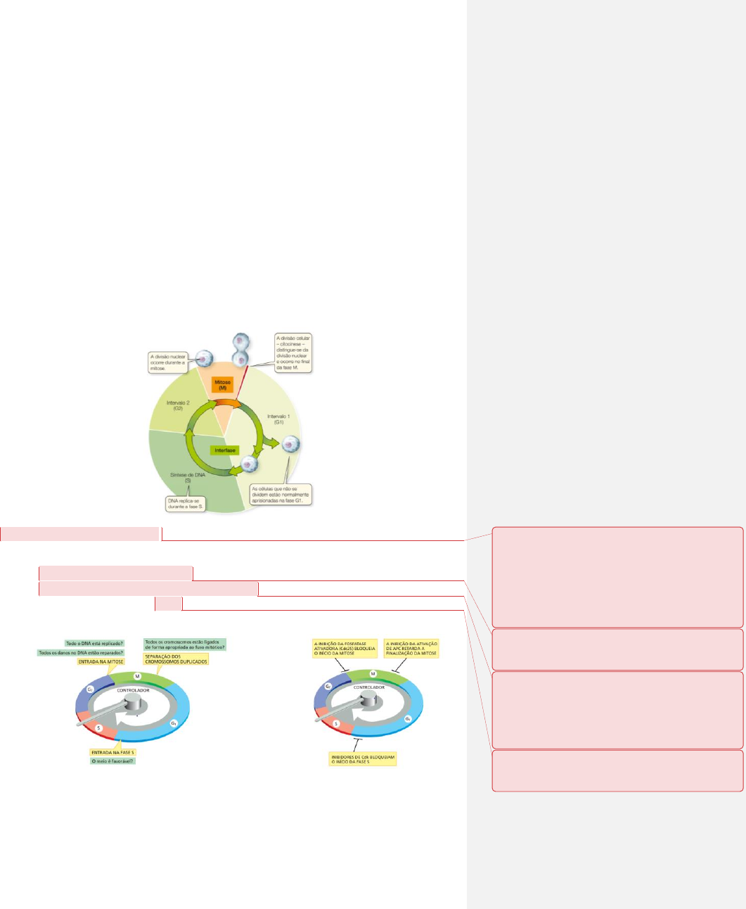 CICLO CELULAR Compreende todos os estágios de vida da célula, que comporta uma fase pré-divisão, ou intérfase, e uma fase de divisão, que pode ser a mitose ou a meiose. • É a partir desse mecanismo de duplicação e divisão celular que se pode ter a continuidade da vida • Esse processo permite que cada célula copie e passe sua informação genética para a próxima geração de células • Cromossomos homólogos advém da fecundação (1 da mãe e 1 do pai) • Todas as células têm o mesmo material genético, sendo a identidade e função dela determinada pela epigenética (que ativará ou desativará genes conforme sua diferenciação) • A célula menos diferenciada é a que mais se divide • As células precisam de um estímulo para se dividirem e se diferenciarem • As células que não se dividem mais estão em G0 REGULAÇÃO DO CICLO CELULAR • Ao fim de cada etapa tem-se a regulação do ciclo, que ocorre por retroalimentação • Sistema de controle do ciclo celular, com pontos de verificação • Proteínas cinases dependentes de ciclina (CDKs) (as cinases controlam os pontos de verificação (3) e são dependentes de ciclina) – estimulam a divisão à medida que permitem a transição das fases, mas são inibidas por alguns mecanismos também, como a supressão tumoral Comentado [IG1]: os tipos de maquinaria estão envolvidos na divisão celular: um produz os novos componentes da célula em crescimento, e o outro atrai os componentes para os seus locais corretos e os reparte apropriadamente quando a célula se divide em duas. O sistema de controle do ciclo celular ativa e inibe toda essa maquinaria nos momentos corretos e coordena as várias etapas do ciclo. Comentado [IG2]: Assim, o sistema de controle não aciona a próxima etapa no ciclo, a não ser que a célula esteja preparada apropriadamente Comentado [IG3]: As proteínas-cinase essenciais ao sistema de controle do ciclo celular estão presentes nas células em proliferação durante todo o ciclo celular. Contudo, elas são ativadas apenas em momentos apropriados no ciclo, após o qual elas são rapidamente inibidas Comentado [IG4]: um problema nas ciclinas que interfira na sua degradação pode gerar câncer, pois vai estimular a célula a se dividir descontroladamente INTÉRFASE • Momento em que o material genético da célula diploide (46 cromossomos) se duplica e são sintetizados os componentes fundamentais para a ocorrência da divisão celular • Maior tempo de vida celular • Pelo alto metabolismo nesta fase, há o consumo contínuo do nucléolo, motivo pelo qual ele é, de fato, “degradado” na prófase • Há a duplicação do centrossomo – centro organizador dos microtúbulos (citoesqueleto) • Nesta fase, o DNA se encontra majoritariamente desespiralizado (descondensado), para que possa ocorrer tradução de proteínas e afins • Na fase G1, a síntese é principalmente de proteínas essenciais para o processo de replicação, que se dará logo em seguida – elevada atividade metabólica, crescimento celular e reparo • Inicialmente, tem-se 46 moléculas de DNA, na fase S da intérfase esse número sobe para 92 moléculas, constituindo, de fato, a duplicação do DNA (fase controlada por S-Cdk) e formação das cromátides irmãs (unidas por coesinas) • Na fase G2, a síntese é principalmente de proteínas essenciais para a divisão – fuso do áster, por exemplo (controle do M-Cdk – permite ou não a ida para mitose) • O fuso mitótico é a maquinaria que divide os cromossomos duplicados e sua formação é induzida pelo complexo M-Cdk – tal mecanismo ocorre no final de G2 e força a entrada na fase mitótica MITOSE • O primeiro passo é a condensação dos cromossomos (por complexos proteicos chamados condensinas) • Os processos de mitose se dividem, mas entende-se que se comportam de modo que o início consiste na preparação para a divisão e o fim consiste na conclusão da divisão para dar “vida” à nova célula ativa Prófase • Há formação do fuso mitótico, apesar das proteínas desse fuso (microtúbulos) já terem sido sintetizadas na intérfase • Há o desaparecimento da carioteca para que os centrossomos/centríolos possam se organizar em polos opostos para separar as cromátides (polos do fuso) • há a desintegração do nucléolo • há a condensação dos cromossomos • Começa a organização equatorial dos cromossomos (prometáfase) Metáfase • há de fato a organização equatorial dos cromossomos • fase de condensação máxima dos cromossomos Anáfase • há a separação das cromátides irmãs para cada um dos lados opostos • rompimento das ligações de coesina • após a separação das cromátides irmãs, os cromossomos são agora puxados para os polos aos quais estão ligados Comentado [IG5]: Como esta é a fase que compreende maior parte da vida celular e, também, a de maior metabolismo, o DNA da célula vai estar descondensado, para facilitar os mecanismos de síntese. Do contrário, na divisão celular, a importância para a célula é que o compartilhamento aconteça de maneira igual, não havendo processos metabólicos nessa fase. Por isso, na divisão a célula está com material genético condensado. Além disso, se uma célula precisa se dividir, ela entra na fase S para duplicar. Se não precisa, ela fica na fase G0, como nos neurônios. Telófase • como a telófase é, de fato, a conclusão do processo de formação da nova célula ativa e funcional, tudo que ocorreu na prófase, ocorre o contrário aqui • há a dissociação do fuso mitótico • há o surgimento da carioteca a redor de cada conjunto de cromossomos filhos – origem de dois novos núcleos • há a descondensação dos cromossomos • há o aparecimento do nucléolo – já que os cromossomos voltam à atividade metabólica • há a clivagem do citoplasma em dois, dando origem às duas novas células filhas com materiais genét