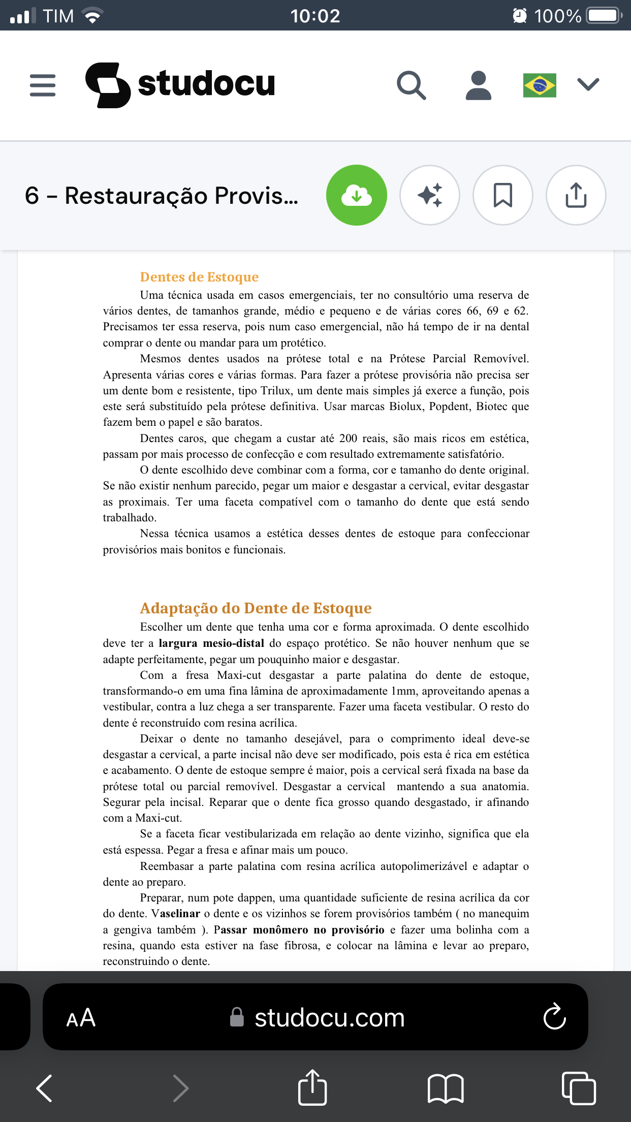 TIM 10:02 100% studocu 6 - Restauração Provis... Dentes de Estoque Uma técnica usada em casos emergenciais, ter no consultório uma reserva de vários dentes, de tamanhos grande, médio e pequeno e de várias cores 66, 69 e 62. Precisamos ter essa reserva, pois num caso emergencial, não há tempo de in na dental comprar o dente ou mandar para um protético. Mesmos dentes usados na prótese total e na Prótese Parcial Apresenta várias cores e várias formas. Para fazer a prótese provisória não precisa ser um dente bom e resistente, tipo Trilux, um dente mais simples já exerce a função, pois este será substituído pela prótese definitiva. Usar marcas Biolux, Popdent, Biotec que fazem bem o papel e são baratos. Dentes caros, que chegam a custar até 200 reais, são mais ricos em estética, passam por mais processo de confecção e com resultado extremamente satisfatório. dente escolhido deve combinar com a forma, e tamanho do dente original. Se não existir nenhum parecido, pegar um maior e desgastar a cervical, evitar desgastar as proximais. Ter uma faceta compatível com o tamanho do dente que está sendo trabalhado. Nessa técnica usamos a estética desses dentes de estoque para confeccionar provisórios mais bonitos e funcionais. Adaptação do Dente de Estoque Escolher um dente que tenha uma e forma aproximada. o dente escolhido deve ter a largura mesio-distal do espaço protético. Se não houver nenhum que se adapte perfeitamente, pegar um pouquinho maior e Com a fresa Maxi-cut desgastar a parte palatina do dente de estoque, transformando-o em uma fina lâmina de aproximadamente 1mm, aproveitando apenas a vestibular, contra a luz chega a ser transparente. Fazer uma faceta vestibular. resto do dente é reconstruído com resina acrílica. Deixar o dente no tamanho desejável, para o comprimento ideal deve-se desgastar a cervical, a parte incisal não deve ser modificado, pois esta é rica em estética e acabamento. dente de estoque sempre é maior, pois a cervical será fixada na base da prótese total ou parcial removível. Desgastar a cervical mantendo a sua anatomia. Segurar pela incisal. Reparar que o dente fica grosso quando desgastado, in afinando com a Maxi-cut. Se a faceta ficar vestibularizada em relação ao dente vizinho, significa que ela está espessa. Pegar a fresa e afinar mais um pouco. Reembasar a parte palatina com resina acrílica autopolimerizável e adaptar o dente ao preparo. Preparar, num pote dappen, uma quantidade suficiente de resina acrílica da cor do dente. Vaselinar o dente e os vizinhos se forem provisórios também ( no manequim a gengiva também ). Passar monômero no provisório e fazer uma bolinha com a resina, quando esta estiver na fase fibrosa, e colocar na lâmina e levar ao preparo, reconstruindo o dente. AA studocu.com