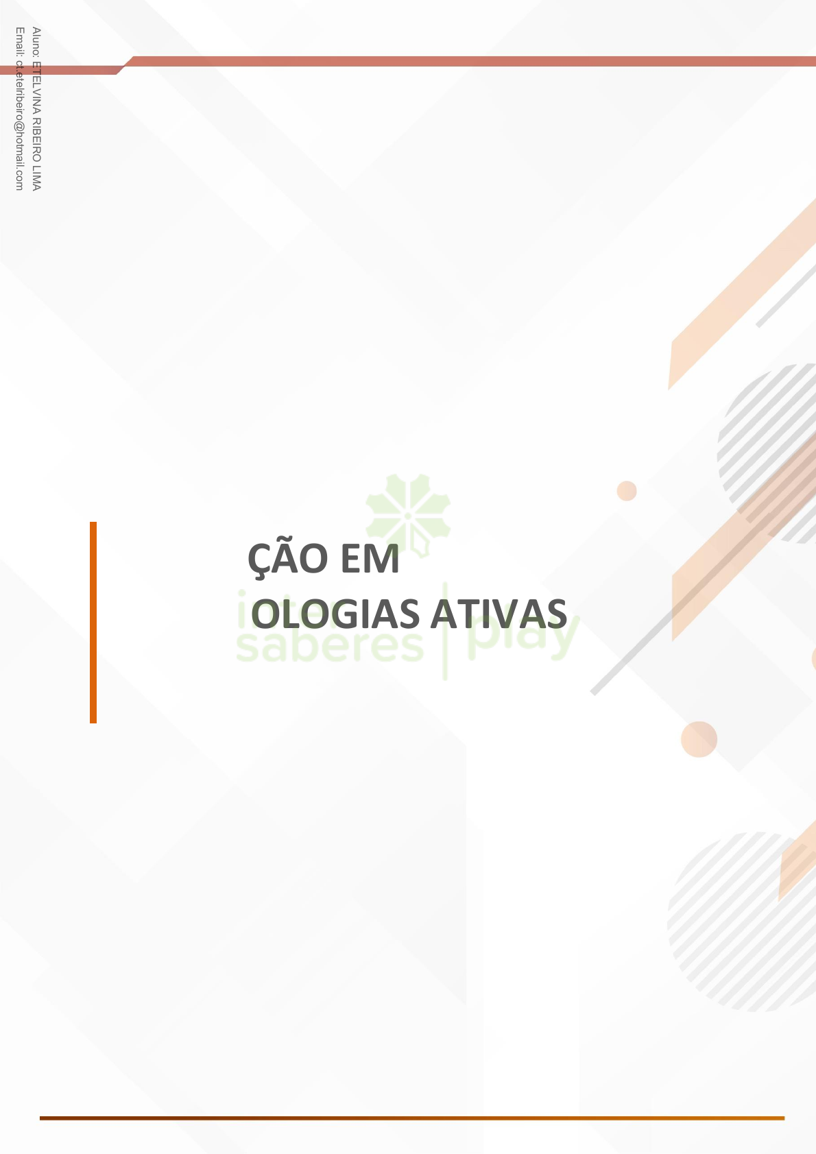 AULA 1 AVALIAÇÃO EM METODOLOGIAS ATIVAS Profª Joice Martins Diaz A luno: E T E LV IN A R IB E IR O LIM A E m ail: ct.etelribeiro@ hotm ail.com 2 CONVERSA INICIAL A educação é um meio único para trazer mudanças sociais, porém, devido às diversas mudanças na sociedade, surge a necessidade de introduzir mudanças também no sistema educacional. Nesta aula serão abordados assuntos relacionados à educação contemporânea que se fazem presentes a partir do novo papel do aluno presente em sala de aula. Diante dessa mudança considerável, faz-se necessário pensar nas modificações que devem ser feitas no contexto escolar, assim como na atuação do professor, para que, diante de um ambiente apropriado dirigido por um profissional que entenda todas essas modificações, seja ofertada uma educação com qualidade e que responda às expectativas dos alunos. TEMA 1 – EDUCAÇÃO PARA CONTEMPORANEIDADE Os ambientes de aprendizagem contemporâneos devem ser projetados para atender às necessidades dos alunos na era digital, oferecendo flexibilidade e oportunidades para colaboração, independência e conectividade com recursos globais. Faz-se necessário implementar métodos de ensino modernos e criativos, nos quais a abordagem do professor e o desempenho do aluno estejam alinhados com os altos padrões acadêmicos aplicados. O aprendizado contemporâneo é personalizado e fornece acesso em qualquer momento e em qualquer lugar para os alunos, por meio das tecnologias portáteis. O mundo dos alunos dentro e fora da escola é conectado pelo uso de ferramentas contemporâneas de processamento de informações, comunicação e colaboração. Os professores se envolvem no aprendizado contínuo para aprimorar sua prática profissional e as práticas de seus alunos. Os pais têm o poder de se envolver ativamente na educação de seus filhos, acessando sistemas de comunicação e aprendizado, além de relatórios e monitoramento on-line. A pesquisa Nossa Escola em (Re)Construção, feita no ano de 2016, pela Porvir1, ouviu jovens de 13 a 21 anos de todas as regiões do Brasil com o intuito de saber o que os jovens pensam da escola e como eles gostariam que ela fosse. 1 O Porvir é um dos programas do Instituto Inspirare, que mapeia, produz, difunde e compartilha referências sobre inovações educacionais. Tem como propósito inspirar melhorias na qualidade da educação brasileira e incentivar a mídia e a sociedade a compreender e demandar inovações educacionais. A luno: E T E LV IN A R IB E IR O LIM A E m ail: ct.etelribeiro@ hotm ail.com 3 Os jovens foram estimulados a refletir sobre suas experiências de aprendizagem e a expressar seus desejos em relação à educação. Os principais objetivos dessa pesquisa foram: escutar os jovens; incentivar que os jovens se mobilizem e se sintam protagonistas na reflexão sobre a escola que querem; e estimular a reflexão sobre a educação/escola a partir de uma perspectiva inovadora. A consulta Nossa Escola em (Re)Construção utilizou a metodologia PerguntAção, desenvolvida pela Rede Conhecimento Social2. Os jovens do Grupo de Atuação debateram sobre características que não poderiam faltar na escola de seus sonhos. Uma delas é sobre a possibilidade de troca de conhecimento e respeito entre os participantes, o que incluiria habilidades pessoais e aceitação das diversidades. Dessa forma, 132 mil jovens, de todas as regiões do país, com idade de 13 a 21 anos, responderam à pesquisa. 86% dos jovens são provenientes de escola pública, e somente 13% de escola privada. Um dos contextos da pesquisa estava relacionado com a avaliação do aluno sobre a sua escola. Os resultados apontam que 4 em cada 10 jovens estão satisfeitos com as aulas e os materiais pedagógicos; 7 em cada 10 jovens acreditam que as relações dos alunos com a equipe escolar e com seus colegas precisam melhorar; e 57% dos jovens classificam como regular ou ruim o uso da tecnologia na escola. Para avaliar a escola atual ou a última em que estudaram, os participantes foram convidados a dar uma nota para 11 itens, na seguinte escala: 5 “Tá tranquilo, tá favorável” 4 “Até que tá bom, mas…” 3 “Tá mais ou menos” 2 “Tem que melhorar” 1 “Tá tenso" Dentre todas as 11 questões, que envolvem assuntos como prédio e estrutura, alimentação, aulas e matérias, entre outras, a questão sobre “uso da tecnologia” teve uma nota média de 3,2, distribuídas da seguinte forma: 26% “Tá tranquilo, tá favorável” 17% “Até que tá bom, mas…” 2 Organização sem fins lucrativos, spin-off do Instituto Paulo Montenegro, cuja missão é promover a construção participativa de conhecimento, estimulando e conectando pessoas, grupos, organizações e seus saberes, para gerar mobilização e transformação social. A luno: E T E LV IN A R IB E IR O LIM A E m ail: ct.etelribeiro@ hotm ail.com 4 26% “Tá mais ou menos” 10% “Tem que melhorar” 21% “Tá tenso" Entre as atividades práticas, as olimpíadas de conhecimento são as que mais acontecem nas escolas e das quais os jovens mais participam: 6 em cada 10 jovens afirmam que há olimpíadas de conhecimento nas escolas; 4 em cada 10 jovens desejam ter oficinas e atividades de vídeos, jornais, programas de rádio, blogs, fotografia e outras mídias. Na etapa em que os jovens foram convidados a expressarem sua ideia de como seriam os ambientes educacionais dos seus sonhos, 51% apontam que tecnologia não pode faltar em uma escola, pois faz parte da vida dos jovens e eles querem utilizá-la em todos os espaços da escola, não apenas em um laboratório ou em uma sala restrita. A pesquisa conclui que os jovens sentem falta de atividades como: Extraclasse; Artísticas; Uso da tecnologia em suas escolas; Metodologias e oportunidades de aprendizagem que extrapolem o modelo tradicional de aula expositiva e ofereçam uma formação mais abrangente; Aprender além dos conteúdos cobrados nos exames d