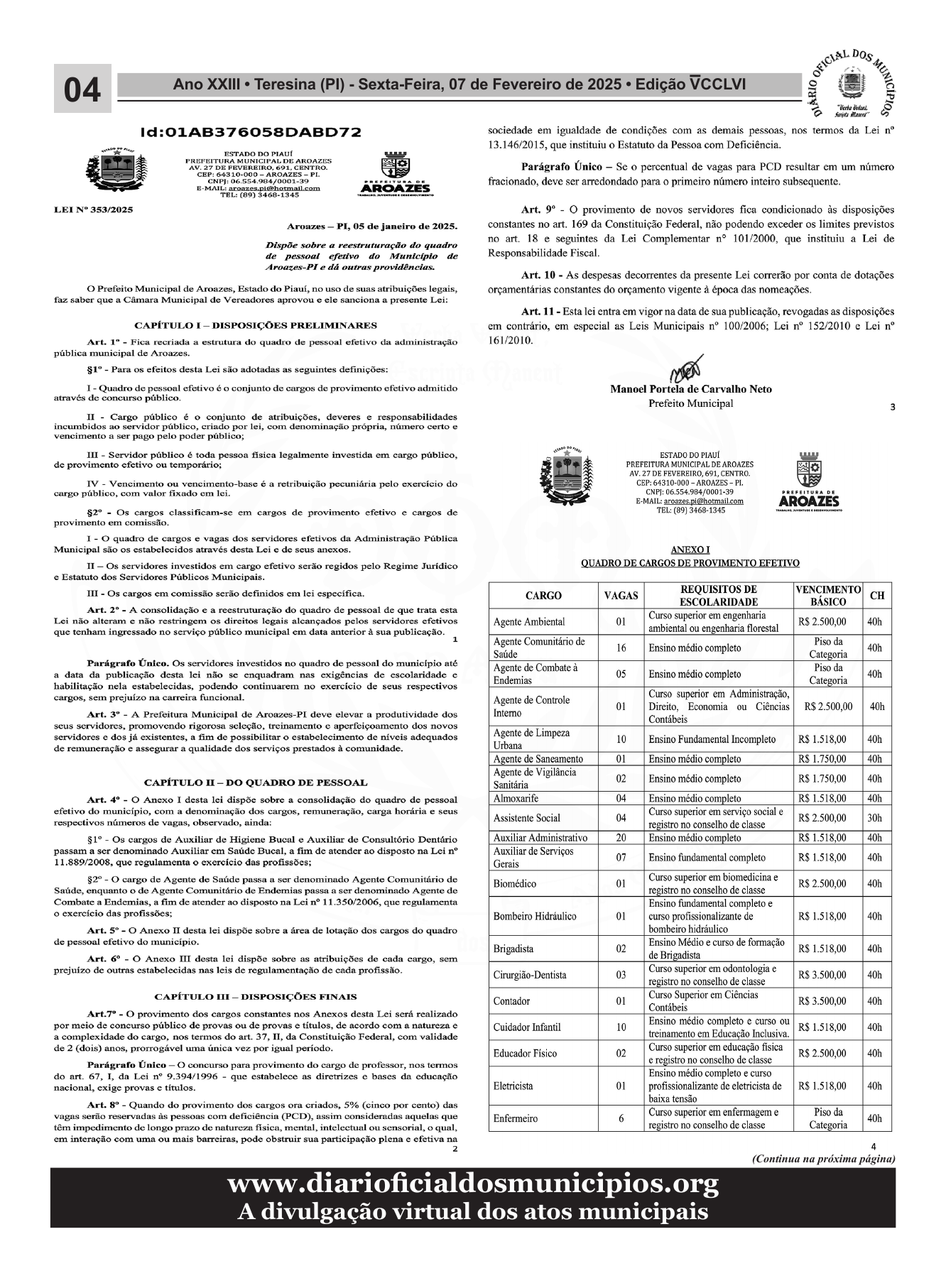 www.diarioficialdosmunicipios.org A divulgação virtual dos atos municipais 04 Ano XXIII • Teresina (PI) - Sexta-Feira, 07 de Fevereiro de 2025 • Edição V CCLVI (Continua na próxima página) c.,vJ..DOs s,,.S: ,,- , +ç. o , · i ,t- ===================================================== -~ "~ º~· ·~ ··r,,,;.,,- Ç> - - · "' LEI Nº 353/2025 ld :01 AB3760SSDABD 72 E STADO DO PIAUÍ PREFEITURA MUNICIPAL DE AROAZES AV. 2 7 DE FEVEREmo. 6 91, CENTRO. CEP: 64310-000 - AROAZES - P I. CNPJ: 06.554.984/ 0001-39 E-MAIL, aroazes ol@botroaH coro TEL: (89) 3 4 6 8-13 45 AROAZES - ---·--.. - Aroazes - PI, OS de janei ro de 2025. Dispõe sobre a reestruturaç ão do quadro de p essoal efetivo do Munlclplo d e A roazes-PI e dá outras providências. O Prefeito Municipal de Aroazes, Estado do Piauí, no uso de suas atribuições legais, faz saber q ue a Câmara Municipal de Vereadores aprovou e ele sanciona a presente Lei: CAPÍTULO I - DISPOSIÇÕES PRELIMINARES Art. 1 º - Fica recriada a estrutura do quadro de pessoal efetivo da administração pública municipal de Aroazes. §1º - Para os efeitos desta Lei são adotadas as seguintes definições: I - Quadro de pessoal efetivo é o conjunto de cargos de provimento efetivo admitido através de concurso público. II - Cargo público é o conjunto de atribuições, deveres e responsabilidades incumbidos ao servidor público, criado por lei, com denominação própria, número certo e vencimento a ser pago pelo poder público; IIl - Servidor público é toda pessoa tisica legalmente investida em cargo público, de provimento efetivo ou temporário; IV - Vencimento ou vencimento-base é a retribuição pecuniária pelo exercício do cargo público, com valor :fixado em lei. §2° - Os cargos classificam-se em cargos d e provime nto efetivo e cargos d e provimento em comissão. I - O quadro de cargos e vagas dos servidores efetivos da Administração Pública Municipal são os estabelecidos a través des ta Lei e de seus anexos. II - O s servidores investidos e m cargo efetivo serão regidos pelo Regime Jurídico e E statuto dos Servidores Públicos Municipais. m - Os cargos em comissão serão definidos em lei específica. Art. 2º - A consolidação e a reestruturação do quadro de pessoal de que trata esta Lei n ão alteram e n ão re stri ngem os direitos lega is alca nçados pelos servidores ef"etivos qu e tenham ingressado no serviço público municipal em data anterior à sua publicação. 1 Parágrafo Único. Os servidores investidos no quadro de pessoal do município até a data da publicação desta lei não se enquadram nas exigências de escolaridade e habilitação nela estabelecidas, podendo continuarem no exercício de seus respectivos cargos, sem prejuízo na carreira funcional. Art. 3° - A Prefeitura Municipal de Aroazes-PI deve e levar a produtividade dos seus servid ores, promovendo rigorosa seleção, treinrunento e aperfeiçoamento dos novos servidores e dos j á existentes, a fim de possibilitar o estabelecimento de níveis adequados de remuneração e assegurar a qualidade dos serviços prestados à comunidade . CAPÍTULO II - DO QUADRO DE PESSOAL Art. 4° - O Anexo I des ta lei dispõe sobre a consolidação do quadro de pessoal efetivo do município, com a denominação dos cargos, remuneração, carga horária e seu s respectivos números de vagas, observado, ainda : § 1° - Os cargos de Auxiliar de Higiene Bucal e Auxiliar de Consultório Dentário passam a ser denominado Auxiliar em Saúde Bucal, a fim d e a tender ao disposto na Lei nº 11.889/2008, que regulamenta o exercício das profissões; §2° - O cargo de Agente de Saúde passa a ser denominado Agente Comunitário de Saúde, enqu anto o d e Agente Comunitário de Endemias passa a ser denominado Agente d e Combate a Eodemias, a fim de atender ao disposto n a Lei nº 11 .350/2006, que regulamenta o exercício das profissões; Art. 5° - O Anexo II d esta lei dispõe sobre a área d e lotação dos cargos do quadro de pessoal efetivo do mwiicípio. Art. 6° - O Anexo Ili desta lei dispõe sobre as atribuições de cad a cargo, sem prejuízo de outras estabelecidas nas leis de regulamentação de cada profissão. CAPÍTULO m - DISPOSIÇÕES FINAIS Art. 7° - O provimento dos cargos con stantes nos Anexos desta Lei será realizado por meio de concurso público de provas o u de provas e títulos, de acordo com a natureza e a complexidade do cargo, nos termos do art. 37, II, da Constituição Federal, com validade de 2 (dois) anos, prorrogável uma única vez por igual período. Parágrafo Único - O concurso para provimento do cargo de professor, nos termos do art. 67, I, da Lei nº 9 .394/ 1996 - que estab elece as diretrizes e bases da educação nacional, exige provas e títulos. Art. 8° - Quando do provimento dos cargos ora criados, 5% (cinco por cento) das vagas serão reservadas às pessoas com deficiência (PCD), assim consideradas aqu elas qu e tê m impedimento d e longo prazo de natureza tisica, mental, intelectua l o u sensorial, o qual, em interação com uma ou mais barreiras, pode obstruir sua participação plena e efetiva na 2 sociedade em igualdade de condições com as demais pessoas, nos termos da Lei nº 13.146/20 15, que instituiu o Estatuto da Pessoa com Deficiência. Parágrafo Único - Se o percentual de vagas para PCD resultar em um número fracionado, deve ser arredondado para o primeiro número inteiro subsequente. Art. 9º - O provimento de novos servidores fica condicionado às disposições constantes no art. 169 da Constituição Federal, não podendo exceder os limites previstos no art. 18 e seguintes da Lei Complementar nº 1 O 1 /2000, que instituiu a Lei de Responsabilidade Fiscal. Art. 10 - As despesas decorrentes da presente Lei correrão por conta de dotações orçamentárias constantes do orçamento vigente à época das nomeações. Art. 11 - Esta lei entra em vigor na data de sua publicação, revogadas as disposiç
