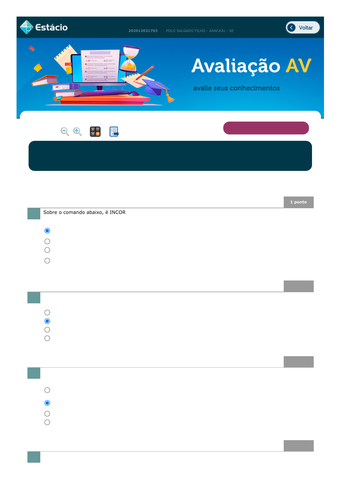 19/09/2021 20:25 EPS https://aulapos.estacio.br/aulapos/ 1/3 JOSE LUCAS ALMEIDA SANTOS Avaliação AV 202012031703 POLO SALGADO FILHO - ARACAJU - SE avalie seus conhecimentos 1 ponto Sobre o comando abaixo, é INCORRETO dizer: (Ref.: 202017303876) 1 ponto Para que serve um índice em uma tabela? (Ref.: 202017306233) 1 ponto Um conceito muito importante no modelo relacional é a Cardinalidade, que indica: (Ref.: 202017305878) 1 ponto MER é um: (Ref.: 202017308122) Lupa Calc. Notas VERIFICAR E ENCAMINHAR Disciplina: NPG4808 - BANDO DE DADOS Período: 2021.2 EAD (POS) Aluno: JOSE LUCAS ALMEIDA SANTOS Matr.: 202012031703 Turma: 9001 Prezado(a) Aluno(a), Responda a todas as questões com atenção. Somente clique no botão FINALIZAR PROVA ao ter certeza de que respondeu a todas as questões e que não precisará mais alterá-las. Valor da prova: 10 pontos. 1. A seleção proposta na cláusula WHERE verifica primeiro as condições entre parêntesis e faz a conexão lógica com o "OR" entre as duas condições entre parêntesis. No resultado exibido, serão demonstradas todas as linhas da tabela de clientes. Nenhuma das alternativas. Retornará todos os clientes cujo código esteja entre 21 e 31, inclusive, ou que estiverem entre 60 e 90, inclusive. 2. Para auxiliar na integridade dos registros. Para auxiliar no armazenamento dos dados. Para auxiliar na localização rápida do registro / tupla. Para organizar tuplas e atributos. 3. Em um relacionamento entre duas colunas de uma tabela, quantas vezes uma coluna pode estar relacionada à outra coluna. Em um relacionamento entre duas tabelas, quantas vezes um mesmo elemento de uma tabela pode estar relacionado a elementos de outra tabela. Quantas vezes a chave-primária de uma tabela pode ser relacionada com os atributos desta tabela. A quantidade máxima de linhas suportada por uma tabela. 4. javascript:voltar(); javascript:diminui(); javascript:aumenta(); javascript:calculadora_on(); javascript:anotar_on(); 19/09/2021 20:25 EPS https://aulapos.estacio.br/aulapos/ 2/3 1 ponto Numa relação 1 x N, informalmente é chamada de tabela a tabela com cardinalidade da relação e de tabela a tabela com cardinalidade da relação. É correto afirmar: (Ref.: 202017308240) 1 ponto Um Modelo de Dados é: (Ref.: 202017305942) 1 ponto São vantagens do relacionamento entre tabelas proporcionado em banco de dados relacionais, EXCETO: (Ref.: 202017304697) 1 ponto Uma tabela está na ________ se, e somente se, em todo valor válido, para cada linha, contém exatamente um valor para cada atributo. A alternativa que melhor completa a sentença é: (Ref.: 202017305815) 1 ponto Durante a modelagem de um Banco de Dados foram identificadas as seguintes tabelas: (VER TABELA) Modelo abstrato que representa a estrutura de um Banco de Dados, mostrando as Entidades e seus relacionamentos. As tabelas são tratadas como Entidades. Conjunto de Entidades e seus Atributos representados dentro de um Banco de Dados por um modelo abstrato. Modelo externo de relacionamentos que indica quais são as linhas e colunas de uma tabela. Modelo gráfico utilizado por analistas de sistemas para indicar quais as tabelas existirão no sistema e como o usuário deve digitar as informações no sistema. 5. A tabela "pai" exporta sua PK para a tabela "filha", como FK, podendo esta FK fazer ou não parte da chave primária da tabela "filha". A PK da tabela "pai" é exportada para a tabela "filha" como FK e como chave primária. A tabela "pai" exporta sua PK e esta será uma PK (chave estrangeira) na tabela de "filha". A tabela "filha" exporta sua PK para a tabela "pai", como FK, podendo esta FK fazer ou não parte da chave primária da tabela "pai". 6. A descrição das informações que estarão armazenadas no banco e dados. Um conjunto de relacionamentos em um banco de dados. Uma coleção de dados armazenados. Representação abstrata do Banco de Dados, com tabelas e relacionamentos. 7. Redução de redundância: escreve-se menos, sem a necessidade de se repetir informação. Integridade: garante-se que um mesmo nome estará igual em todas as suas ocorrências. Acesso facilitado: as aplicações cuidam das estruturas de dados e acessam diretamente os dados das tabelas. Redução de espaço: ao segregar a informação em várias tabelas, o tamanho total em bytes se reduz. 8. 1FN Não normalizada. 3FN 2FN 9. pai 1 filha N 19/09/2021 20:25 EPS https://aulapos.estacio.br/aulapos/ 3/3 Sabe-se que um professor poderá ministrar mais de uma disciplina e uma disciplina também poderá ser ministrada por mais de um professor. Além disso, é necessário ter a informação da sala que um determinado professor ministra uma certa disciplina. O que você faria para completar esse Banco de Dados? (Ref.: 202017299957) 1 ponto Considere a tabela abaixo. Sobre Normalização é correto afirmar: (Ref.: 202017306293) Criaria uma nova tabela contendo Cod_Disciplina e Cod_Professor, sendo que esses dois atributos formariam a chave primária desta nova tabela e cada um, individualmente, também é chave estrangeira. Incluiria uma coluna Cod_Professor na tabela Disciplina, criando uma tabela 1XN, em que Disciplina (N) X (1) Professor. Criaria uma nova tabela contendo os seguintes atributos: Cod_Disciplina, Cod_Professor e Sala, sendo que Cod_Disciplina e Cod_Professor formariam a chave primária desta nova tabela e cada um, individualmente, também é chave estrangeira. Incluiria uma coluna Cod_Disciplina na tabela Professor e uma coluna Cod_Professor na tabela Disciplina, criando uma tabela NXN, em que Professor (N) X Disciplina (N). 10. Esta tabela encontra-se na 3FN (terceira forma normal). Esta tabela atende à primeira e segunda formas normais (1FN e 2FN) mas não atende à 3FN. CodCli e CodVend não apresentam dependência entre si. Isto, por si só, já permite cocluirmos que a tabela está na 3FN. Esta tabela encontra-se na 2a forma normal, pois não possui valores multivalorados nem dependência parcial 
