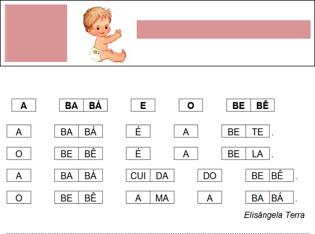NOME: __________________________________________ DATA: __/ __/ 2019 3 B BA – BE – BI – BO – BU Leia o texto: Colorir a última palavra do texto de azul. Colorir o título de amarelo. Colorir o nome da autora do texto de verde. Colorir a primeira sílaba da palavra BABÁ, toda vez que ela aparecer no texto. Marque a resposta certa: 1) A BABÁ É A: ( ) BIA. ( ) BETE. ( ) BELA. 2) O BEBÊ É A: ( ) BIA. ( ) BETE. ( ) BELA. 3) A BABÁ DE BELA: ( ) CUIDA DO BEBÊ. ( ) JOGA A BOLA. ( ) LAVA O BEBÊ. NOME: __________________________________________ DATA: __/ __/ 2019 4 Lista de palavras com BA, BE, BI, BO, BU BALÉ BOIA BONECA BULE BANANA BOLA BALÃO BEXIGA BOCA BALA BONÉ BUZINA BICO BALEIA BATATA BEBÊ Escreva o nome dos desenhos em sílabas e, depois, copie-os: - - - NOME: __________________________________________ DATA: __/ __/ 2019 5 Complete a cruzadinha: B B A N A N A A L T E A I T B A L É B O L A U E Z B X B I C O B O I A N C G A A B A L A O N B U L E E C B A Ê NOME: __________________________________________ DATA: __/ __/ 2019 6 Escrever o nome de cada uma das figuras e colorir, em cada quadro de alfabeto, as letras que foram usadas para escrever cada um desses nomes: A B C D E F G H I J K L M N O P Q R S T U V W X Y Z A B C D E F G H I J K L M N O P Q R S T U V W X Y Z A B C D E F G H I J K L M N O P Q R S T U V W X Y Z A B C D E F G H I J K L M N O P Q R S T U V W X Y Z A B C D E F G H I J K L M N O P Q R S T U V W X Y Z A B C D E F G H I J K L M N O P Q R S T U V W X Y Z Colorir a primeira sílaba do nome de cada desenho. NOME: __________________________________________ DATA: __/ __/ 2019 7 C CA – CO – CU Leia o texto: Colorir a última palavra do texto de azul. Colorir o título de amarelo. Colorir o nome da autora do texto de verde. Colorir a primeira sílaba da palavra CUCO, toda vez que ela aparecer no texto. Marque a resposta certa: 1) CACO FOI À CASA: ( ) DO CUCO. ( ) DO VOVÔ. ( ) DO BEBÊ. 2) O CUCO BATEU E FEZ: ( ) TRIMMMMM. ( ) PRIIIIIIII. ( ) CUCO, CUCO. NOME: __________________________________________ DATA: __/ __/ 2019 8 Lista de palavras com CA, CO, CU CADEIRA CAVALO CANUDO COPO COLA CASA CAMELO CUCO CAMA CANECA CAPA CACAU CAFÉ CAJU CAMISA COCO Colorir a primeira sílaba de cada desenho: BE CU BU CA CO CU CA CO CU NOME: __________________________________________ DATA: __/ __/ 2019 9 Escreva o nome dos desenhos em sílabas e, depois, copie-os: - - - - - - Ligue os desenhos cuja primeira sílaba é a destacada abaixo: CA NOME: __________________________________________ DATA: __/ __/ 2019 10 Complete a cruzadinha: C C C A V A L O N C U C O E O A C C N C A C A U U D D C E C O L A I M C R I C A S A S M C A P A E A L F C O P O É A J U NOME: __________________________________________ DATA: __/ __/ 2019 11 D DA – DE – DI – DO – DU Leia o texto: Colorir a última palavra do texto de azul. Colorir o título de amarelo. Colorir a primeira sílaba da palavra DOCE, toda vez que ela aparecer no texto. Marque a resposta certa: 1) O DOCE ERA DE: ( ) BANANA. ( ) ABACAXI. ( ) ABACATE. 2) DUDU FOI À CASA DE CADU E: ( ) JOGOU BOLA. ( ) NADOU. ( ) COMEU DOCE. NOME: __________________________________________ DATA: __/ __/ 2019 12 Lista de palavras com DA, DE, DI, DO, DU DEBAIXO DIA DUDU DOIS DADO DEDO DIÁRIO DAMA DOZE DOMINÓ DOCE DORA CABIDE BODE BICADA DINAMITE Colorir os desenhos cujo nome começa com as sílabas em destaque: DA BA NOME: __________________________________________ DATA: __/ __/ 2019 13 Complete a cruzadinha: D D E B A I X O I A B C O D O R A C D O D I N A M I T E D A M A A B I I N D Ó D O Z E I Á R D O I S D E D O O A C D E O NOME: __________________________________________ DATA: __/ __/ 2019 14 Escreva o nome dos desenhos em sílabas e, depois, copie-os: - - - - - - Para cada letra, pinte um quadradinho. Escreva o número que representa a quantidade de letras de cada nome: DESENHO NOME QUANTIDADE DE LETRAS NÚMERO NOME: __________________________________________ DATA: __/ __/ 2019 15 F FA – FE – FI – FO – FU Leia o texto: Colorir a última palavra do texto de azul. Colorir o título de amarelo. Marque a resposta certa: 1) A FADA DEU A FITA PARA BELA PORQUE ELA É: ( ) EDUCADA. ( ) BONITA. ( ) BOA. 2) QUEM FALOU “DÁ A FITA PARA A BELA!”? ( ) A FADA. ( ) A FERA. ( ) A MENINA. NOME: __________________________________________ DATA: __/ __/ 2019 16 Lista de palavras com FA, FE, FI, FO, FU FOCA FAVA FILA FUMAÇA FAXINA FEIRA FADA FUNIL FEIJÃO FERA FURACÃO FOTO FUBÁ FONE FIVELA FACA Colorir os desenhos cujo nome começa com as sílabas em destaque: FO CA NOME: __________________________________________ DATA: __/ __/ 2019 17 Complete a cruzadinha: F F F U R A C Ã O N T F A X I N A O E L I R F A D A I V E F I L A U A M A F E R A Ç F E I J Ã O F A V A C U C A B A ÁNOME: __________________________________________ DATA: __/ __/ 2019 18 Escreva o nome dos desenhos em sílabas e, depois, copie-os: - - - - - - - - - Escreva o nome dos desenhos: NOME: __________________________________________ DATA: __/ __/ 2019 19 G GA – GO – GU Leia o texto: Colorir a primeira sílaba da palavra GATA, toda vez que ela aparecer no texto. Marque a resposta certa: 1) A GATA VIU A AVE: ( ) NO MURO. ( ) NA RUA. ( ) NA GAIOLA. 2) A AVE FICOU FELIZ PORQUE A MAGALI: ( ) LEVOU A GATA. ( ) BATEU NA GATA. ( ) CHAMOU A GATA. 3) A AVE FICOU COM MEDO: ( ) DA MAGALI. ( ) DO GALO. ( ) DA GATA. NOME: __________________________________________ DATA: __/ __/ 2019 20 Lista de palavras com GA, GO, GU GATO GATA ÉGUA GALO FIGO GAIVOTA GOLEIRO GOLA GAROTA FOGO GAVIÃO GUDE GOTA ÁGUA GULOSA MAGO Escreva o nome dos desenhos: NOME: __________________________________________ DATA: __/ __/ 2019 21 Complete a cruzadinha: É G G U L O S A U T G O T A G A L O A A I V V G F I G O F O G O Ã T L O A E I R G G O L A R M O A T G U D E G A T O NOME: __________________________________________ DATA: __/ __/ 2019 22 Copie o nome dos desenhos, separando em sílabas. Colorir, no nome de 
