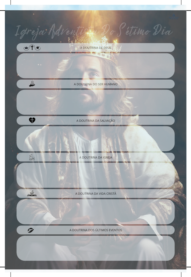 A DOUTRINA DE DEUS As 6 Doutrinas e as 28 Crenças Fundamentais da Igreja Adventista Do Sétimo DiaIgreja Adventista Do Sétimo Dia A DOUTRINA DO SER HUMANO A DOUTRINA DA SALVAÇÃO A DOUTRINA DA IGREJA A DOUTRINA DA VIDA CRISTÃ A DOUTRINA DOS ÚLTIMOS EVENTOS As 6 Doutrinas e as 28 Crenças Fundamentais da Igreja Adventista Do Sétimo DiaIgreja Adventista Do Sétimo Dia O GRANDE CONFLITO (Apocalipse 12:4-9; Isaías 14:12-14; Ezequiel 28:12-18; Gênesis 3; Gênesis 6-8)1. VIDA,MORTE E RESSURREIÇÃO DE CRISTO (João 3:16; Isaías 53; 2 Coríntios 5:14, 15 e 19-21; Romanos 1:4)2. A EXPERIÊNCIA DA SALVAÇÃO (Salmos 27:1; Isaías 12:2; Jonas 2:9; João 3:16; 2 Coríntios 5:17-21)3. O CRESCIMENTO EM CRISTO (Salmos 1:1,2; 23:4; 77:11,12; Colossenses 1:13, 14; 2:6, 14,15)4. A LEI DE DEUS (Êxodo 20:1-17; Mateus 5:17; Deuteronômio 28:1-14; Romanos 8:1-4; 1 João 5:3)1. O SÁBADO (Gênesis 2:1-3; Êxodo 20:8-11; 31:12-17; Lucas 4:16; Hebreus 4:1-11;Marcos 2:27 e 28)2. A MORDOMIA (Gênesis 1:26-28; 2:15; Ageu 1:3-11; Malaquias 3:8-12; Mateus 23:23; 1 Coríntios 9:9-14)3. A CONDUTA CRISTÃ (I João 2:6; Efésios 5:1-13; Romanos 12:1 e 2; 1 Coríntios 6:19 e 20; 10:31)4. O CASAMENTO E A FAMÍLIA (Gênesis 2:18-25; Deuteronômio 6:5-9; João 2:1-11; Efésios 5:21-33)5. AS ESCRITURAS SAGRADAS (2 Pedro 1:20 e 21; 2 Timóteo 3:16 e 17; Salmos 119:105; Provérbios 30:5 e 6)1. A TRINDADE (Deuteronômio 6:4; 29:29; Mateus 28:19; 2 Coríntios 13:13; Efésios 4:4-6; 1 Pedro 1:2)2. O PAI (Gênesis 1:1; Apocalipse 4:11; 1 Coríntios 15:28; João 3:16; 1 João 4:8; 1 Timóteo 1:17)3. O FILHO (João 1:1-3 e 14; 5:22; Colossenses 1:15-19; João 10:30; 14:9; Romanos 5:18; 6:23)4. O ESPÍRITO SANTO (Gênesis 1:1 e 2; Lucas 1:35; 2 Pedro 1:21; Lucas 4:18; Atos 10:38; 2 Coríntios 3:18)5. O MINISTÉRIO DE CRISTO NO SANTUÁRIO CELESTIAL (Hebreus 1:3; 8:1-5; 9:11-28; Números 14:34)1. A SEGUNDA VINDA DE CRISTO (2 Tessalonicenses 2:8; Mateus 24; Marcos 13; Lucas 21; 2 Timóteo 3:1-5)2. A MORTE E RESSURREIÇÃO (1 Timóteo 6:15 e 16; Romanos 6:23; 1 Coríntios 15:51-54; Eclesiastes 9:5 e 6)3. O MILÊNIO E O FIM DO PECADO (Apocalipse 20; Zacarias 14:1-4; Malaquias 4:1; 2 Pedro 2:4 1;Coríntios 6)4. A NOVA TERRA (2 Pedro 3:13; Gênesis 17:1-8; Isaías 35; 65:17-25; Apocalipse 21:1-7; 22:1-5; 11:15)5. A IGREJA (Gênesis 12:3; Atos 7:38; Atos 1:8) 5. A CEIA DO SENHOR (Mateus 26:17-30)1. O REMANESCENTE E SUA MISSÃO (Marcos 16:15) 6. OS DONS E MINISTÉRIOS ESPIRITUAS (Atos 6:1-7)2. A UNIDADE NO CORPO DE CRISTO (Salmos 133:1) 7. O DOM DE PROFECIA (Atos 2:14-21; Hebreus 1:1-3)3. O BATISMO ((Mateus 3:13-16; 28:19 e 20; Atos 2:38)4. A CRIAÇÃO (Gênesis 1; 2; Êxodo 20:8-11; Salmos 19:1-6; 33:6 e 9; 104; Hebreus 11:3; João 1:1-3; Colossenses 1:16 e 17) 1. A NATUREZA DA HUMANIDADE (Gênesis 1:26-28; 2:7; Salmos 8:4-8; Atos 17:24-28; Gênesis 3; Salmos 51:5; Romanos 5:12-17; 2 Coríntios 5:19 e 20). 2. A DOUTRINA DOS ÚLTIMOS EVENTOS A DOUTRINA DA VIDA CRISTÃ A DOUTRINA DA IGREJA A DOUTRINA DA SALVAÇÃO A DOUTRINA DE DEUS A DOUTRINA DO SER HUMANO