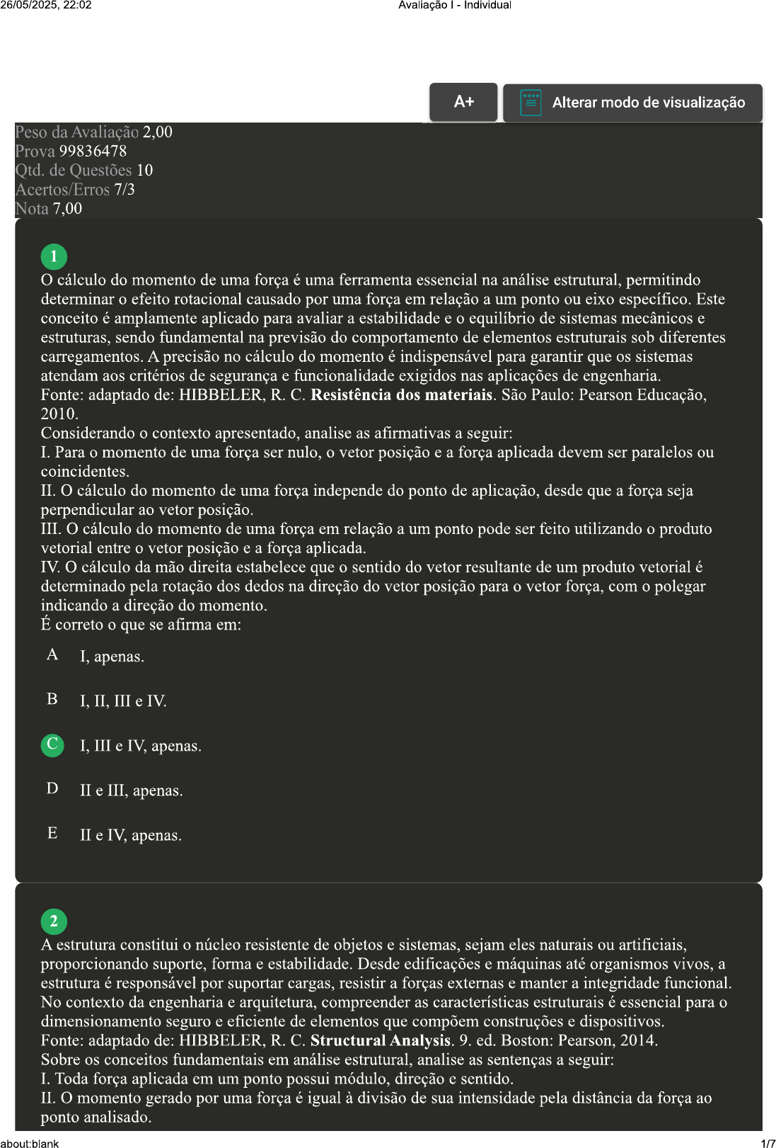 26/05/2025, 22:02 Avaliação Individual A+ Alterar modo de visualização Peso da Avaliação 2,00 Prova 99836478 Qtd. de Questões 10 Acertos/Erros 7/3 Nota 7,00 1 O cálculo do momento de uma força é uma ferramenta essencial na análise estrutural, permitindo determinar efeito rotacional causado por uma força em relação a um ponto ou eixo específico. Este conceito é amplamente aplicado para avaliar a estabilidade e equilíbrio de sistemas mecânicos e estruturas, sendo fundamental na previsão do comportamento de elementos estruturais sob diferentes carregamentos. A precisão no cálculo do momento é indispensável para garantir que os sistemas atendam aos critérios de segurança e funcionalidade exigidos nas aplicações de engenharia. Fonte: adaptado de: HIBBELER, R. C. Resistência dos materiais. São Paulo: Pearson Educação, 2010. Considerando contexto apresentado, analise as afirmativas a seguir: I. Para momento de uma força ser nulo, vetor posição e a força aplicada devem ser paralelos ou coincidentes. II. O cálculo do momento de uma força independe do ponto de aplicação, desde que a força seja perpendicular ao vetor posição. III. O cálculo do momento de uma força em relação a um ponto pode ser feito utilizando produto vetorial entre vetor posição e a força aplicada. IV. O cálculo da mão direita estabelece que sentido do vetor resultante de um produto vetorial é determinado pela rotação dos dedos na direção do vetor posição para vetor força, com polegar indicando a direção do momento. correto que se afirma em: A I, apenas. B I, II, III e IV. C I, III e IV, apenas. D II e III, apenas. E II e IV, apenas. 2 A estrutura constitui núcleo resistente de objetos e sistemas, sejam eles naturais ou artificiais, proporcionando suporte, forma e estabilidade. Desde edificações e máquinas até organismos vivos, a estrutura é responsável por suportar cargas, resistir a forças externas e manter a integridade funcional. No contexto da engenharia e arquitetura, compreender as características estruturais é essencial para dimensionamento seguro e eficiente de elementos que compõem construções e dispositivos. Fonte: adaptado de: R. C. Structural Analysis. 9. ed. Boston: Pearson, 2014. Sobre os conceitos fundamentais em análise estrutural, analise as sentenças a seguir: I. Toda força aplicada em um ponto possui módulo, direção e sentido. II. O momento gerado por uma força é igual à divisão de sua intensidade pela distância da força ao ponto analisado. about:blank 1/726/05/2025, 22:02 Avaliação - Individual III. Toda força aplicada em um plano irá gerar um binário em outro ponto qualquer diferente do qual a força é aplicada. IV. Em uma estrutura estática, a soma vetorial de todas as forças e momentos deve ser igual a zero para garantir equilíbrio. É correto que se afirma em: A II, III e IV, apenas. B I e IV, apenas. C I, II e III, apenas. D II e III, apenas. E III e IV, apenas. 3 Uma estrutura é considerada isostática quando sua estabilidade pode ser garantida exclusivamente pelas equações de equilíbrio estático, sem a necessidade de considerar deformações ou internas. Essa característica simplifica a análise estrutural, permitindo determinar diretamente as forças internas e reações nos apoios. A isostaticidade é uma propriedade fundamental em diversas aplicações da engenharia, sendo comum em estruturas projetadas para suportar cargas de forma eficiente e segura. Esse conceito é amplamente utilizado no dimensionamento de vigas, treliças e outros sistemas estruturais. Fonte: adaptado de: LINDENBERG NETO, H. Apostila Introdução à mecânica das estruturas. São Paulo: Escola Politécnica da Universidade de São Paulo, 1996. Sobre as estruturas isostáticas, reticuladas e pórticos, analise as afirmativas a seguir: I. Estruturas reticulares são ligadas por rótulas ou articulações. II. O pórtico espacial não pode ser considerado como uma estrutura reticulada. III. A força aplicada pela carga uniforme distribuída é aplicada na metade da distância da aplicação da força. IV. Em uma estrutura isostática, número de incógnitas é igual ao número de equações de equilíbrio da estática. É correto que se afirma em: A I, II, III e IV. B I, III e IV, apenas. C II e IV, apenas. D II e III, apenas. E I, apenas. Revisar Conteúdo do Livro about:blank 2/726/05/2025, 22:02 Avaliação Individual 4 Os elementos estruturais constituem as partes fundamentais de uma estrutura, sendo responsáveis por resistir e transferir as cargas aplicadas, assegurando equilíbrio e a estabilidade do sistema. Entre os principais componentes destacam-se vigas, pilares, lajes e fundações, cada um desempenhando funções específicas na distribuição de esforços. O dimensionamento adequado desses elementos requer a aplicação rigorosa de princípios da mecânica dos materiais e análise estrutural, garantindo que as construções suportem as solicitações previstas, mantendo segurança e funcionalidade. Fonte: adaptado de: HIBBELER, R. C. Resistência dos materiais. São Paulo: Pearson Educação, 2010. Uma viga de concreto está firmemente cravada em uma rocha, impedindo qualquer movimento ou rotação em seu ponto de fixação. Considerando as características desse caso, analise as alternativas a seguir e indique a que corresponde ao tipo de apoio: A Apoio móvel. B Engastamento. C Apoio de linha. D Apoio rotulado. E Apoio fixo. 5 O dimensionamento de estruturas é fundamentado nos princípios do equilíbrio ou do movimento, conforme a finalidade do sistema projetado. Para estruturas estáticas, como edifícios, pontes e pórticos, objetivo principal é garantir que as forças internas e externas estejam equilibradas, assegurando a estabilidade. Esse processo envolve a aplicação de métodos rigorosos de análise estrutural para prever comportamento da estrutura sob diferentes carregamentos. Assim, considera- se a dis