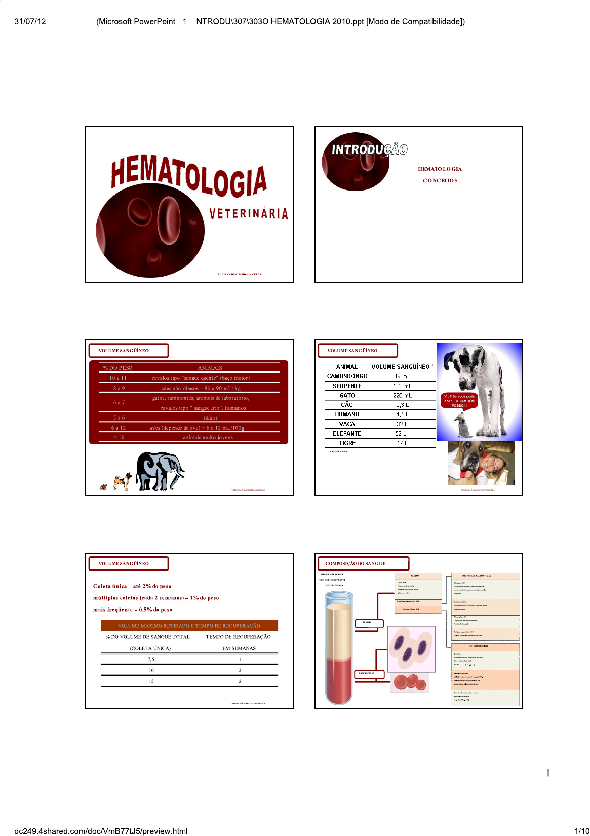 31/07/12 (Microsoft PowerPoint - 1 - HEMATOLOGIA 2010.ppt [Modo de Compatibilidade]) INTRODUCAO HEMATOLOGIA HEMATOLOGIA CONCEITOS VETERINÁRIA LUCIANA VOLUME VOLUME ANIMAIS ANIMAL VOLUME cavalos tipo "sangue CAMUNDONGO 19 mL SERPENTE 102 mL não-obesos 80 a 90 mL/kg GATO gatos, animais de laboratório. 2,3 L cavalos tipo " sangue humanos HUMANO 4,4 L suínos VACA 32 L 6 a 12 aves (depende da ave) = 12 mL/100g ELEFANTE 52 L animais muito jovens TIGRE 17 L DO SANGUE Coleta única até 2% do peso múltiplas coletas (cada 2 semanas) - 1% do peso mais - 0,5% do peso VOLUME MÁXIMO RETIRADO E TEMPO DE RECUPERAÇÃO % DO VOLUME DE SANGUE TOTAL TEMPO DE RECUPERAÇÃO (COLETA ÚNICA) EM SEMANAS 7.5 10 2 15 2 1 dc249.4shared.com/doc/VmB77tJ5/preview.htm 1/1031/07/12 (Microsoft PowerPoint - 1 - HEMATOLOGIA 2010.ppt [Modo de Compatibilidade]) COMPOSIÇÃO DO SANGUE SOBRE AS CÉLULAS SANGUÍNEAS PLAQUETAS OUTRAS Eritrócitos células vermelhas, RBC Função: transporte tampão morfologia celular SOBRE AS CÉLULAS SANGUÍNEAS SOBRE AS CÉLULAS SANGUÍNEAS Leucócitos - células brancas. WBC Plaquetas (células??) Função: defesa do organismo Função: hemostase Fagocitose "morte" de microorganismos * Diferencas morfologia celular b Imunidade celular humoral Diferencas morfologia celular HEMATOPOLESE Locais de produção em Embrião - ilhotas de sangue na parede do saco vitelínico fora do organismo e entre a região mesonefron (AGM) do Estão presentes células tronco multipotentes. mas só ocorre eritropoiese primitiva (eritrócitos nucleados). Esta região suporta o desenvolvimento de células tronco hematopoiéticas (HSC's) e progenitores hematopoiéticos (HPC's 2 dc249.4shared.com/doc/VmB77tJ5/preview.html 2/1031/07/12 (Microsoft PowerPoint - 1 - HEMATOLOGIA 2010.ppt [Modo de Compatibilidade]) HEMATOPOIESE A B Locais de produção em Feto - extramedular no fígado, baço, timo e linfonodos Adulto - medular (medula Parte da linfopoiese ocorre nos linfonodos e baço (timo regride com a idade. mas D retém atividade para o desenvolvimento de células T). HEMATOPOIESE Locais de produção em não-mamíferos adultos: A medula óssea umtecido complexo el pela Peixes e anfíbios - rins. fígado e baço ou produção das células hematopoiéticas que desempenham funções essenciais no Répteis - medula óssea ou ambos Aves medula óssea AVALIAÇÃO CLÍNICA DA HEMOPOIESE HEMOGRAMA (exame do sangue periférico) MEDULA MIELOGRAMA ou BIÓPSIA (estudo INDICAÇÕES MAIS COMUNS: OUTRAS: ANEMIA ARREGENERATIVA: BICITOPENIAS OU NEUTROPENIA: AUMENTO DE NO SANGUE PERIFÉRICO SEM EXPLICAÇÃO (DISPLASIAS): SUSPEITA DE NEOPLASIA (LEUCEMIA MIELÓIDE PRESENÇA DE CÉLULAS ANORMAIS NO SANGUE PERIFÉRICO: NEOPLASIAS ENVOLVENDO HISTIOCITOSE MALIGNA): AUXÍLIO NA AVALIAÇÃO DE TUMORES COMO LINFOMAS E MASTOCITOMAS PESQUISA 3 dc249.4shared.com/doc/VmB77tJ5/preview.html 3/1031/07/12 (Microsoft PowerPoint - 1 - HEMATOLOGIA 2010.ppt [Modo de Compatibilidade]) LOCAL DE ASPIRAÇÃO Outras indicações ainda incluem avaliação de pacientes com hiperproteinemia e/ ou hipercalcemia para doenças como mieloma múltiplo, linfoma, ou outras neoplasias que possam fazer metástase para os ossos. Auxílio na identificação de agentes infecciosos como Histoplasma capsulatum, Leishmania sp., Cytauxzoon felis e outros. Locais mais comumente utilizados: Cavalos: esterno crista iliaca, tibia. LOCAL DE ASPIRAÇÃO TÉCNICA aspirado Aves: esterno tibiotarso proximal RECOLOCAÇÃO TÉCNICA aspirado TÉCNICA biópsia REDIRECION AMENTO DA EPOSICIONAMENTO TAMPA AGULHA DAAGULHA INSERIDO PARA A FRAGMENTO 4 dc249.4shared.com/doc/VmB77tJ5/preview.htm 4/1031/07/12 (Microsoft PowerPoint - 1 - HEMATOLOGIA 2010.ppt [Modo de Compatibilidade]) ESFREGAÇO A PARTIR DO ASPIRADO o CORTE HISTOLÓGICO A PARTIR DA CORANTES 5 dc249.4shared.com/doc/VmB77tJ5/preview.htm 5/1031/07/12 (Microsoft PowerPoint - 1 - HEMATOLOGIA 2010.ppt [Modo de Compatibilidade]) Rubriblasto Prorubricito MONÓCITOS LINFÓCITOS Mielócito segmentado Monoblasto Promonócito Monócito em neutrofilico bastão segmentado Metamielócito basofilico Linfócitos Prolinfócito ou Mielócito em reativo bastão segmentado (maduro) 6 dc249.4shared.com/doc/VmB77tJ5/preview.htm 6/1031/07/12 (Microsoft PowerPoint - 1 - HEMATOLOGIA 2010.ppt [Modo de Compatibilidade]) TROMBOCITOPOIESE SOBRE os (c) Bone marrow consiste of blood different stages of development and supporting tissue known the Mature blood cells through Stem cell the reach circulation nucleus H Fragments of break multiple MEGACARIÓCITO become platelets sinus Macrochage The is composed of fibroblast -like reticular caled and Lymphocyte Leishmania interior de na medula óssea de NUTRIENTES FERRO FERRO Metabolismo do ferro Absorção do Ferro CIRCULANTES Fe inorgânico solubilizado do alimento pelo no estômago b.o Fe solúve - absorção no intestino delgado c. Transporte transmembrana PRECURRORES MACROFAGOS MEDULA OSSEA Ligação comMOBILFERRINA no enterócito Hb e TRANSFERRINA transporte plasmático Síntese de apoferritina Fe apoferritina = FERRITINA Fe PLASMA COMPLEXO Depende... a. Idade. nível de Fe no organismo e saúde do animal FIGADO TGI +2 b. Tipo de Fe ingerido (Fe melhor que Fe ) Necessita Cobre (Cu) para absorção 7 dc249.4shared.com/doc/VmB77tJ5/preview.htm 7/1031/07/12 (Microsoft PowerPoint - 1 - HEMATOLOGIA 2010.ppt [Modo de Compatibilidade]) FERRO FERRO Metabolismo do ferro Distribuição a Hemoglobina 55 65% Hepcidina b. Ferritina Hemossiderina 30% c. Mioglobina 3 a 7% (maiores valores em cães e cavalos) de 25 aa, sintetizado pelo fígado d. Enzimas (hemoproteínas e - 1% isolado Krause et (2000) Parke al (2001) gene. no cromossomo 19 codifica pró-peptideo de 84 aa controla contcúdo total hepcidina regula negativamente absorção intestina de Fe - liberação de Fe pelos FERRO FERRO Metabolismo do ferro Hepcidina na deficiência Fe Low hepcidin High hepcidin na eritropoese estimulada Iron uptake Iron uptake Deficiência 