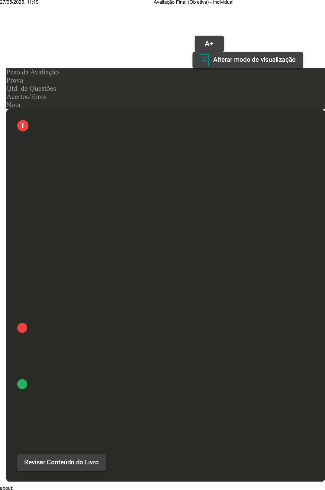 Prova Impressa GABARITO | Avaliação Final (Objetiva) - Individual (Cod.:1025662) Peso da Avaliação 4,00 Prova 98915934 Qtd. de Questões 10 Acertos/Erros 4/6 Nota 4,00 A topologia de rede é um assunto pertinente na configuração de qualquer rede de computador, seja ela doméstica, comercial ou industrial. Tenha em vista que apesar da comunicação se dar pelo meio virtual, essa depende do meio físico para acontecer, por meio de cabos, conexões e componentes eletrônicos. Dessa forma, os integrantes de uma rede, sejam essas os mais diversos equipamentos, como máquinas, interfaces homem-máquina, computadores, smartphones, servidores e outros, são dependentes do posicionamento e conexão física entre eles para que a rede seja efetiva. Logo, surgem as técnicas de disposição física, chamadas de topologias de rede, as quais irão agir de modo a definir alguns aspectos de interação entre os eletrônicos conforme a necessidade encontrada. Fonte: adaptado de: TANENBAUM, A.; FEAMSTER, N.; WETHERALL, D. Redes de computadores. 6. ed. Porto Alegre: Bookman, 2021. A respeito das topologias de redes, analise as afirmativas a seguir: I. Indica o posicionamento físico dos integrantes da rede. II. Emprega a topologia necessária à atividade demandada. III. Apresenta diversas configurações com suas respectivas vantagens e desvantagens. IV. Possibilita a comunicação e interação entre hosts de topologias distintas por uma conexão em comum. É correto o que se afirma em: A III e IV, apenas. B I, apenas. C I, II, III e IV. D I, II e III, apenas. E II e IV, apenas. VOLTAR A+ Alterar modo de visualização 1 Revisar Conteúdo do Livro 27/05/2025, 11:19 Avaliação Final (Objetiva) - Individual about:blank 1/8 As mais diversas redes domésticas de internet estão ligadas a uma série de outros roteadores, nós, utilizados pela empresa provedora do serviço até seu backbone, dessa forma, existe uma malha, parecida com uma teia de aranha, interligando esses roteadores e criando diversos caminhos possíveis. Entretanto, os caminhos são representações do espaço físico, logo, exigem tempo para que sejam percorridos, dessa forma, são aplicados protocolos e algoritmos de identificação e definição de rotas que priorizem o menor custo de transporte, ou seja, percorram a menor quantidade de nós da rede, e que seja viável em questão de tempo. Percebe-se que mesmo que uma rota apresente mais nós que outra, ela será mais custosa que outra que tenha menos nós, entretanto, a mais curta pode estar sobrecarregada de fluxo de informação, tornando-a mais lenta. Fonte: adaptado de: TANENBAUM, A.; FEAMSTER, N.; WETHERALL, D. Redes de Computadores. 6. ed. Porto Alegre: Bookman, 2021. Partindo do breve trecho anterior a respeito dos roteadores e rotas definidas, assinale a alternativa correta: A O caminho pouco importa, uma vez que os dados são transmitidos por fibra ótica. B O caminho escolhido prioriza a maior quantidade de roteadores de rede. C O caminho desejado nem sempre é a melhor escolha entre a malha da rede. D Os roteadores wifi atuam na definição de sub máscara da rede doméstica como salta de nó na rede. E O caminho definido pode não ser o mais curto, entretanto será o mais rápido. A ABNT, Associação Brasileira de Normas Técnicas, é uma entidade responsável pela publicação de diversas normas que abrangem diversos setores no Brasil. Essas normas são produzidas através do estudo de um comitê de especialistas credenciados e qualificados que identificam os principais pontos de atenção para um assunto. A ABNT apresenta a finalidade de disseminar conhecimento a respeito de padronizações por meio da elaboração de documentos, relatórios, manuais, teses e artigos científicos. A adoção das medidas da ABNT garante a qualquer operação credibilidade, além de facilitar a troca de conhecimentos entre diferentes profissionais da área. Fonte: adaptado de: TANENBAUM, A.; FEAMSTER, N.; WETHERALL, D. Redes de computadores. 6. ed. Porto Alegre: Bookman, 2021. A respeito das normas brasileiras, analise as afirmativas a seguir: 2 Revisar Conteúdo do Livro 3 27/05/2025, 11:19 Avaliação Final (Objetiva) - Individual about:blank 2/8 I. Enaltece as boas práticas por meio de publicações normativas. II. Define metodologias de execução técnica via órgão público brasileiro. III. Aplica normas de instalações de cabeamento estruturado em projetos prediais. IV. Identifica os melhores dispositivos disponíveis no mercado e os fabricantes desejados. É correto o que se afirma em: A II e IV, apenas. B III e IV, apenas. C I, II e III, apenas. D I, apenas. E I, II, III e IV. Os sistemas de comunicação são um grande marco na história, pois a partir deles foi possível realizar uma interação entre pessoas que estavam a uma distância considerável entre si. Dessa forma, percebe- se que os sistemas eram necessários e demandavam desenvolvimento contínuo. Tenha em vista que uma ligação, via telefone, envolve dois aparelhos, duas pessoas, uma empresa de telefonia e o assunto que será tratado entre as pessoas durante a chamada, e esse processo todo é denominado comunicação. Há outros meios e métodos como o envio de mensagens por aplicativos de conversa, o envio de vídeos em plataformas que permitem diversos acessos simultâneos ou até mesmo o correio eletrônico, conhecido como e-mail. Fonte: adaptado de: TANENBAUM, A.; FEAMSTER, N.; WETHERALL, D. Redes de computadores. 6. ed. Porto Alegre: Bookman, 2021. Com base nas informações apresentadas, avalie as asserções a seguir e a relação proposta entre elas: I. Os cinco elementos primordiais da comunicação são mensagem, emissor, receptor, meio de transmissão e protocolo. PORQUE II. Os pontos elencados representam os envolvidos no processo de comunicação, contemplando o início e fim das etapas. A respeito dessas asserções, assinale a opção correta: 4 27/05/2025, 11:19 Avaliação Final (Objetiva) 