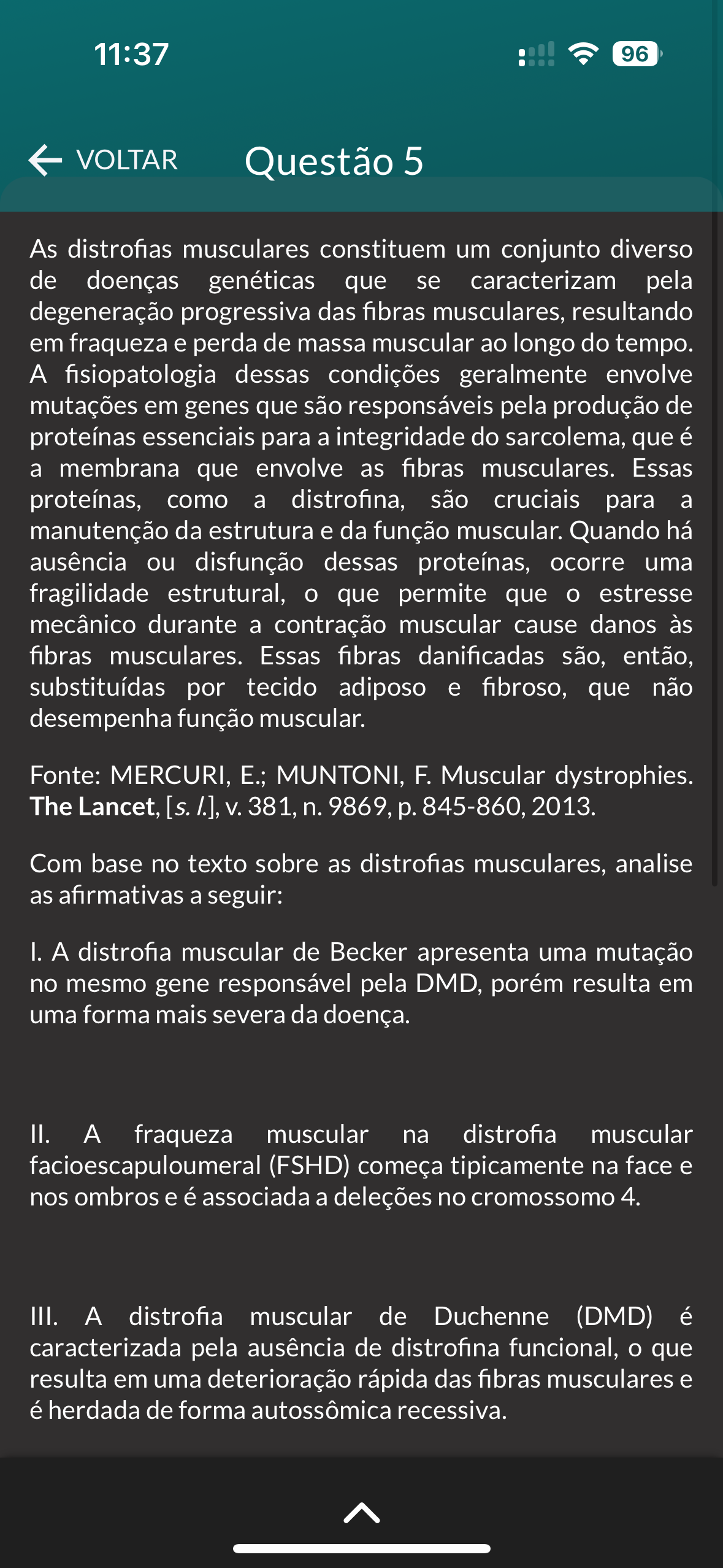 11:37 96 VOLTAR Questão 5 As distrofias musculares constituem um conjunto diverso de doenças genéticas que se caracterizam pela degeneração progressiva das fibras musculares, resultando em fraqueza e perda de massa muscular ao longo do tempo. A fisiopatologia dessas condições geralmente envolve mutações em genes que são responsáveis pela produção de proteínas essenciais para a integridade do sarcolema, que é a membrana que envolve as fibras musculares. Essas proteínas, como a distrofina, são cruciais para a manutenção da estrutura e da função muscular. Quando há ausência ou disfunção dessas proteínas, ocorre uma fragilidade estrutural, O que permite que O estresse mecânico durante a contração muscular cause danos às fibras musculares. Essas fibras danificadas são, então, substituídas por tecido adiposo e fibroso, que não desempenha função muscular. Fonte: MERCURI, E.; MUNTONI, Muscular dystrophies. The Lancet, [s. V. 381, n. 9869, p. 845-860, 2013. Com base no texto sobre as distrofias musculares, analise as afirmativas a seguir: I. A distrofia muscular de Becker apresenta uma mutação no mesmo gene responsável pela DMD, porém resulta em uma forma mais severa da doença. II. A fraqueza muscular na distrofia muscular facioescapuloumeral (FSHD) começa tipicamente na face e nos ombros e é associada a deleções no cromossomo 4. III. A distrofia muscular de Duchenne (DMD) é caracterizada pela ausência de distrofina funcional, O que resulta em uma deterioração rápida das fibras musculares e é herdada de forma autossômica recessiva.