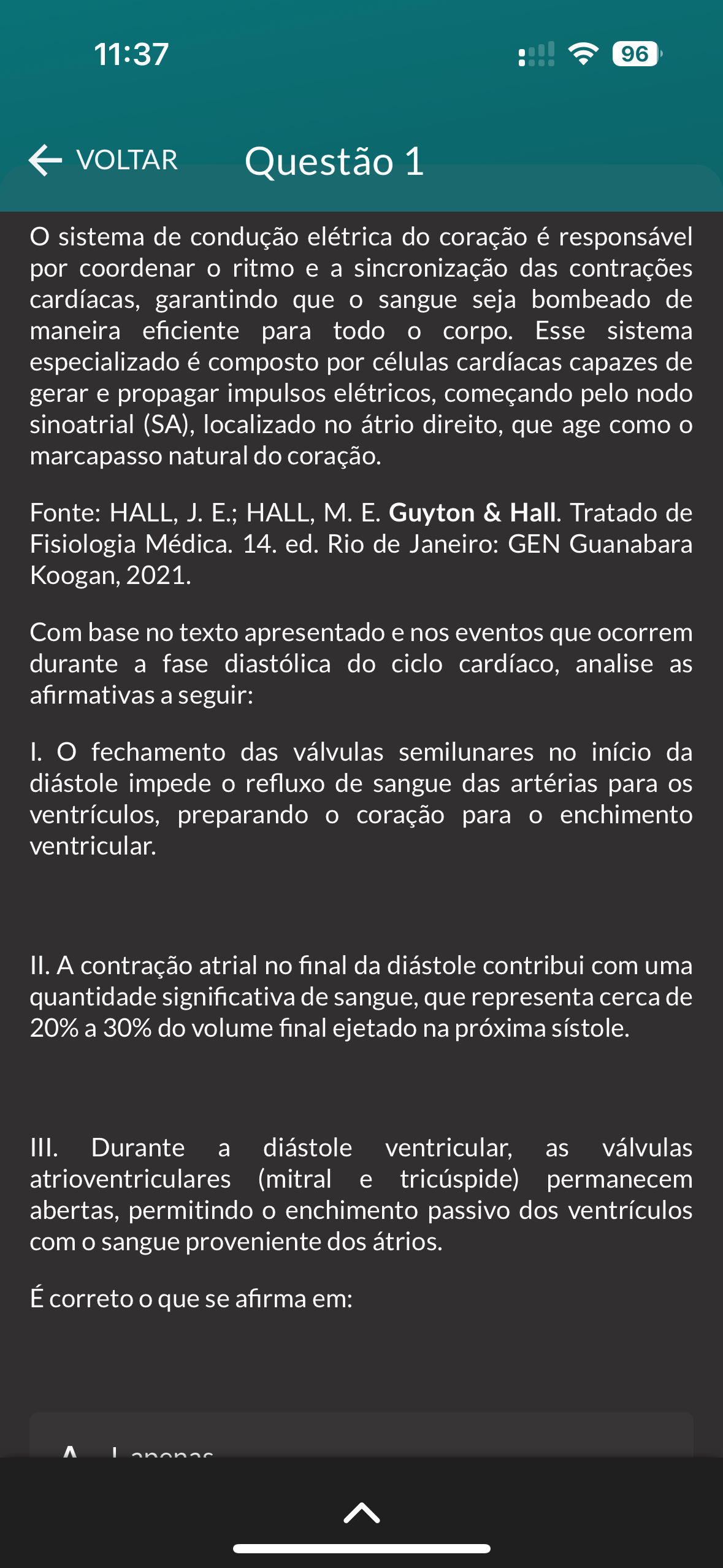 11:37 96 VOLTAR Questão 1 O sistema de condução elétrica do coração é responsável por coordenar O ritmo e a sincronização das contrações cardíacas, garantindo que O sangue seja bombeado de maneira eficiente para todo O corpo. Esse sistema especializado é composto por células cardíacas capazes de gerar e propagar impulsos elétricos, começando pelo nodo sinoatrial (SA), localizado no átrio direito, que age como marcapasso natural do coração. Fonte: HALL, J. E.; HALL, M. E. Guyton & Hall. Tratado de Fisiologia Médica. 14. ed. Rio de Janeiro: GEN Guanabara Koogan, 2021. Com base no texto apresentado e nos eventos que ocorrem durante a fase diastólica do ciclo cardíaco, analise as afirmativas a seguir: I. O fechamento das válvulas semilunares no início da diástole impede refluxo de sangue das artérias para os ventrículos, preparando O coração para O enchimento ventricular. II. A contração atrial no final da diástole contribui com uma quantidade significativa de sangue, que representa cerca de 20% a 30% do volume final ejetado na próxima sístole. III. Durante a diástole ventricular, as válvulas atrioventriculares (mitral e tricúspide) permanecem abertas, permitindo enchimento passivo dos ventrículos com O sangue proveniente dos átrios. É correto O que se afirma em: A