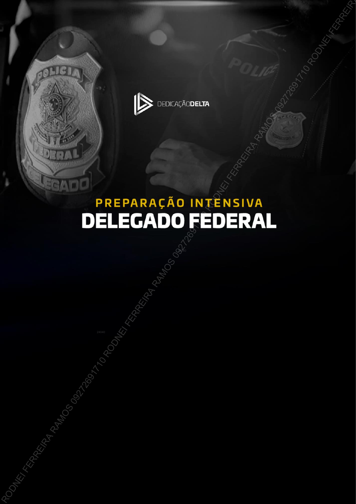 PREPARAÇÃO INTENSIVA DELEGADO FEDERAL 18 SEMANAS 1 APRESENTAÇÃO DO CURSO 24040 24040 R O D N EI F ER R EI R A R AM O S 09 27 26 91 71 0 R O D N EI F ER R EI R A R AM O S 09 27 26 91 71 0 R O D N EI F ER R EI R A R AM O S 09 27 26 91 71 0 R O D N EI F ER R EI R A R AM O S 09 27 26 91 71 0 R O D N EI F ER R EI R A R AM O S 09 27 26 91 71 0 R O D N EI F ER R EI R A R AM O S 09 27 26 91 71 0 R O D N EI F ER R EI R A R AM O S 09 27 26 91 71 0 R O D N EI F ER R EI R A R AM O S 09 27 26 91 71 0 R O D N EI F ER R EI R A R AM O S 09 27 26 91 71 0 R O D N EI F ER R EI R A R AM O S 09 27 26 91 71 0 PREPARAÇÃO INTENSIVA DELEGADO FEDERAL 18 SEMANAS 2 AVISO IMPORTANTE O material será disponibilizado com os dados pessoais do participante, em área de acesso restrita. O compartilhamento indevido de materiais da PREPARAÇÃO INTENSIVA – DELEGADO DE POLÍCIA FEDERAL ensejará a interrupção imediata do serviço, bem como adoção das medidas cabíveis. Qual o formato do curso? A PREPARAÇÃO INTENSIVA – DELEGADO DE POLÍCIA FEDERAL é dividida em 18 semanas, sendo 15 semanas de conteúdo inédito e 3 semanas de revisão (6, 12 e 18). Ao longo do curso, todas disciplinas constantes do edital passado serão contempladas, de forma que o participante tenha contato com todas as matérias de maneira proporcional. Assim, se porventura o edital do concurso for publicado durante a preparação pré-edital, será mais fácil a adequação para o esquema de revisão, caso o participante assim deseje. Diariamente, o aluno terá contato com os 04 pilares da aprovação, os quais são materializados na forma de e-books pensados de forma segmentada para cada pilar. Assim, você iniciará o dia estudando os e-books da doutrina, para depois cumprir as metas dos e-books de legislação, súmulas e jurisprudências. Quais materiais serão disponibilizados neste curso? 1- Doutrina e Questões Objetivas Comentadas – O principal material da nossa preparação consiste na doutrina. Em cada semana você receberá um arquivo com as metas da semana, com a respectiva disponibilização individualizada dos resumos necessários para o cumprimento de cada meta. Perceba que cada meta corresponde a um dia da semana (Meta 1 - Segunda-feira; Meta 2 -Terça-feira, e assim por diante). As questões de concursos anteriores são disponibilizadas na própria plataforma, no formato de avaliação (disponibilizados semanalmente); 2- Lei Seca - Compilamos as principais leis que possuem grande incidência em concursos de Delegado de Polícia e que são específicas para o seu concurso, cujo cronograma foi elaborado com base no último edital (disponibilizados semanalmente); 3- Súmulas por assunto - Este e-book visa orientar nosso aluno, a partir de um cronograma, a realizar uma leitura das principais súmulas dos Tribunais Superiores (disponibilizado integralmente na pasta DD Júris e DD Súmulas); 4- Jurisprudência - Selecionamos os principais julgados mais recentes para facilitar o seu estudo. Com o cronograma criado pela nossa equipe, você estudará os principais informativos de uma maneira constante e leve (disponibilizado integralmente na pasta DD Júris e DD Súmulas). 5- Questões comentadas autorais – Revisão – Como forma de consolidação do estudo, disponibilizaremos nas semanas de revisão (6, 12, 18) questões autorais no formato C e E dos assuntos estudados durante as 6 semanas que antecederam às semanas de revisão; 6- Resumos Topificados - Revisão – Como forma de consolidação do estudo disponibilizaremos nas semanas de revisão (6, 12, 18) resumos topificados dos assuntos estudados durante as semanas anteriores. 24040 24040 R O D N EI F ER R EI R A R AM O S 09 27 26 91 71 0 R O D N EI F ER R EI R A R AM O S 09 27 26 91 71 0 R O D N EI F ER R EI R A R AM O S 09 27 26 91 71 0 R O D N EI F ER R EI R A R AM O S 09 27 26 91 71 0 R O D N EI F ER R EI R A R AM O S 09 27 26 91 71 0 R O D N EI F ER R EI R A R AM O S 09 27 26 91 71 0 R O D N EI F ER R EI R A R AM O S 09 27 26 91 71 0 R O D N EI F ER R EI R A R AM O S 09 27 26 91 71 0 R O D N EI F ER R EI R A R AM O S 09 27 26 91 71 0 R O D N EI F ER R EI R A R AM O S 09 27 26 91 71 0 PREPARAÇÃO INTENSIVA DELEGADO FEDERAL 18 SEMANAS 3 Como eu devo me guiar com este material? Isto é bem intuitivo. Acreditamos que o melhor método de estudo é a partir da edificação de uma base de conhecimento pautada no tripé doutrina – lei seca – jurisprudência, aliada à constante resolução de questões objetivas. Por isso, aconselhamos que se inicie o dia estudando a meta do dia (material de doutrina). No momento do estudo não tente resumir a matéria, pois nossas metas diárias já suprirão esta necessidade. O ideal é que tome notas inteligentes em post-its e façam grifos para a revisão. Notas inteligente são aquelas que sem precisar esgotar o tema faz com que você relembre os principais pontos. A organização das suas anotações é crucial para sua aprovação. Encerrado o estudo da doutrina passe para a resolução dos exercícios (na plataforma). Nossas questões comentadas lhe ajudarão a verificar o porquê do erro. Todavia, caso continue com dúvidas, fique à vontade para nos provocar na nossa Central de Dúvidas, dentro da nossa plataforma. Cumprida esta etapa, é hora de ler a lei seca e as súmulas selecionadas. Tais tarefas não demandarão mais do que 45 minutos. No início da preparação, quando ainda estarão em fase de adaptação com o ritmo de estudo proposto, tais metas possivelmente demandarão um pouco mais de tempo, o qual será reduzido ao longo dos próximos meses. Aos finais de semana, recomendamos que você faça a leitura dos seus grifos e anotações, bem como destaque as assertivas que foram consideradas corretas nas questões da semana. Você pode, também, dar uma atenção especial para os artigos que indicamos no início de cada meta como mais importantes. Além disso, faça também o estudo do nosso e-book de jurisprudência