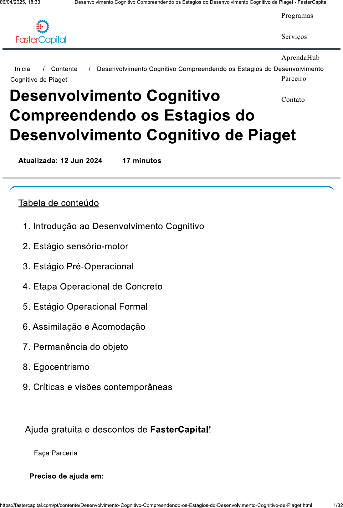 06/04/2025, 18:33 Desenvolvimento Cognitivo Compreendendo os Estagios do Desenvolvimento Cognitivo de Piaget - FasterCapital Programas Serviços AprendaHub Inicial / Contente / Desenvolvimento Cognitivo Compreendendo os Estagios do Desenvolvimento Cognitivo de Piaget Parceiro Desenvolvimento Cognitivo Contato Compreendendo os Estagios do Desenvolvimento Cognitivo de Piaget Atualizada: 12 Jun 2024 17 minutos Tabela de conteúdo 1. Introdução ao Desenvolvimento Cognitivo 2. Estágio sensório-motor 3. Estágio Pré-Operacional 4. Etapa Operacional de Concreto 5. Estágio Operacional Formal 6. Assimilação e Acomodação 7. Permanência do objeto 8. Egocentrismo 9. Críticas e visões contemporâneas Ajuda gratuita e descontos de FasterCapital! Faça Parceria Preciso de ajuda em: 1/3206/04/2025, 18:33 Desenvolvimento Cognitivo Compreendendo os Estagios do Desenvolvimento Cognitivo de Piaget - FasterCapital Selecione uma opção Nome completo nome da empresa Email País Whatsapp Comente Enviar Os envios de e-mail comercial serão respondidos dentro de 1 ou 2 dias úteis. Os envios de e-mails pessoais levarão mais tempo Desenvolvimento Cognitivo Compreendendo os Estágios do Desenvolvimento Cognitivo de Piaget 1. Introdução ao Desenvolvimento Cognitivo 1. Fundamentos do Desenvolvimento Cognitivo: - O desenvolvimento cognitivo refere-se à progressão gradual das habilidades mentais, incluindo percepção, memória, raciocínio, resolução de problemas e aquisição da linguagem. Abrange tanto a maturação 2/3206/04/2025 18:33 Desenvolvimento Cognitivo Compreendendo os Estagios do Desenvolvimento Cognitivo de Piaget FasterCapital biológica quanto as influências ambientais. - Natureza versus Criação: O debate entre predisposição genética (natureza) e experiências ambientais (criação) impacta significativamente o desenvolvimento cognitivo. Embora os genes forneçam o modelo, as experiências moldam a mente. - Influência de Piaget: psicólogo suíço Jean Piaget revolucionou nossa compreensão do desenvolvimento cognitivo. Sua teoria enfatiza os estágios pelos quais as crianças passam, cada um caracterizado por habilidades cognitivas distintas. 2. As etapas de Piaget revisitadas: - Estágio Sensorimotor (0-2 anos): - Os bebês exploram o mundo por meio de experiências sensoriais e ações motoras. - Exemplo: Um bebê sacudindo um chocalho para entender causa e efeito. - Estágio Pré-Operacional (2-7 anos): - Surge o pensamento simbólico, mas a lógica permanece limitada. - Prevalece o egocentrismo, levando a criança a perceber o mundo a partir do seu ponto de vista. - Exemplo: Uma criança finge que uma caixa de papelão é uma nave espacial. - Estágio Operacional Concreto (7-11 anos): - O raciocínio lógico melhora e as crianças aprendem a conservação (a quantidade permanece constante apesar das mudanças na aparência). - Exemplo: Entender que despejar água de um copo largo para um copo alto não altera a quantidade. - Estágio Operacional Formal (11+ anos): - O pensamento abstrato floresce, permitindo o raciocínio hipotético. 3/3206/04/2025, 18:33 Desenvolvimento Cognitivo Compreendendo os Estagios do Desenvolvimento Cognitivo de Piaget - FasterCapital - Exemplo: Resolver equações algébricas ou ponderar questões filosóficas. 3. Perspectiva Sociocultural de Vygotsky: - O psicólogo russo Lev Vygotsky enfatizou as interações sociais e o contexto cultural no desenvolvimento cognitivo. - Zona de Desenvolvimento Proximal (ZPD): A lacuna entre o que um aluno pode fazer de forma independente e o que pode alcançar com orientação. O apoio de adultos ou colegas facilita a ZDP. - Exemplo: Uma criança aprendendo a amarrar cadarços com a ajuda dos pais. 4. Modelo de Processamento de Informação: - Análogo a um computador, este modelo vê a cognição como processamento de informação. - Codificação: Transformar informações sensoriais em representações mentais significativas. - Armazenamento: Retenção de informações ao longo do tempo. - Recuperação: Acessar informações armazenadas quando necessário. - Exemplo: Lembrar o número de telefone de um amigo codificando-o como dígitos. 5. Cognição Social e Teoria da Mente: - Teoria da Mente: Compreender que os outros têm crenças, desejos e intenções diferentes dos nossos. - Exemplo: Perceber que um amigo pode ficar triste porque seu animal de estimação fugiu. - Empatia: Reconhecer e compartilhar as emoções dos outros. - Exemplo: Confortando um colega chorando. 4/3206/04/2025, 18:33 Desenvolvimento Cognitivo Compreendendo os Estagios do Desenvolvimento Cognitivo de Piaget - FasterCapital 6. Variações Culturais: - O desenvolvimento cognitivo varia entre culturas devido a diversas práticas, crenças e sistemas educacionais. - Exemplo: As crianças em culturas coletivistas podem priorizar a harmonia do grupo em detrimento das realizações individuais. 7. Implicações e aplicações: - Educação: Adaptar os métodos de ensino aos estágios cognitivos melhora a aprendizagem. - Paternidade: compreender os marcos do desenvolvimento orienta uma paternidade eficaz. - Tecnologia: Ferramentas digitais impactam processos cognitivos; o tempo de tela afeta a capacidade de atenção. Em resumo, o desenvolvimento cognitivo é uma jornada multifacetada influenciada pela natureza, pela criação e pelo contexto cultural. À medida que exploramos os estágios de Piaget, os insights de Vygotsky e as complexidades do processamento da informação, adquirimos uma apreciação mais profunda das maravilhas da mente humana. 5/3206/04/2025, 18:33 Desenvolvimento Cognitivo Compreendendo os Estagios do Desenvolvimento Cognitivo de Piaget - FasterCapital Introdução ao Desenvolvimento Cognitivo As etapas de Modelo de Variações Piaget Processamento Culturais revisitadas Informação B F A C E G Implicações e aplicações Fundamentos Perspectiva Cognição do Sociocultural Social e Teoria Desenvolvimer de Vygots