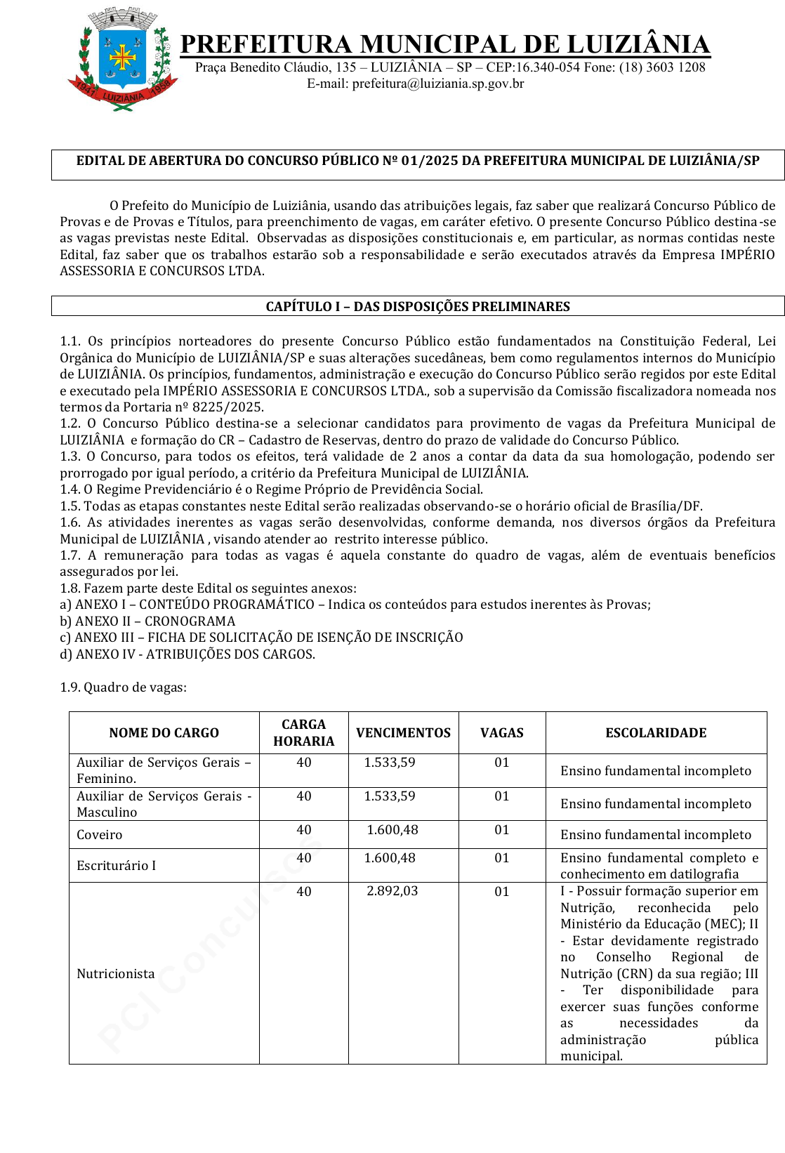 pcimarkpci MjgwNDowN2YwOmQ4MjM6MDE5ZDo2NDc2OjJhMzc6NDBhOTo2Mzc5:V2VkLCAxNCBNYXkgMjAyNSAyMTo0OTo1NCAtMDMwMA== www.pciconcursos.com.br PREFEITURA MUNICIPAL DE LUIZIÂNIA Praça Benedito Cláudio, 135 – LUIZIÂNIA – SP – CEP:16.340-054 Fone: (18) 3603 1208 E-mail: prefeitura@luiziania.sp.gov.br EDITAL DE ABERTURA DO CONCURSO PÚBLICO Nº 01/2025 DA PREFEITURA MUNICIPAL DE LUIZIÂNIA/SP O Prefeito do Município de Luiziânia, usando das atribuições legais, faz saber que realizará Concurso Público de Provas e de Provas e Títulos, para preenchimento de vagas, em caráter efetivo. O presente Concurso Público destina-se as vagas previstas neste Edital. Observadas as disposições constitucionais e, em particular, as normas contidas neste Edital, faz saber que os trabalhos estarão sob a responsabilidade e serão executados através da Empresa IMPÉRIO ASSESSORIA E CONCURSOS LTDA. CAPÍTULO I – DAS DISPOSIÇÕES PRELIMINARES 1.1. Os princípios norteadores do presente Concurso Público estão fundamentados na Constituição Federal, Lei Orgânica do Município de LUIZIÂNIA/SP e suas alterações sucedâneas, bem como regulamentos internos do Município de LUIZIÂNIA. Os princípios, fundamentos, administração e execução do Concurso Público serão regidos por este Edital e executado pela IMPÉRIO ASSESSORIA E CONCURSOS LTDA., sob a supervisão da Comissão fiscalizadora nomeada nos termos da Portaria nº 8225/2025. 1.2. O Concurso Público destina-se a selecionar candidatos para provimento de vagas da Prefeitura Municipal de LUIZIÂNIA e formação do CR – Cadastro de Reservas, dentro do prazo de validade do Concurso Público. 1.3. O Concurso, para todos os efeitos, terá validade de 2 anos a contar da data da sua homologação, podendo ser prorrogado por igual período, a critério da Prefeitura Municipal de LUIZIÂNIA. 1.4. O Regime Previdenciário é o Regime Próprio de Previdência Social. 1.5. Todas as etapas constantes neste Edital serão realizadas observando-se o horário oficial de Brasília/DF. 1.6. As atividades inerentes as vagas serão desenvolvidas, conforme demanda, nos diversos órgãos da Prefeitura Municipal de LUIZIÂNIA , visando atender ao restrito interesse público. 1.7. A remuneração para todas as vagas é aquela constante do quadro de vagas, além de eventuais benefícios assegurados por lei. 1.8. Fazem parte deste Edital os seguintes anexos: a) ANEXO I – CONTEÚDO PROGRAMÁTICO – Indica os conteúdos para estudos inerentes às Provas; b) ANEXO II – CRONOGRAMA c) ANEXO III – FICHA DE SOLICITAÇÃO DE ISENÇÃO DE INSCRIÇÃO d) ANEXO IV - ATRIBUIÇÕES DOS CARGOS. 1.9. Quadro de vagas: NOME DO CARGO CARGA HORARIA VENCIMENTOS VAGAS ESCOLARIDADE Auxiliar de Serviços Gerais – Feminino. 40 1.533,59 01 Ensino fundamental incompleto Auxiliar de Serviços Gerais - Masculino 40 1.533,59 01 Ensino fundamental incompleto Coveiro 40 1.600,48 01 Ensino fundamental incompleto Escriturário I 40 1.600,48 01 Ensino fundamental completo e conhecimento em datilografia Nutricionista 40 2.892,03 01 I - Possuir formação superior em Nutrição, reconhecida pelo Ministério da Educação (MEC); II - Estar devidamente registrado no Conselho Regional de Nutrição (CRN) da sua região; III - Ter disponibilidade para exercer suas funções conforme as necessidades da administração pública municipal. pcimarkpci MjgwNDowN2YwOmQ4MjM6MDE5ZDo2NDc2OjJhMzc6NDBhOTo2Mzc5:V2VkLCAxNCBNYXkgMjAyNSAyMTo0OTo1NCAtMDMwMA== www.pciconcursos.com.br PREFEITURA MUNICIPAL DE LUIZIÂNIA Praça Benedito Cláudio, 135 – LUIZIÂNIA – SP – CEP:16.340-054 Fone: (18) 3603 1208 E-mail: prefeitura@luiziania.sp.gov.br Operador de Máquina 40 1.889,79 01 Ensino fundamental completo, CNH categoria D ou E. Professor de Educação Básica II – Artes 30 3.652,20 01 Licenciatura Plena em Arte. VALOR DA TAXA DE INSCRIÇÃO – R$ NÍVEL SUPERIOR: 80,00 ENSINO FUNDAMENTAL: 35,00 1.10. Para preenchimento das vagas surgidas dentro do prazo de validade deste certame, será rigorosamente observada a ordem da classificação final, e, proporcionalmente ao declarado no Capítulo V, deste Edital. 1.11. O horário de trabalho e a lotação do profissional ficarão a critério da prefeitura municipal. CAPÍTULO II – DAS INSCRIÇÕES 2.1. A inscrição do candidato implica no conhecimento prévio e na tácita e expressa aceitação das instruções e normas estabelecidas neste Edital e seus Anexos e será realizada no período compreendido entre as 08h00min do dia 13 até às 23h59min 23 de maio de 2025 através do site https://portal.imperioconcursos.com.br, (conforme Anexo II). 2.1.1. A inscrição do candidato implica no conhecimento prévio e na tácita e expressa aceitação das instruções e normas estabelecidas neste Edital e seus Anexos. 2.2. As inscrições ficarão abertas e serão efetuadas exclusivamente pela internet, através do site https://portal.imperioconcursos.com.br, no período descrito conforme cronograma no ANEXO II. 2.3. Para efetuar a inscrição, o candidato deverá: a) Acessar o site https://portal.imperioconcursos.com.br e clicar na área destinada ao Concurso Público da Prefeitura do Município de LUIZIÂNIA. b) Em seguida clicar em “Realizar inscrição”, após a aceitação, o interessado deverá primeiramente realizar o seu cadastro no site do https://portal.imperioconcursos.com.br e posteriormente realizar a inscrição para o cargo desejado. c) A seguir, o interessado deverá imprimir o boleto bancário para pagamento em qualquer agência bancária ou terminal de auto atendimento. Caso necessite de 2º via do boleto bancário, o candidato deverá acessar o site https://portal.imperioconcursos.com.br e realizar a impressão através da Área do candidato. d) Para confirmar o deferimento da inscrição veja o Capítulo IV deste Edital. 2.3.1. Condições para inscrição: a) Ser Brasileiro nato ou naturalizado, conforme disposto na Constituição Federal, em 