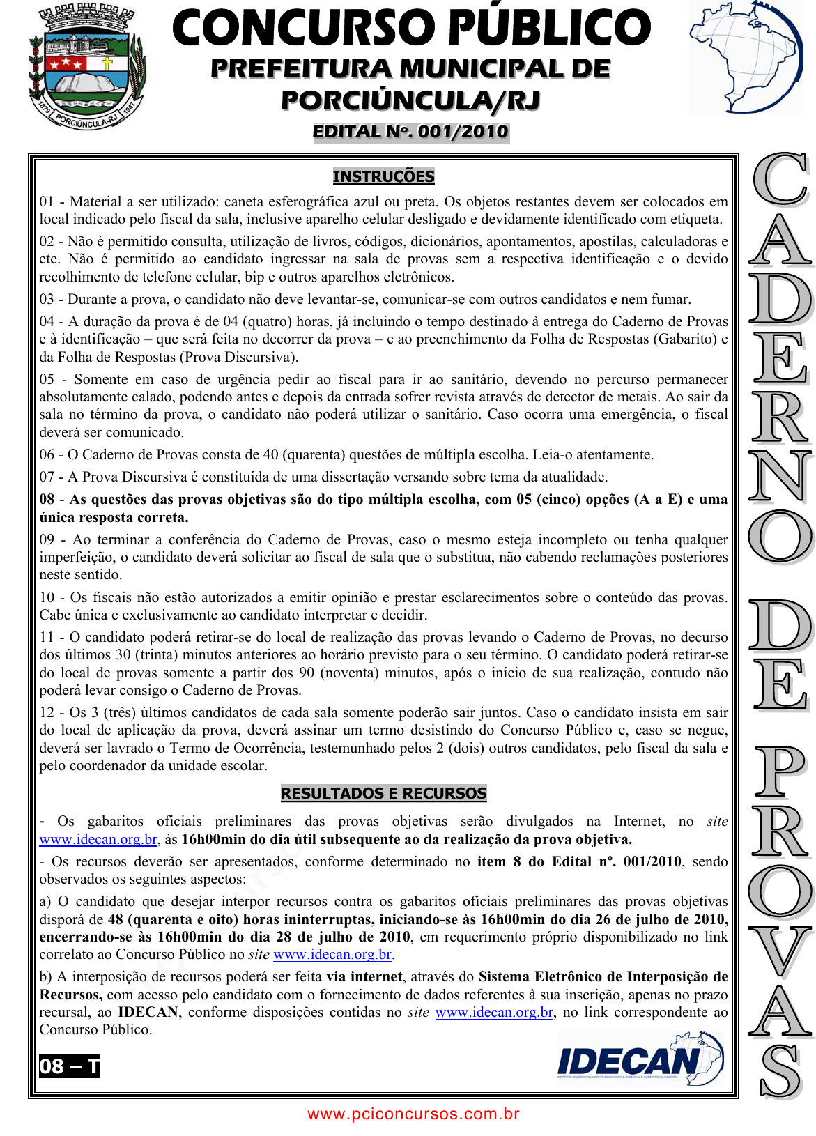 pcimarkpci MDAwMDowMDAwOjAwMDA6MDAwMDowMDAwOmZmZmY6YmIxMzpiMjc5:U2F0LCAyNiBBcHIgMjAyNSAxNzoyNDo0MiAtMDMwMA== www.pciconcursos.com.br PPPRRREEEFFFEEEIIITTTUUURRRAAA MMMUUUNNNIIICCCIIIPPPAAALLL DDDEEE PPPOOORRRCCCIIIÚÚÚNNNCCCUUULLLAAA///RRRJJJ EEEDDDIIITTTAAALLL NNNººº... 000000111///222000111000 INSTRUÇÕES 01 - Material a ser utilizado: caneta esferográfica azul ou preta. Os objetos restantes devem ser colocados em local indicado pelo fiscal da sala, inclusive aparelho celular desligado e devidamente identificado com etiqueta. 02 - Não é permitido consulta, utilização de livros, códigos, dicionários, apontamentos, apostilas, calculadoras e etc. Não é permitido ao candidato ingressar na sala de provas sem a respectiva identificação e o devido recolhimento de telefone celular, bip e outros aparelhos eletrônicos. 03 - Durante a prova, o candidato não deve levantar-se, comunicar-se com outros candidatos e nem fumar. 04 - A duração da prova é de 04 (quatro) horas, já incluindo o tempo destinado à entrega do Caderno de Provas e à identificação – que será feita no decorrer da prova – e ao preenchimento da Folha de Respostas (Gabarito) e da Folha de Respostas (Prova Discursiva). 05 - Somente em caso de urgência pedir ao fiscal para ir ao sanitário, devendo no percurso permanecer absolutamente calado, podendo antes e depois da entrada sofrer revista através de detector de metais. Ao sair da sala no término da prova, o candidato não poderá utilizar o sanitário. Caso ocorra uma emergência, o fiscal deverá ser comunicado. 06 - O Caderno de Provas consta de 40 (quarenta) questões de múltipla escolha. Leia-o atentamente. 07 - A Prova Discursiva é constituída de uma dissertação versando sobre tema da atualidade. 08 - As questões das provas objetivas são do tipo múltipla escolha, com 05 (cinco) opções (A a E) e uma única resposta correta. 09 - Ao terminar a conferência do Caderno de Provas, caso o mesmo esteja incompleto ou tenha qualquer imperfeição, o candidato deverá solicitar ao fiscal de sala que o substitua, não cabendo reclamações posteriores neste sentido. 10 - Os fiscais não estão autorizados a emitir opinião e prestar esclarecimentos sobre o conteúdo das provas. Cabe única e exclusivamente ao candidato interpretar e decidir. 11 - O candidato poderá retirar-se do local de realização das provas levando o Caderno de Provas, no decurso dos últimos 30 (trinta) minutos anteriores ao horário previsto para o seu término. O candidato poderá retirar-se do local de provas somente a partir dos 90 (noventa) minutos, após o início de sua realização, contudo não poderá levar consigo o Caderno de Provas. 12 - Os 3 (três) últimos candidatos de cada sala somente poderão sair juntos. Caso o candidato insista em sair do local de aplicação da prova, deverá assinar um termo desistindo do Concurso Público e, caso se negue, deverá ser lavrado o Termo de Ocorrência, testemunhado pelos 2 (dois) outros candidatos, pelo fiscal da sala e pelo coordenador da unidade escolar. RESULTADOS E RECURSOS - Os gabaritos oficiais preliminares das provas objetivas serão divulgados na Internet, no site www.idecan.org.br, às 16h00min do dia útil subsequente ao da realização da prova objetiva. - Os recursos deverão ser apresentados, conforme determinado no item 8 do Edital nº. 001/2010, sendo observados os seguintes aspectos: a) O candidato que desejar interpor recursos contra os gabaritos oficiais preliminares das provas objetivas disporá de 48 (quarenta e oito) horas ininterruptas, iniciando-se às 16h00min do dia 26 de julho de 2010, encerrando-se às 16h00min do dia 28 de julho de 2010, em requerimento próprio disponibilizado no link correlato ao Concurso Público no site www.idecan.org.br. b) A interposição de recursos poderá ser feita via internet, através do Sistema Eletrônico de Interposição de Recursos, com acesso pelo candidato com o fornecimento de dados referentes à sua inscrição, apenas no prazo recursal, ao IDECAN, conforme disposições contidas no site www.idecan.org.br, no link correspondente ao Concurso Público. 08 – T www.pciconcursos.com.br pcimarkpci MDAwMDowMDAwOjAwMDA6MDAwMDowMDAwOmZmZmY6YmIxMzpiMjc5:U2F0LCAyNiBBcHIgMjAyNSAxNzoyNDo0MiAtMDMwMA== www.pciconcursos.com.br CCCOOONNNCCCUUURRRSSSOOO PPPÚÚÚBBBLLLIIICCCOOO ––– PPPRRREEEFFFEEEIIITTTUUURRRAAA MMMUUUNNNIIICCCIIIPPPAAALLL DDDEEE PPPOOORRRCCCIIIÚÚÚNNNCCCUUULLLAAA///RRRJJJ PROFESSOR B – MATEMÁTICA www.idecan.org.br atendimento@idecan.org.br - 2 - CCCAAARRRGGGOOO::: PPPRRROOOFFFEEESSSSSSOOORRR BBB ––– MMMAAATTTEEEMMMÁÁÁTTTIIICCCAAA TEXTO: A escola na era da tecnologia As sociedades contemporâneas estão tornando a informação acessível a um número cada vez maior de pessoas. A expressão mais avançada desse processo é a internet. Essa tecnologia está provocando uma mudança de paradigma na produção e na divulgação do conhecimento: ele não será mais monopólio das instituições tradicionalmente depositárias. Nesse contexto, vale a pena pensar no novo papel do professor e da escola, que não são mais as únicas fontes de informação dos jovens. O educador assume agora a função de conectar os conteúdos curriculares com conhecimentos que vêm de fora da escola e de ajudar os alunos a relacionar o aprendizado com o mundo. Não conseguindo transmitir informações com a mesma velocidade e atratividade da TV ou da internet, a escola deve dedicar-se à função mais nobre de construir um quadro de referência dos saberes científicos, culturais e éticos, dando sentido ao conhecimento e levando-o para a prática. Mestres como John Dewey (1859 – 1952), Jean Piaget (1896 – 1980), Lev Vygotsky (1896 – 1934) e Celestin Freinet (1896 – 1966) propuseram isso. Antes deles, Sócrates (469 – 399 a.C.) já relacionava o saber com a virtude. Talvez a tecnologia da informação possa contribuir para tornar reais utopias pe