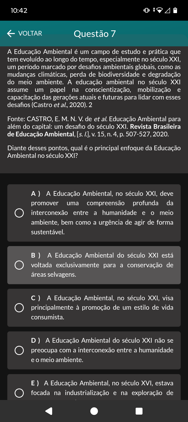 10:42 VOLTAR Questão 7 A Educação Ambiental é um campo de estudo e prática que tem evoluído ao longo do tempo, especialmente no século XXI, um período marcado por desafios ambientais globais, como as mudanças climáticas, perda de biodiversidade e degradação do meio ambiente. A educação ambiental no século XXI assume um papel na conscientização, mobilização e capacitação das gerações atuais e futuras para lidar com esses desafios (Castro et al., 2020). 2 Fonte: CASTRO, E. M. N. V. de et al. Educação Ambiental para além do capital: um desafio do século XXI. Revista Brasileira de Educação Ambiental, [s. V. 15, n. 4, p. 507-527, 2020. Diante desses pontos, qual é principal enfoque da Educação Ambiental no século XXI? A A Educação Ambiental, no século XXI, deve promover uma compreensão profunda da interconexão entre a humanidade e meio ambiente, bem como a urgência de agir de forma sustentável. B ) A Educação Ambiental do século XXI está voltada exclusivamente para a conservação de áreas selvagens. ) A Educação Ambiental, no século XXI, visa principalmente à promoção de um estilo de vida consumista. D) A Educação Ambiental do século XXI não se preocupa com a interconexão entre a humanidade e meio ambiente. E) A Educação Ambiental, no século XVI, estava focada na industrialização e na exploração de
