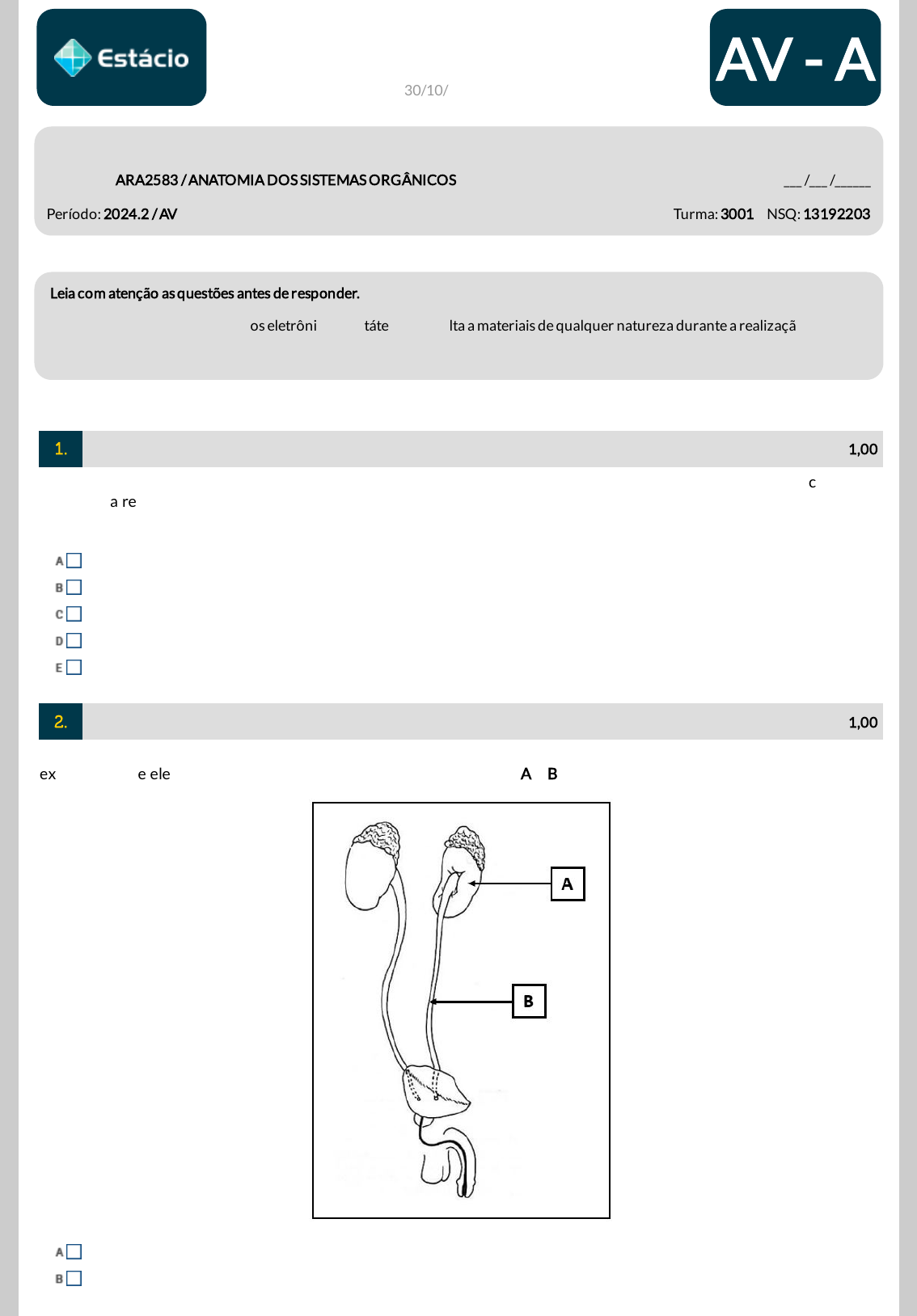 7040555520 AV - A 30/10/2024 13:18 Nome: Matrícula: ____________________ Disciplina: ARA2583 / ANATOMIA DOS SISTEMAS ORGÂNICOS Data: ___ /___ /______ Período: 2024.2 / AV Turma: 3001 NSQ: 13192203 Leia com atenção as questões antes de responder. É proibido o uso de equipamentos eletrônicos portáteis e consulta a materiais de qualquer natureza durante a realização da prova. Boa prova. 1. _______ de 1,00 O sistema genital é um conjunto de órgãos responsáveis pela produção de gametas e hormônios sexuais, tendo como �nalidade a reprodução da espécie. No sistema genital masculino como é denominado a estrutura responsável pela produção dos espermatozoides? Testículos Próstata Ducto deferente Epidídimo Vesícula seminal 2. _______ de 1,00 A imagem abaixo representa os órgãos e elementos constituintes do sistema urinário humano, evidenciando a relação existente entre eles. Os elementos e/ou órgãos indicados pelas letras A e B são denominados, respectivamente, de: rim e ureter. bexiga urinária e ureter. ureter e uretra. rim e uretra. bexiga urinária e uretra. 3. _______ de 1,00 O sistema digestório humano é formado por um longo tubo musculoso, ao qual estão associados órgãos e glândulas que participam da digestão. São eles, EXCETO: C) Esôfago. B) Faringe. E) Estômago A) Boca. D) Traqueia. 4. _______ de 1,00 O sistema nervoso central divide-se em ______ e _______, que se encontram dentro do crânio e do canal vertebral. Esta porção é especializada na recepção e interpretação de estímulos, de comando e desencadeadora de respostas Assinale a alternativa que completa corretamente as lacunas: Ponte e Cérebro Cone Medular e Encéfalo Encéfalo e Cone Medular Cerebelo e Meninges Encéfalo e Medula espinhal 5. _______ de 1,00 Quais são as camadas do coração (0.8 décimos)? (c) Perimétrio, Miométrio e Endométrio. (b) Periósteo, Miocárdio e Endocárdio. (e) Pericárdio, Miométrio e Endocárdio. (a) Perimísio, Miomísio e Endomísio. (d) Pericárdio, Miocárdio e Endocárdio. 6. _______ de 1,00 Qual das alternativas abaixo descreve corretamente uma função do sistema linfático? O sistema linfático armazena glicose. O sistema linfático desempenha um papel na defesa do organismo contra infecções. O sistema linfático é o principal responsável pela digestão de alimentos. O sistema linfático transporta oxigênio para os tecidos do corpo. O sistema linfático é responsável pela produção de hormônios. 7. _______ de 1,00 Qual das opções a seguir descreve corretamente a função das artérias coronárias no sistema cardiovascular? Conduzem sangue rico em oxigênio para nutrir o músculo cardíaco. Fornecem sangue oxigenado diretamente para o cérebro. São responsáveis por transportar sangue pobre em oxigênio de volta ao coração. Campus: POLO PETRÓPOLIS - RJ Prova Impressa em 30/10/2024 por WELINGTON MARCELO RODRIGUES Ref.: 7040555520 Prova Montada em 29/10/2024 Transportam sangue rico em oxigênio para os pulmões. Transportam sangue rico em dióxido de carbono do coração para os tecidos corporais. 8. _______ de 1,00 Qual das alternativas abaixo descreve corretamente uma função do sistema osteomioarticular? Filtração de toxinas do sangue. Suporte estrutural ao corpo e proteção de órgãos vitais. Regulação da temperatura corporal durante o exercício. Armazenamento de nutrientes essenciais para a energia muscular. Produção de hormônios que regulam o metabolismo. 9. _______ de 1,00 Qual das alternativas abaixo é verdadeira em relação à anatomia do sistema respiratório? O diafragma é um músculo que não participa da respiração. Os brônquios se rami�cam em estruturas menores chamadas alvéolos. Os pulmões estão localizados na cavidade abdominal. A faringe é o local onde ocorre a troca gasosa. O nariz é responsável apenas pela umidi�cação do ar. 10. _______ de 1,00 Qual das alternativas abaixo descreve corretamente uma função do sistema cardiovascular? O sistema cardiovascular não tem papel na regulação da temperatura corporal. O coração é composto por quatro câmaras: dois átrios e duas ventrículos. As artérias são responsáveis por levar sangue venoso para o coração. As veias transportam sangue oxigenado do coração para os órgãos. O sistema cardiovascular é responsável apenas pela respiração.