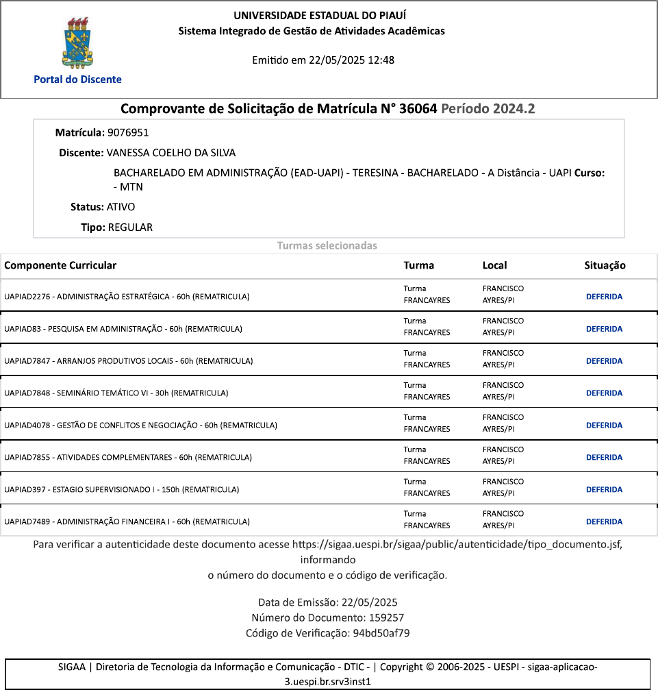 UNIVERSIDADE ESTADUAL DO PIAUÍ Sistema Integrado de Gestão de Atividades Acadêmicas Emitido em 22/05/2025 12:48 Portal do Discente Comprovante de Solicitação de Matrícula N° 36064 Período 2024.2 Matrícula: 9076951 Discente: VANESSA COELHO DA SILVA BACHARELADO EM ADMINISTRAÇÃO (EAD-UAPI) TERESINA BACHARELADO A Distância UAPI Curso: MTN Status: ATIVO Tipo: REGULAR Turmas selecionadas Componente Curricular Turma Local Situação Turma FRANCISCO UAPIAD2276 ADMINISTRAÇÃO ESTRATÉGICA 60h (REMATRICULA) DEFERIDA FRANCAYRES AYRES/PI Turma FRANCISCO UAPIAD83 PESQUISA EM ADMINISTRAÇÃO 60h (REMATRICULA) AYRES/PI DEFERIDA FRANCAYRES Turma FRANCISCO UAPIAD7847 ARRANJOS PRODUTIVOS LOCAIS 60h (REMATRICULA) DEFERIDA FRANCAYRES AYRES/PI Turma FRANCISCO UAPIAD7848 SEMINÁRIO TEMÁTICO VI 30h (REMATRICULA) FRANCAYRES AYRES/PI DEFERIDA Turma FRANCISCO UAPIAD4078 GESTÃO DE CONFLITOS E NEGOCIAÇÃO 60h (REMATRICULA) DEFERIDA FRANCAYRES AYRES/PI Turma FRANCISCO UAPIAD7855 - ATIVIDADES COMPLEMENTARES 60h (REMATRICULA) FRANCAYRES AYRES/PI DEFERIDA Turma FRANCISCO UAPIAD397 ESTAGIO SUPERVISIONADO 150h (REMATRICULA) DEFERIDA FRANCAYRES AYRES/PI Turma FRANCISCO UAPIAD7489 ADMINISTRAÇÃO FINANCEIRA 60h (REMATRICULA) DEFERIDA FRANCAYRES AYRES/PI Para verificar a autenticidade deste documento acesse informando o número do documento e o código de verificação. Data de Emissão: 22/05/2025 Número do Documento: 159257 Código de Verificação: 94bd50af79 SIGAA Diretoria de Tecnologia da Informação e Comunicação DTIC Copyright © 2006-2025 - UESPI - sigaa-aplicacao- 3.uespi.br.srv3inst1DO GOVERNO DO ESTADO DO PIAUÍ UNIVERSIDADE ESTADUAL DO PIAUÍ - UESPI PRÓ-REITORIA DE ENSINO DE GRADUAÇÃO - PREG DEPARTAMENTO DE ASSUNTOS PEDAGÓGICOS DAP DIVISÃO DE ESTÁGIO CURRICULAR SUPERVISIONADO OBRIGATÓRIO FICHA DE INSCRIÇÃO DE ESTÁGIO OBRIGATÓRIO Estagiário(a): Vanessa Coêlho da Silva Data de nascimento: 16/12/1992 CPF: 053.970.983-29 Matrícula: 9076951 RG:053.970.983-29 Curso: Bacharelo em Administração Período: 6° Turno: Diurno Disciplina: ESTÁGIO CURRICULAR SUPERVISIONADO OBRIGATÓRIO End. Residencial: Rua Albino N° 206 Fone: (89) 99456-0324 Cidade: Francisco Ayres - PI Local de Estágio: Farmacity Endereço do Estágio: Rua José Ferreira, N° 388 Supervisor do Estágio (local): Isidorio Nunes e Silva Professor Supervisor do Estágio (UESPI): Márcio Luciano Pereira Batista Horário de Estágio: 14:00h às 18:00h Data de Inscrição do Estágio: 19 / Maio / 2025 Documento assinado digitalmente gov.br VANESSA COELHO DA SILVA Data: 22/05/2025 12:46:49-0300 Verifique em https://validar.iti.gov.br Estagiário (a): MUDANÇA DE LOCAL DO ESTÁGIO Local de Estágio: Endereço do Estágio: Fone: Horário de Estágio: Supervisor do Estágio (local): Supervisor do Estágio na UESPI: Data: / /Estagiário (a) Rua João Cabral, 2231 - Bairro Pirajá - CEP: 64.002-150 - Teresina - Piauí - Brasil Fones: Central (86) 3213-7150 (Ramal: 343) Fone/Fax PREG: 3213-7801 e-mail: dap@uespi.br Site: www.uespi.brGOVERNO DO ESTADO DO PIAUÍ UNIVERSIDADE ESTADUAL DO PIAUÍ - UESPI PRÓ-REITORIA DE ENSINO DE GRADUAÇÃO - PREG DEPARTAMENTO DE ASSUNTOS PEDAGÓGICOS - DAP DIVISÃO DE ESTÁGIO SUPERVISIONADO OBRIGATÓRIO - DES SEMESTRE 2024/2 TERMO DE COMPROMISSO Termo de Compromisso de Estágio Obrigatório sem vínculo empregatício, nos termos da Lei Federal n° 11.788, de25 de setembro de 2008 e Resolução CEPEX/UESPI n° 004/2021, a ser assinado pelas partes convenentes e pelo aluno, em 03 (três) vias, com a finalidade de proporcionar formação a estudantes que entre si celebram as partes a seguir nomeadas: - INSTITUIÇÃO DE ENSINO FUNDAÇÃO UNIVERSIDADE ESTADUAL DO PIAUÍ - FUESPI CAMPUS/NÚCLEO- Polo da UAPI/ Francisco Ayres ENDEREÇO: Rua João Cabral, 2231 - Bairro Pirajá- CEP 64.001-030 CIDADE/UF: Teresina - Piauí TELEFONE: (86) 3213-7441 EMAIL: coord.cursouapi3@nead.uespi.br REPRESENTANTE LEGAL/FUNÇÃO: Mônica Maria Feitosa Braga Gentil - Pró-Reitora de Ensino de Graduação 2 - INSTITUIÇÃO CONCEDENTE/EMPRESA RAZÃO SOCIAL: Isidorio Junior Nunes e Silva ENDEREÇO: Rua Jose Ferreira, 388 BAIRRO: Centro UF.: Piauí REPRESENTANTE LEGAL: Isidorio Junior Nunes e Silva CARGO: Gerente Administrativo TELEFONE: (89) 9.9416-1524 SUPERVISOR DE CAMPO: Isidorio Junior Nunes e Silva TELEFONE (S): (89) 9.9416-1524 EMAIL: junior281186@hotmail.com Rua João Cabral, 2231 - Bairro Pirajá Cep: 64.002-150 - Teresina - Piauí - Brasil Fones: Central (86) 3213-7150 (Ramal 343) site: www.uespi.br Fone/Fax PREG: 3213-7801 e-mail: dap@preg.uespi.br3 - ESTAGIÁRIO NOME: Vanessa Coêlho da Silva IDENTIDADE: 053.970.983-29 ORGÃO EMISSOR:SSP/ PI CPF: 053.970.983-29 DATA DE NASCIMENTO: 16/12/1992 ENDEREÇO: Rua João Albino,206 CIDADE/UF: Francisco Ayres - Piauí CEP: 64.475-000 EMAIL: vanessacoelho1712@gmail.co TELEFONE: (89) 99456-0324 CURSO: Bacharel em Administração PERÍODO: 6° 4 PROFESSOR ORIENTADOR Márcio Luciano Pereira Batista MAIL:mlpbatista@gmail.com 98149-3940 CLÁUSULA PRIMEIRA: A INSTITUIÇÃO CONCEDENTE/EMPRESA compromete-se a admitir o (a) ESTAGIÁRIO (a) observando as cláusulas do convênio firmado com a FUNDAÇÃO UNIVERSIDADE ESTADUAL DO PIAUÍ, de acordo com a legislação vigente e demais disposições estabelecidas pela Instituição de Ensino. CLÁUSULA SEGUNDA estágio de estudantes da INSTITUIÇÃO DE ENSINO junto à INSTITUIÇÃO CONCEDENTE/EMPRESA de caráter obrigatório, tem por objetivo o entrosamento do aluno com as atividades desenvolvidas na Instituição Concedente possibilitando-lhe colocar em prática os conhecimentos recebidos na Universidade e propiciando-lhe aperfeiçoamento técnico, cultural e de relacionamento humano. CLÁUSULA TERCEIRA O estágio terá duração sendo 150 horas cumpridas no Campus/Instituição concedente do estágio, com jornada de 04h diárias, a ser realizado no período letivo, não podendo exceder a 2 (dois) anos, exceto quando se tratar de estagiário 