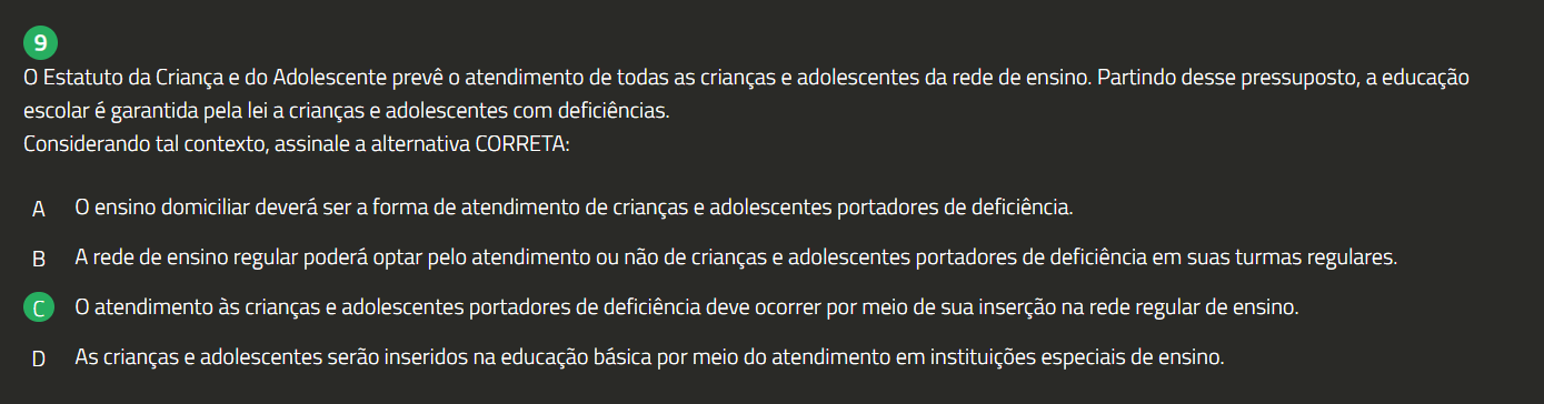 9 Estatuto da Criança e do Adolescente prevê atendimento de todas as crianças e adolescentes da rede de ensino. Partindo desse pressuposto, a educação escolar é garantida pela lei a crianças e adolescentes com deficiências. Considerando tal contexto, assinale a alternativa CORRETA: A ensino domiciliar deverá ser a forma de atendimento de crianças e adolescentes portadores de deficiência. B A rede de ensino regular poderá optar pelo atendimento ou não de crianças e adolescentes portadores de deficiência em suas turmas regulares. C atendimento às crianças e adolescentes portadores de deficiência deve ocorrer por meio de sua inserção na rede regular de ensino. D As crianças e adolescentes serão inseridos na educação básica por meio do atendimento em instituições especiais de ensino.