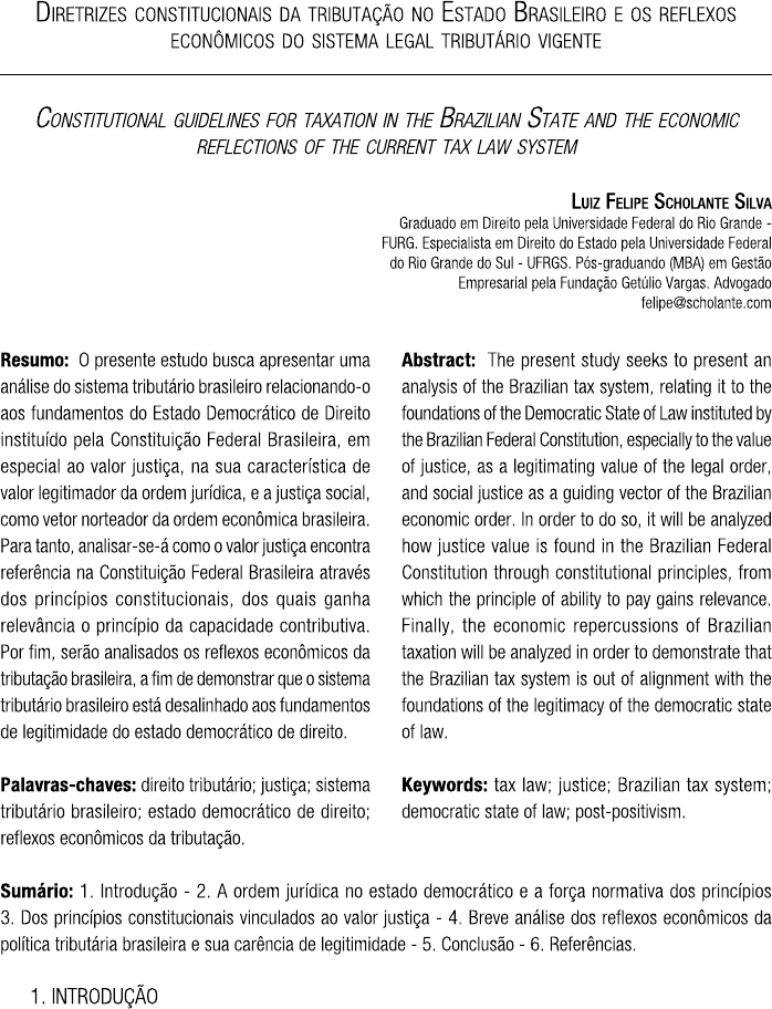 O presente estudo busca apresentar uma análise do Direito Tributário brasileiro à luz constitucional, na qual se interpretará sistematicamente a ordem econômica constitucional e o sistema constitucional tributário, considerando ser a tributação o instrumento do estado de relevante influência na seara econômica. Adianta-se o 178 entendimento de que o sistema tributário nacional, para adquirir conformação de legitimidade, deve necessariamente apresentar uma progressividade sistêmica. Neste contexto, se defenderá que o direito tributário, como principal meio de obtenção de receitas pelo Estado, deve imprescindivelmente encontrar-se alinhado ao complexo axiológico trazido pelos princípios basilares da Constituição Federal Brasileira, que dão sustento à legitimidade e implicam na busca por justiça, fundamento último do sistema jurídico e elemento necessário para a configuração do Estado Democrático de Direito. Em linhas conclusivas, se analisarão alguns estudos de cunho estritamente econômico acerca da tributação brasileira, a partir dos quais se fará um diagnóstico dos reflexos econômicos da tributação no brasil. Daí se depreenderá que o direito tributário brasileiro ainda é caracterizado por exacerbado legalismo álgido e limitado à relação dual entre contribuinte fisco, manifestando cristalina falta de legitimidade da tributação no Brasil, oriunda principalmente da forte influência positivista ainda arraigada no sistema tributário pátrio. Assim, concluir-se-á que, em que pese a obrigatoriedade de conformação da tributação brasileira aos fundamentos de legitimidade do estado democrático de direito, a legislação tributária brasileira encontra-se descompassada com tais fundamento, principalmente com a ideia de justiça. 2. A ORDEM JURÍDICA NO ESTADO DEMOCRÁTICO E A FORÇA NORMATIVA DOS PRINCÍPIOS A tributação é tema multifacetado, que requer análises amplas, para além do direito, tais como questões morais, econômicas e políticas. Começaremos nosso estudo a partir de breves considerações sobre a função dos princípios constitucionais no ambiente do Estado Democrático de Direito, uma vez que determinados princípios vão relacionar-se ao termo “Democrático” ao passo que outros refletem o sentido do termo “direito” Ora, os princípios jurídicos nada mais são do que um complexo de finalidades que são internalizadas e organizadas em uma realidade puramente institucional criada pelo ser humano, o que chamamos de ordem jurídica. Noutro giro, a ordem jurídica comporta uma gama hierárquica e de coabitação de valores que refletem a sociedade plural que vivemos hoje, tudo a partir do valor que é fundamento de legitimidade basilar do direito, a Justiça. 179 A partir daí, pertinente trazer as lições de Humberto Ávila1 para conceituar os princípios jurídicos, os quais são caracterizados pelo autor como normas finalísticas, que possuem uma função diretiva na busca por um fim (estado de coisas).2 Via de consequência, este fim somente se realizará através de comportamentos (meios) condizentes com a finalidade prevista na norma, comportamentos estes que se constituem como práticas necessárias, as quais sem o devido efeito impedem a realização do fim objetivado. Vê-se, pois, que a positivação de um princípio, importa na imposição de adoção das medidas imprescindíveis à sua concretização. Neste andar, discorre Humberto Ávila: Os princípios não são apenas valores cuja realização fica na dependência de meras preferencias pessoais. Eles são, ao mesmo tempo, mais do que isso e algo diferente disso. Os princípios instituem o dever de adotar comportamentos necessários à realização de um estado de coisas ou, inversamente, instituem o deve de efetivação de um estado de coisas pela adoção de comportamentos a ele necessários. Essa perspectiva de análise evidencia que os principio implicam comportamentos, ainda que por via indireta e regressiva. Mais ainda, essa investigação permite verificar que os princípios, embora indeterminados, não o são absolutamente. Pode até haver incerteza quanto ao conteúdo do comportamento a ser adotado, mas não há quanto à sua espécie: o que for necessário para promover o fim é devido.3 É neste momento – de positivação - que vemos os princípios desprenderem-se dos valores a eles relacionados. Os valores se encontram em um plano puramente teleológico e axiológico, os princípios, sendo expressão positivada dos valores, passam a situar-se num plano deontológico e, consequentemente, estabelecem uma obrigatória execução de ações imprescindíveis à conformação do fim determinado pelo princípio. No que toca a força normativa dos princípios, vê-se que as doutrinas pós-positivistas de maior repercussão, em especial Dworkin e Alexy, trabalham a ideia no sentido de que os princípios possuem força normativa prima facie. Explica-se tal entendimento por conta da própria classificação que diferencia os princípios e regras. Os autores, ao classificarem as normas jurídicas, princípios e regras, basicamente os diferenciam da seguinte forma: a regras ou se aplicam ao caso e, portanto são validas, ou não se aplicam ao caso e, logo, não são validas, ou seja, são aplicadas mediante subsunção; os princípios, por sua vez, no caso concreto, são passiveis de ponderação, ou seja, 1 ÁVILA, Humberto. Teoria dos princípios: da definição à aplicação dos princípios jurídicos. 14. ed. São Paulo: Malheiros, 2013. 2 Registramos que não se tratará neste trabalho as diversas distinções entre principio e regra apresentadas pelos pensadores chamados de pós-positivistas, tendo em vista que o tema perquire ao objeto deste estudo. 3 ÁVILA, Humberto. op.cit., pág. 87 180 podem ser restringidos ou afastados, através de uma espécie de balança, em face da aplicação de outro principio colidente. Mas esta classificação
