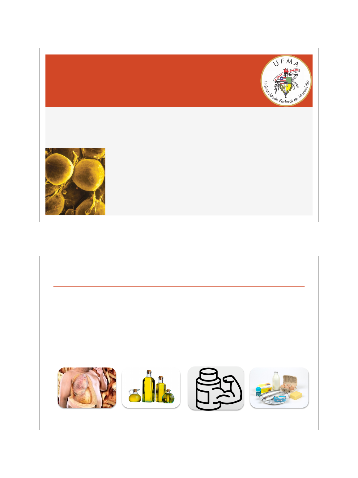 15/04/2025 1 Universidade Federal do Maranhão Departamento de Ciências Fisiológicas Curso de Medicina Disciplina: Bioquímica I ESTRUTURA E FUNÇÃO DE LIPÍDEOS Prof. Ahirlan Castro ahirlan.castro@ufma.br São Luís 2025 1 Ø Lipídeos (grego lipos) – Gordura Ø Grupo heterogêneo de compostos mais relacionados por suas propriedades físicas üRelativamente insolúveis em água üSolúveis em solventes apolares: éter, clorofórmio e benzeno LIPÍDEOS – Características Gorduras Óleos Esteróides Vitaminas 2 15/04/2025 2 LIPÍDEOS Ø Fonte e reserva de energia Ø Estrutural Ø Sinalização celular Principais Funções Classificação Com ácido graxo na sua estrutura Sem ácido graxo na sua estrutura Ø Ceras Ø Glicerídeos Ø Fosfolipídeos Ø Esfingolipídeos Ø Esteróides Ø Vitaminas lipossolúveis ü Cofatores enzimáticos ü Agentes emulsificante ü Hormônios e mensageiros intracelulares ü Transportadores de elétrons ü Pigmentos fotossensíveis 3 ÁCIDOS GRAXOS Ø Ácidos Carboxílicos de cadeias de hidrocarbonetos: 4 – 36 átomos de carbono Ø Os mais comuns possuem um nº par: 12 – 24 átomos de carbono 4 15/04/2025 3 ÁCIDOS GRAXOS - Classificação Cadeia Curta 4 – 8C Cadeia Média 8 – 14C Cadeia longa >14C Ø Número de carbonos Ø Grau de insaturção Saturados Insaturados monoinsaturados poliinsaturados 5 NOMENCLATURA DOS ÁCIDOS GRAXOS Notação simplificada para representar ácidos graxos Ø Nomenclatura padrão: a partir do carbono da carboxila (designa o carbono da carboxila o 1) 16:0 18:1 (∆9) Ø Convenção alternativa: para ácidos graxos poli-insaturados (designa o carbono 1 na outra extremidade da cadeia) 6 15/04/2025 4 ÁCIDOS GRAXOS Ø Os ácidos graxos insaturados – CIS e TRANS 7 ESTRUTURA x PROPIEDADES FÍSICAS 8 15/04/2025 5 Tamanho da cadeia e duplas ligações alteram o estado dos ácidos graxos 9 ÁCIDOS GRAXOS DIFERENÇAS ENTRE ÓLEOS E GORDURAS Ø Importância da saturação e comprimento da cadeia Ø Ác. Graxos insaturados à Ponto de fusão mais baixo Ø cadeias à Ponto de fusão Óleos Gorduras ü Predominam radicais de ácidos graxos insaturados ü Líquidos em condições ambientes – 25ºC 1atm ü Predominam radicais de ácidos graxos saturados ü Sólidos em condições ambientes – 25ºC 1atm 10 15/04/2025 6 ÁCIDOS GRAXOS Azeite de oliva, manteiga e gordura da carne bovina consistem em misturas de triacilgliceróis, diferindo em sua composição de ácidos graxos. 11 ÁCIDOS GRAXOS TRANS Ø Baixa quantidade de origem natural (bactérias dos gêneros Vibrio e Pseudomonas; em alguns vegetais como romã, ervilha e repolho; e animais ruminantes ) Ø Em sua maior parte formada por um processo de hidrogenação industrial (PARCIAL) 12 15/04/2025 7 Em média, os percentuais de ingestão de ácidos graxos trans por meio da alimentação são: • 80 a 90% de alimentos obtidos por hidrogenação parcial; • 2 a 8% de alimentos provenientes de animais ruminantes; e • 1 a 1,5% de óleos refinados 13 ÁCIDOS GRAXOS GORDURA TRANS ✓ Aumento do LDLc; ✓ Redução do HDLc; ✓ Aumento da relação entre colesterol total/HDLc; ✓ Ação pró-inflamatória, com aumento da atividade do TNF-a e níveis mais elevados de IL-6 e PCR; e ✓ Disfunção endotelial, avaliada por marcadores circulantes e medidas funcionais. 14 15/04/2025 8 ÁCIDOS GRAXOS GORDURA TRANS Ø Colesterol LDL Ø Colesterol HDL OMS - 1% de gordura trans da dieta total 2003 – Percentagem no rótulo 15 ÁCIDOS GRAXOS 16 15/04/2025 9 ÁCIDOS GRAXOS TRANS 17 ÁCIDOS GRAXOS TRANS 18 15/04/2025 10 Ácidos graxos poli-insaturados (AGPI) 19 TRIACILGLICERÓIS Ø Triésteres do álcool glicerol com ácidos graxos 20 15/04/2025 11 TRIACILGLICERÓIS Ø Gorduras e óleos de plantas e animais são ricos em triacilgliceróis; Ø Compostos por três ácidos graxos, cada um em ligação ester com a molécula do glicerol, que diferem pela posição dos três resíduos de ácidos graxos; Ø ADIPÓCITOS – células especializadas no armazenamento de triacilgliceróis Ø Os adipócitos contêm lipases, enzimas que catalisam a hidrólise dos triacilgliceróis, liberando ácidos graxos para serem transportados para os locais onde são necessários como combustível. 21 TRIACILGLICERÓIS Ø Tecido Adiposo – abundante na camada subcutânea e abdominal e glândulas mamárias; Conteúdo em Humanos: 18% em homens e 21% em mulheres Ø Permite a sobrevivência em um jejum de 2 a 3 meses; Ø Isolamento térmico em aquáticos de sangue quente; Ø Aquecimento de gorduras com ácidos ou álcalis 22 15/04/2025 12 ESTERÓIDES São derivados do Colesterol 23 COLESTEROL Ø Componente das membranas plasmáticas dos animais 20 a 30% dos lipídeos Ø Precursor de vários hormônios, sais biliares e vitaminas Ø Sua ingestão exagerada pode trazer vários distúrbio à saúde Ø Sintetizado no fígado ou obtido através de alimentos 24 15/04/2025 13 COLESTEROL – Destinos Transportados por lipoproteínas 25 COLESTEROL – Transporte Ø Lipoproteínas plasmáticas: Apolipoproteínas proteínas transportadoras específicas para: fosfolipídeos, colesterol, ésteres de colesterila e triacilgliceróis. 26 15/04/2025 14 COLESTEROL – Transporte Quilomícron LDL 27 LIPOPROTEÍNAS 28 15/04/2025 15 COLESTEROL – Transporte Ø Lipoproteínas plasmáticas: PARTE APO 29 COLESTEROL - Transporte 30 15/04/2025 16 ESTERES DE COLESTERELINA – Entrada na célula mediada por receptor 31 LIPOPROTEÍNAS APOA Não aterogênica APOB Aterogênicas 32 15/04/2025 17 LIPOPROTEÍNAS 33 LIPOPROTEÍNAS 34 15/04/2025 18 COLESTEROL - Precursor 35 VITAMINA D 36 15/04/2025 19 VITAMINA D Circulation. 2013;128:2517-2531 37 VITAMINA D Colecalciferol à 1α,25diidrixicolecalciferol (fígado e rins) absorção Ca++ da dieta – deposição nos ossos e dentes Deficiência de Vit. D Raquitismo em crianças 38 15/04/2025 20 39 Obrigado! 40