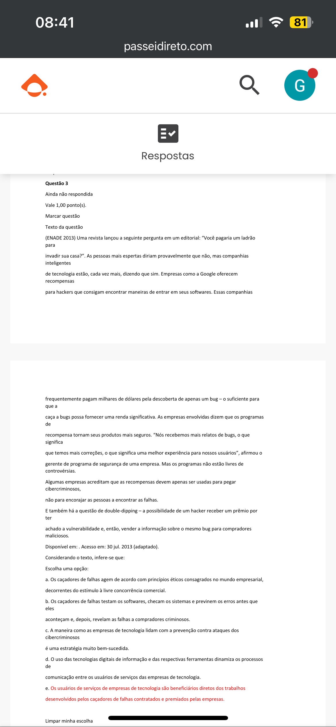 08:41 81 passeidireto.com G Respostas Questão 3 Ainda não respondida Vale 1,00 ponto(s). Marcar questão Texto da questão (ENADE 2013) Uma revista lançou a seguinte pergunta em um editorial: "Você pagaria um ladrão para invadir sua As pessoas mais espertas diriam provavelmente que não, mas companhias inteligentes de tecnologia estão, cada vez mais, dizendo que Empresas como a Google oferecem recompensas para hackers que consigam encontrar maneiras de entrar em seus softwares. Essas companhias frequentemente pagam milhares de dólares pela descoberta de apenas um bug - o suficiente para que a caça a bugs possa fornecer uma renda significativa. As empresas envolvidas dizem que os programas de recompensa tornam seus produtos mais seguros. "Nós recebemos mais relatos de bugs, o que significa que temos mais correções, o que significa uma melhor experiência para nossos usuários", afirmou o gerente de programa de segurança de uma empresa. Mas os programas não estão livres de controvérsias. Algumas empresas acreditam que as recompensas devem apenas ser usadas para pegar cibercriminosos, não para encorajar as pessoas a encontrar as falhas. E também há a questão de double-dipping - a possibilidade de um hacker receber um prêmio por ter achado a vulnerabilidade e, então, vender a informação sobre o mesmo bug para compradores maliciosos. Disponível em: Acesso em: 30 jul. 2013 (adaptado). Considerando o texto, infere-se que: Escolha uma opção: a. Os caçadores de falhas agem de acordo com princípios éticos consagrados no mundo empresarial, decorrentes do estímulo à livre concorrência comercial. b. Os caçadores de falhas testam os softwares, checam os sistemas e previnem os erros antes que eles aconteçam e, depois, revelam as falhas a compradores criminosos. A maneira como as empresas de tecnologia lidam com a prevenção contra ataques dos cibercriminosos é uma estratégia muito bem-sucedida. d. o uso das tecnologias digitais de informação e das respectivas ferramentas dinamiza os processos de comunicação entre os usuários de serviços das empresas de tecnologia e. Os usuários de serviços de empresas de tecnologia são beneficiários diretos dos trabalhos desenvolvidos pelos caçadores de falhas contratados e premiados pelas empresas. Limpar minha escolha