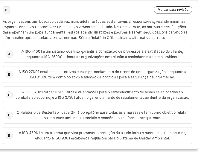 8 Marcar para revisão As organizações buscado cada vez mais adotar práticas sustentáveis e responsáveis, visando minimizar impactos negativos e promover um desenvolvimento equilibrado. Nesse contexto, as normas e certificações desempenham um papel fundamental, estabelecendo diretrizes e padrões a serem as informações apresentadas sobre as normas ISO e Relatório GRI, assinale a alternativa correta: A ISO 14001 é um sistema que visa garantir a otimização de processos e a satisfação do cliente, A enquanto a ISO 26000 orienta as organizações em relação à sociedade e ao meio ambiente, A ISO 27001 estabelece diretrizes para gerenciamento de riscos de uma organização, enquanto a B ISO 31000 tem como objetivo a adoção de controles para a segurança da informação. A ISO 37001 fornece requisitos e orientações para estabelecimento de ações relacionadas ao combate ao suborno, e a ISO 37301 atua no gerenciamento de regulamentação dentro da organização. Relatório de Sustentabilidade GRI é obrigatório para todas as empresas e tem como objetivo relatar D os impactos ambientais, sociais e econômicos de forma transparente. A ISO 45001 é um sistema que visa promover a proteção da saúde física e mental dos funcionários, E enquanto a ISO 9001 estabelece requisitos para Sistema de Gestão