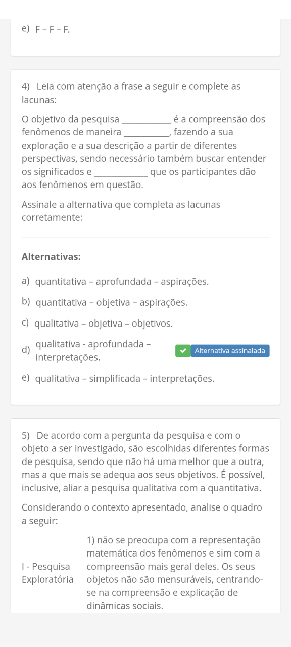 e) - F. 4) Leia com atenção a frase a seguir e complete as lacunas: o objetivo da pesquisa é a compreensão dos fenômenos de maneira , fazendo a sua exploração e a sua descrição a partir de diferentes perspectivas, sendo necessário também buscar entender os significados e que os participantes dão aos fenômenos em questão. Assinale a alternativa que completa as lacunas corretamente: Alternativas: a) quantitativa - aprofundada - aspirações. b) quantitativa - objetiva - aspirações. c) qualitativa - objetiva - objetivos. d) qualitativa - aprofundada - Alternativa assinalada interpretações. e) qualitativa - simplificada - interpretações. 5) De acordo com a pergunta da pesquisa e com objeto a ser investigado, são escolhidas diferentes formas de pesquisa, sendo que não há uma melhor que a outra, mas a que mais se adequa aos seus objetivos. É possível, inclusive, aliar a pesquisa qualitativa com a quantitativa. Considerando o contexto apresentado, analise o quadro a seguir: 1) não se preocupa com a representação matemática dos fenômenos e sim com a I Pesquisa compreensão mais geral deles. Os seus Exploratória objetos não são mensuráveis, centrando- se na compreensão e explicação de dinâmicas sociais.