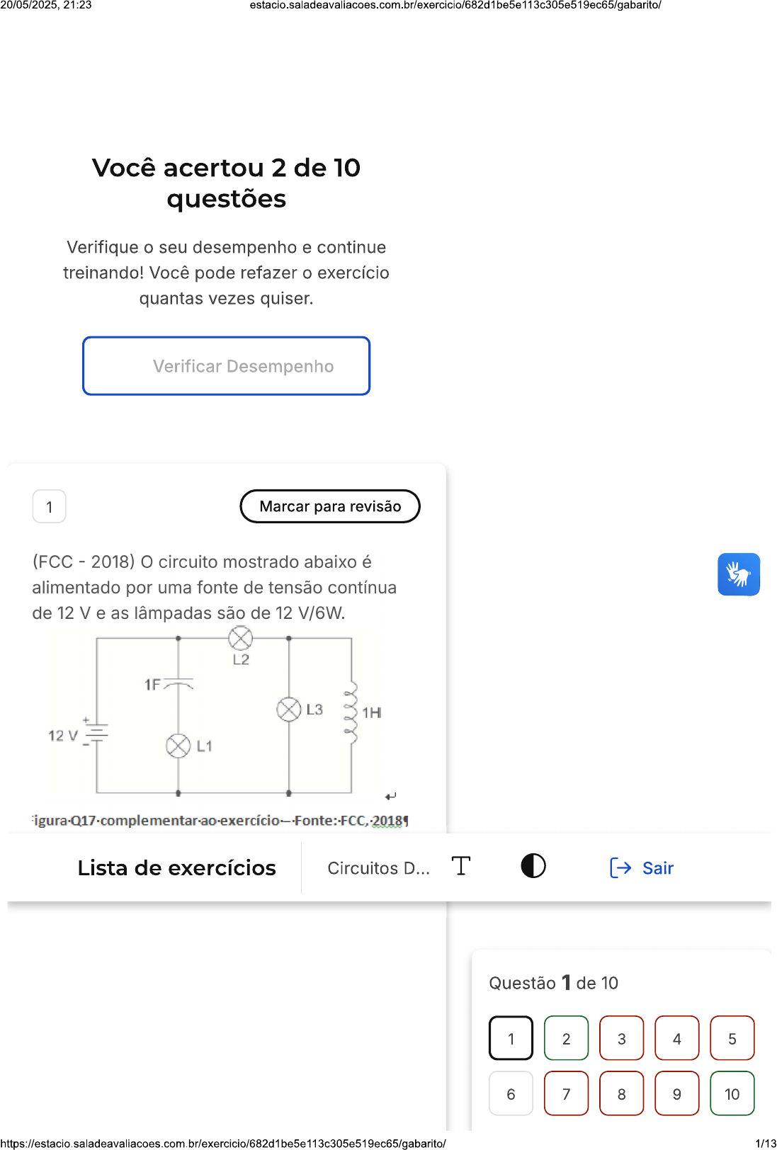 20/05/2025, 21:23 Você acertou 2 de 10 questões Verifique o seu desempenho e continue treinando! Você pode refazer o exercício quantas vezes quiser. Verificar Desempenho 1 Marcar para revisão (FCC - 2018) circuito mostrado abaixo é alimentado por uma fonte de tensão contínua de 12 V e as lâmpadas são de 12 V/6W. L2 1F L3 1H 12 V L1 Lista de exercícios Circuitos D... T Sair Questão 1 de 10 1 2 3 4 5 6 7 8 9 10 1/1320/05/2025, 21:23 Corretas (2) As três lâmpadas, L1, L2 e L3, ficam Incorretas (7) apagadas, pois lâmpadas A Em branco (1) incandescentes só operam com corrente alternada. Somente L2 e L3 ficam acesas, pois a B corrente que passa em L2 é a soma das correntes em L3 e no indutor. As três lâmpadas, L1, L2 e L3, ficam acesas, pois estão ligadas à fonte de alimentação. Somente L1 fica acesa, pois está em D série com o capacitor. Somente L2 fica acesa, pois está em E série com a fonte de alimentação. X Resposta incorreta Opa! A alternativa correta é a letra E. Confira o gabarito comentado! Gabarito Comentado A resposta certa é: Somente L2 fica acesa, pois está em série com a fonte de alimentação. 2 Marcar para revisão (FUMARC - 2018) No circuito a seguir, calcule a potência (W) consumida pelo resistor de 1 depois de muito tempo (regime permanente) em que a chave CH foi fechada. 2/1320/05/2025, 21:23 10 1=0 2 H CH 3 V 20 A 1 B 2 C 3 D 4 E 5 Resposta correta Parabéns, você selecionou a alternativa correta. Confira o gabarito comentado! Gabarito Comentado A resposta certa é: 1 3 Marcar para revisão 3/1320/05/2025, 21:23 (CESGRANRIO - 2014) Considere que o circuito da Figura abaixo está inicialmente operando em regime permanente com a chave S1 aberta e o capacitor C completamente descarregado. L 2,0 mH + 12 C 2,0 Figura Q8 complementar ao exercício - Fonte: CESGRANRIO, 2014. Dessa forma, qual deve ser o valor da resistência elétrica de R2, em ohms, para que a corrente iC no capacitor seja de 5,0 mA, imediatamente após o fechamento da chave ideal S1? A 400 B 600 C 1.000 D 6.000 E 10.000 X Resposta incorreta Opa! A alternativa correta é a letra A. Confira o gabarito comentado. Gabarito Comentado 4/1320/05/2025, 21:23 A resposta certa é: 400 4 Marcar para revisão (CEFET-RJ - 2014) No circuito RLC da Figura abaixo, todos os componentes são considerados ideais, a chave ch está aberta, e tanto o capacitor como o indutor estão inicialmente descarregados. A chave é fechada em t = 0, e fazem-se as medidas das correntes Em seguida, espera-se o circuito entrar em regime permanente e fazem-se novamente as medidas de e 12. ch + 10mH 25V Figura Q10 complementar ao exercício - Fonte CEFET-RJ, 2014. Os valores, em mA, de 12 em t = 0 e de em regime permanente, respectivamente, são A 0,0 e 0,0 B 0,5 e 0,2 C 0,2 e 0,5 5/1320/05/2025, 21:23 D 0,25 e 0,5 E 0,5 e 0,25 X Resposta incorreta Opa! A alternativa correta é a letra A. Confira o gabarito comentado! Gabarito Comentado A resposta certa é: 0,0 e 0,0 5 Marcar para revisão (FGV - 2018) A figura abaixo apresenta um circuito composto por um resistor R de 10 um capacitor C de 10 e um indutor L ligados em paralelo. il + + + vc(t) vr(t) R vl(t) valor do indutor, em henrys, que corresponde a um circuito superamortecido é: 6/1320/05/2025, 21:23 A 1,0 X 10-3 B C 5,0 X 10-3 D 6,0 X 10-6 E 8,0 X 10-6 X Resposta incorreta Opa! A alternativa correta é a letra C. Confira o gabarito comentado! Gabarito Comentado A resposta certa é: 6 Marcar para revisão (FGV - 2014) O circuito a seguir é composto por um resistor, um indutor e um capacitor em paralelo. Sabe-se que o resistor é de 100, o indutor de 100 mH e o capacitor de 100 in ic il + + + C vr(t) R vl(t) L - Figura Q14 complementar ao exercício - Fonte: FGV, 2014. A respeito desse circuito, pode-se dizer que se trata de um circuito: 7/1320/05/2025, 21:23 A Estável. B Sem perdas. C Subamortecido. D Superamortecido. E Criticamente amortecido. i Questão não respondida Opa! A alternativa correta é a letra D. Confira o gabarito comentado! Gabarito Comentado A resposta certa é: Superamortecido. 7 Marcar para revisão (FGV,2016) A figura a seguir apresenta um circuito composto por um resistor, um indutor e um capacitor em paralelo. Assinale a opção que indica a condição para que o circuito seja superamortecido. ir il + + + vc(t) C vr(t) R vl(t) L - - Figura Q20 complementar ao exercício - Fonte: FGV, 2016. 8/1320/05/2025, 21:23 A L > R2C B L > 4R2C C L 4R2C 8 Marcar para revisão (UFRN - 2018) Considere o circuito mostrado na figura a seguir, em corrente contínua: 20 12V 1F Figura Q2 complementar ao exercício - Fonte: UFRN, 2018. A tensão no capacitor e a corrente elétrica no indutor são, respectivamente: 9/1320/05/2025, 21:23 A 12 V e 1,5 A B 10 V e 2 A C 8 A D 6 V e 1,5 A E 6 Ve2A X Resposta incorreta Opa! A alternativa correta é a letra C. Confira o gabarito comentado! Gabarito Comentado A resposta certa é: 8 V e 2 A 9 Marcar para revisão (CESPE - 2018) No circuito representado pela figura precedente, a excitação v(t) corresponde a um degrau de tensão de amplitude A aplicado em um instante e i1(t) e i2 são correntes de malha. + R + C Figura Q11 complementar ao exercício - Fonte CESPE, 2014. 10/1320/05/2025, 21:23 stacio.saladeavaliacoes.com.br/exercicio/682d1be5e113c305e519ec65/gabarito/ Tendo como referência essas informações e considerando que todos os elementos no circuito sejam ideais, assinale a alternativa correta: Em regime permanente, a corrente A i2(t) é igual a A/R2. A relação v(t) + B L[di1(t)/dt] está correta para o circuito apresentado. Se, antes do instante to, o indutor L e o capacitor C estivessem sem energia C armazenada, então, imediatamente após o instante a tensão vc(t) teria assumido transitoriamente o valor A. Em regime permanente, a energia D elétrica armazenada no capacitor será CA2/2. A potência elétrica dissipada no E indutor é R1i1 2 (t). X Resposta incorreta Opa! A alternativa correta é a letra