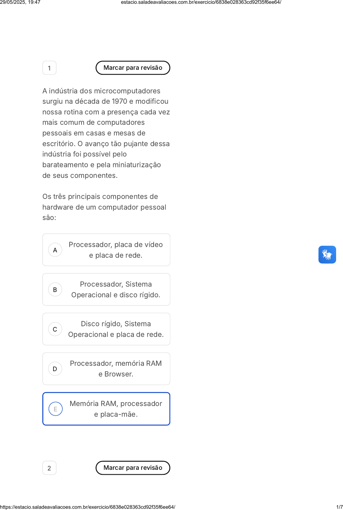 A B C D E 1 Marcar para revisão A indústria dos microcomputadores surgiu na década de 1970 e modificou nossa rotina com a presença cada vez mais comum de computadores pessoais em casas e mesas de escritório. O avanço tão pujante dessa indústria foi possível pelo barateamento e pela miniaturização de seus componentes. Os três principais componentes de hardware de um computador pessoal são: Processador, placa de vídeo e placa de rede. Processador, Sistema Operacional e disco rígido. Disco rígido, Sistema Operacional e placa de rede. Processador, memória RAM e Browser. Memória RAM, processador e placa-mãe. 2 Marcar para revisão 29/05/2025, 19:47 estacio.saladeavaliacoes.com.br/exercicio/6838e028363cd92f35f6ee64/ https://estacio.saladeavaliacoes.com.br/exercicio/6838e028363cd92f35f6ee64/ 1/7 A B C D E A história dos computadores e da computação é marcada pela constante miniaturização e sofisticação do hardware. Uma tecnologia que alterou drasticamente os computadores foi o Circuito Integrado. A grande vantagem dessa tecnologia é: Redução do barulho na operação do circuito. Diminuição do consumo de energia do circuito. Diminuição de tamanho do circuito. Novas funções no circuito. Aumento da ventilação no circuito. 3 Marcar para revisão O escalonador (scheduler) é uma parte fundamental de qualquer sistema operacional e desempenha um papel crucial na gestão do processamento de tarefas e na alocação de recursos do sistema. Qual é a principal função do escalonador em um sistema operacional? 29/05/2025, 19:47 estacio.saladeavaliacoes.com.br/exercicio/6838e028363cd92f35f6ee64/ https://estacio.saladeavaliacoes.com.br/exercicio/6838e028363cd92f35f6ee64/ 2/7 A B C D E A B C Gerenciar o acesso aos periféricos. Controlar a ordem de inicialização dos programas. Decidir a alocação de tempo do processador para programas em execução. Fornecer camadas de abstração entre o hardware e o software. Gerenciar a memória não volátil do sistema 4 Marcar para revisão Os componentes que formam o cerne da infraestrutura da internet, responsáveis por cobrir as enormes distâncias intercontinentais e transportar os datagramas pelo mundo, são chamados de: Modems. Roteadores. World Wide Web. 29/05/2025, 19:47 estacio.saladeavaliacoes.com.br/exercicio/6838e028363cd92f35f6ee64/ https://estacio.saladeavaliacoes.com.br/exercicio/6838e028363cd92f35f6ee64/ 3/7 D E A B C Infraestrutura de circuitos virtuais. Servidores. 5 Marcar para revisão Em 2019, os Sistemas Operacionais para dispositivos móveis (mobileOS) já respondiam por mais de 50% do market share dos Sistemas Operacionais. Qual das funcionalidades a seguir é responsabilidade do mobileOS de um celular? I. Mostrar notificações. II. Calcular rotas. III. Mostrar a carga restante da bateria. IV. Ler a tela touchscreen. V. Restringir o tráfego de Broadcast. I e II, apenas. I, III e IV, apenas. III, IV e V, apenas. Questão 7 de 8 Respondidas (8) Em branco (0) Finalizar exercícios 1 2 3 4 5 6 7 8 Lista de exercícios Base… Sair e finalizar depois 29/05/2025, 19:47 estacio.saladeavaliacoes.com.br/exercicio/6838e028363cd92f35f6ee64/ https://estacio.saladeavaliacoes.com.br/exercicio/6838e028363cd92f35f6ee64/ 4/7 D E A B C D E I, II e IV, apenas. II e V, apenas. 6 Marcar para revisão Considere as seguintes especificações de dois componentes: I. Velocidade de 4,2 Ghz; 4 núcleos; 6 MB Smart Cache. II. Velocidade de 2133 MHz; capacidade de 16GB; voltagem 1,2V. As especificações I e II são relativas a, respectivamente: Memória RAM e HD. Processador e HD. Processador e memória RAM. Placa de vídeo e memória RAM. Memória RAM e placa de vídeo. 7 Marcar para revisão O endereçamento IPv4 (Internet Protocol Address versão 4) é um 29/05/2025, 19:47 estacio.saladeavaliacoes.com.br/exercicio/6838e028363cd92f35f6ee64/ https://estacio.saladeavaliacoes.com.br/exercicio/6838e028363cd92f35f6ee64/ 5/7 A B C D E sistema endereçamento muito utilizado na Internet. O que é o endereço IPv4 e qual é sua função na comunicação em rede? É uma sequência de seis números de oito bits cada, usados para identificar unicamente um computador conectado em um conjunto de redes interligadas. É uma sequência de seis números usados fisicamente na placa de redes para identificar unicamente um computador apenas na rede que ele se encontra. É uma sequência de quatro números de oito bits cada, usados para identificar unicamente um computador conectado em um conjunto de redes interligadas. É um protocolo de roteamento usado para definir a rota dos pacotes durante o percurso pelas diversas redes entre a origem e o destino. É um modelo de endereçamento que permite que todos os dispositivos eletrônicos do mundo possam receber um endereço único na Internet. 29/05/2025, 19:47 estacio.saladeavaliacoes.com.br/exercicio/6838e028363cd92f35f6ee64/ https://estacio.saladeavaliacoes.com.br/exercicio/6838e028363cd92f35f6ee64/ 6/7 A B C D E 8 Marcar para revisão A tecnologia de SSD veio para substituir os discos rígidos. Sem partes móveis, é menos propensa a falhas, além de ser mais rápida que seus antecessores. Os discos rígidos e os SSD não são fundamentais, de forma conceitual, para os computadores. Entretanto, são peças muito importantes, na prática, para os computadores pessoais. Isso se deve ao fato de: A memória RAM ser volátil. O processador não possuir armazenamento para os programas. O barramento entre o processador e a memória RAM ser muito lento. A energia consumida pelo disco ser muito menor que a consumida pela memória RAM. O disco ser responsável por receber os dados do teclado e do mouse. 29/05/2025, 19:47 estacio.saladeavaliacoes.com.br/exercicio/6838e028363cd92f35f6ee64/ https://estacio.saladeavaliacoes.com.br/exercicio/6838e028363cd92f35f6ee64/ 7/7