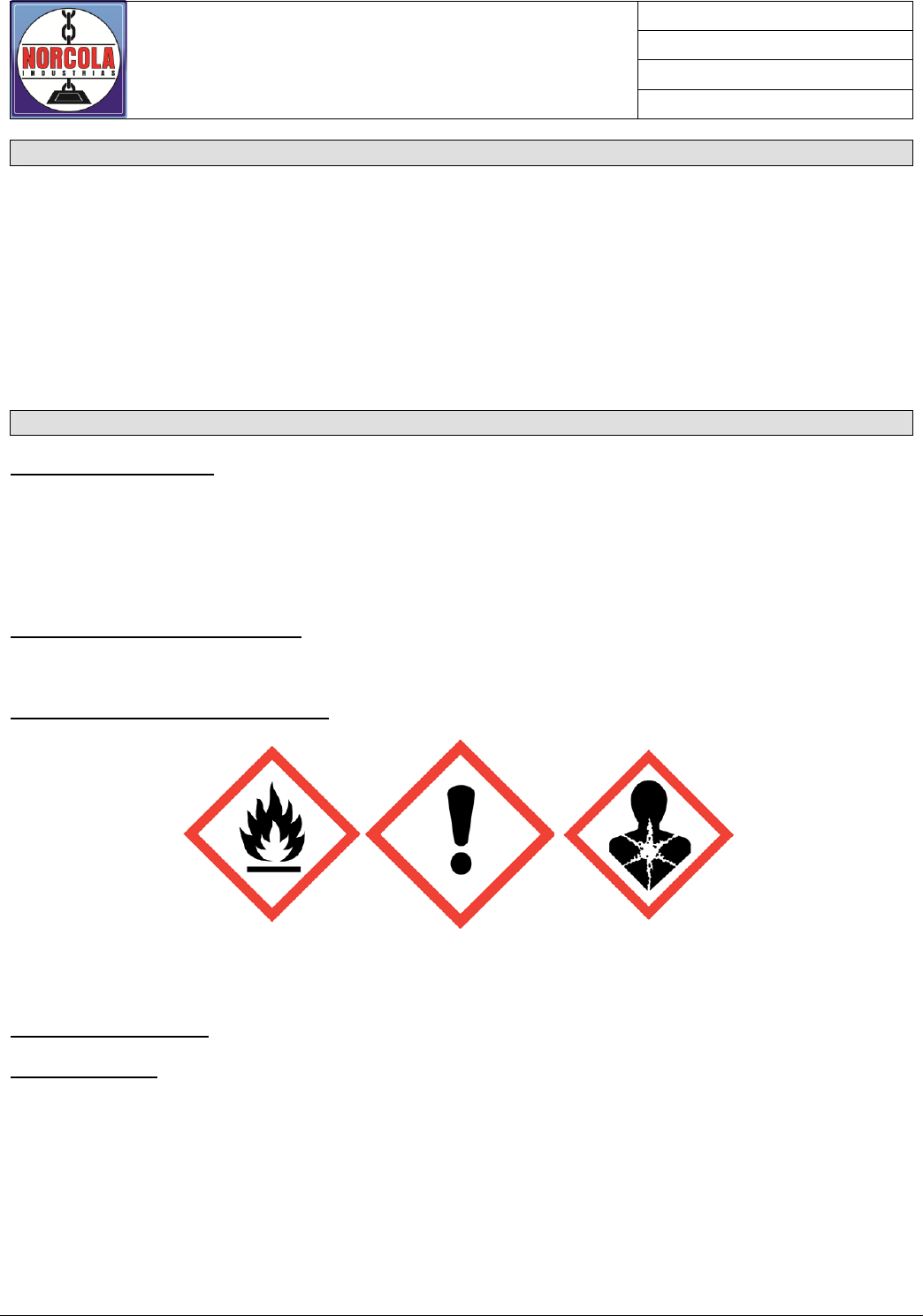 Ficha de Informações de Segurança de Produtos Químicos - FISPQ Produto: Cola de Contato Norcola Revisão: 07 Data: 11/02/2020 Página: 1/9 Conforme NBR 14725:2014 X:\ZZZZ\Lab02\David\FISPQ Revisões\FISPQ GHS Revisadas\Em DOC para possiveis alterações\FISPQ Norcola V07 11fev2020.doc 1. IDENTIFICAÇÃO DO PRODUTO E DA EMPRESA Nome do Produto: Norcola Esp. 102 – Cola de Contato Aplicação: Para colagem de folheados e laminados de madeira, couro e borracha. Fabricante: NORCOLA INDÚSTRIAS LTDA. Endereço: Rua São Francisco, 84 – Timbi – Camaragibe/PE - CEP: 54768-798 País: Brasil Número do Telefone: +55 81 3458-1759 Número do Fax: +55 81 3458-1376 E-mail: norcola@norcola.com.br Web Site: www.norcola.com.br 2. IDENTIFICAÇÃO DE PERIGOS Classificação de perigo: Líquidos inflamáveis – Categoria 2 Toxicidade aguda (oral): categoria 4. Corrosão/Irritação à pele: categoria 2. Lesões oculares graves/irritação ocular: categoria 2B. Toxicidade aguda para o ambiente aquático: categoria 2. Perigo por aspiração: Categoria 1. Sistema de classificação utilizado: Norma ABNT-NBR 14725-2:2009 – versão corrigida 2:2010. Sistema Globalmente Harmonizado para a Classificação e Rotulagem de Produtos Quimicos, ONU. Elementos apropriados de rotulagem: Pictogramas: Palavra de advertência: PERIGO! Frases de perigo: Líquido e vapores altamente inflamáveis. Nocivo se ingerido. Provoca irritação à pele. Provoca irritação ocular. Pode provocar sonolência ou vertigem. Pode provocar defeitos genéticos. Suspeito de provocar câncer. Pode prejudicar a fertilidade ou o feto. Provoca danos ao sistema nervoso central por exposição repetida ou prolongada. Pode provocar danos ao sistema respiratório por exposição repetida ou prolongada. Ficha de Informações de Segurança de Produtos Químicos - FISPQ Produto: Cola de Contato Norcola Revisão: 07 Data: 11/02/2020 Página: 2/9 Conforme NBR 14725:2014 X:\ZZZZ\Lab02\David\FISPQ Revisões\FISPQ GHS Revisadas\Em DOC para possiveis alterações\FISPQ Norcola V07 11fev2020.doc Tóxico para os organismos aquáticos. Nocivo para os organismos aquáticos, com efeitos prolongados. Frases de precaução: Prevenção: Não manuseio o produto antes de ter lido e compreendido todas as precauções de segurança. Mantenha afastado do calor, faísca, chama aberta ou superfícies quentes. Não fume. Utilize equipamento elétrico, de ventilação e de iluminação à prova de explosão. Não coma, beba ou fume durante a utilização deste produto. Utilize apenas ao ar livre ou em locais bem ventilados. Evite a liberação para o meio ambiente. Use luvas de proteção, roupas de proteção, proteção ocular e proteção facial. Resposta à emergência: EM CASO DE CONTATO COM A PELE: Lave com água e sabão em abundãncia. EM CASO DE CONTATO COM OS OLHOS:Lave com água durante pelo menos 15 minutos. Retire lentes de contato se houver e for possível. Continue enxaguando. EM CASO DE INALAÇÃO: Remova a pessoa para local ventilado e a mantenha numa posição que não dificulte a respiração. EM caso de mal estar, consulte um médico. 3. COMPOSIÇÃO E INFORMAÇÕES SOBRE OS INGREDIENTES Substância ou mistura: O produto é preparado à base de policloroprene, resinas fenólicas e resinas hidrocarbônicas dissolvidos em Tolueno e solvente leve de nafta. Natureza química: Dissolução de policloroprene (2-cloro-1,3-butadieno) e resinas sintéticas em hidrocarbonetos. Ingredientes perigosos: Não estão relacionados na tabela abaixo os ingredientes cuja concentração é inferior aos valores de corte/limites de concentração ou que não contribuem para o perigo. Ingredientes Perigosos Nome genérico Número CAS Concentração % Classificação de risco (Símbolo e Frase R) Hidrocarboneto Aromático Tolueno 108-88-3 40-70 H226, H304, H315, H320, H336, H340, H351, H361, H401 Hidrocarbonetos Alifáticos C6-C8 Solvente Leve de Nafta 8006-61-9 10-30 H226, H304, H315, H320, H336, H340, H351, H361, H401 Classificação segundo o regulamento no 1272/2008 da União Europeia e FISPQs dos fornecedores. 4. MEDIDAS DE PRIMEIROS SOCORROS Medidas de primeiros-socorros: Ficha de Informações de Segurança de Produtos Químicos - FISPQ Produto: Cola de Contato Norcola Revisão: 07 Data: 11/02/2020 Página: 3/9 Conforme NBR 14725:2014 X:\ZZZZ\Lab02\David\FISPQ Revisões\FISPQ GHS Revisadas\Em DOC para possiveis alterações\FISPQ Norcola V07 11fev2020.doc Inalação: Remover a vítima para um ambiente ventilado. Manter a pessoa calma e confortável. Se a vítima apresentar dificuldade de respirar ou baixa saturação de oxigênio (X:\ZZZZ\Lab02\David\FISPQ Revisões\FISPQ GHS Revisadas\Em DOC para possiveis alterações\FISPQ Norcola V07 11fev2020.doc desorientação, intoxicação, asfixia, vômitos e tosse. Usar equipamentos apropriados de respiração. Usar neblina d’água para resfriar os recipientes fechados para evitar a propagação do fogo e a explosão dos mesmos com o aumento da temperatura. Se possível, retirar os recipientes da área do incêndio, sem prejuízo da segurança. Tomar precauções para que a água de combate ao fogo e os resíduos do incêndio não alcancem a rede de esgoto ou cursos de água. Adotar os métodos de contenção do item 6 para a limpeza do local. A água de extinção contaminada deverá ser eliminada de acordo com a legislação local vigente. 6. MEDIDAS DE CONTROLE PARA DERRAMAMENTO OU VAZAMENTO Precauções Pessoais: Eliminar fontes de ignição, ventilar e isolar a área evacuando todo o pessoal desnecessário. Não permitir que se fume na área de risco. Evitar inalar os vapores. Usar equipamentos apropriados para respiração. Aplicar as medidas de proteção indicadas nos itens 7 e 8. Controle de poeira: Não se aplica (produto líquido). Precauções para o meio ambiente: Se possível, conter o vazamento sem prejuízo da segurança. Não deixar os resíduos entrar em contato com sistemas de drenagens ou vias 