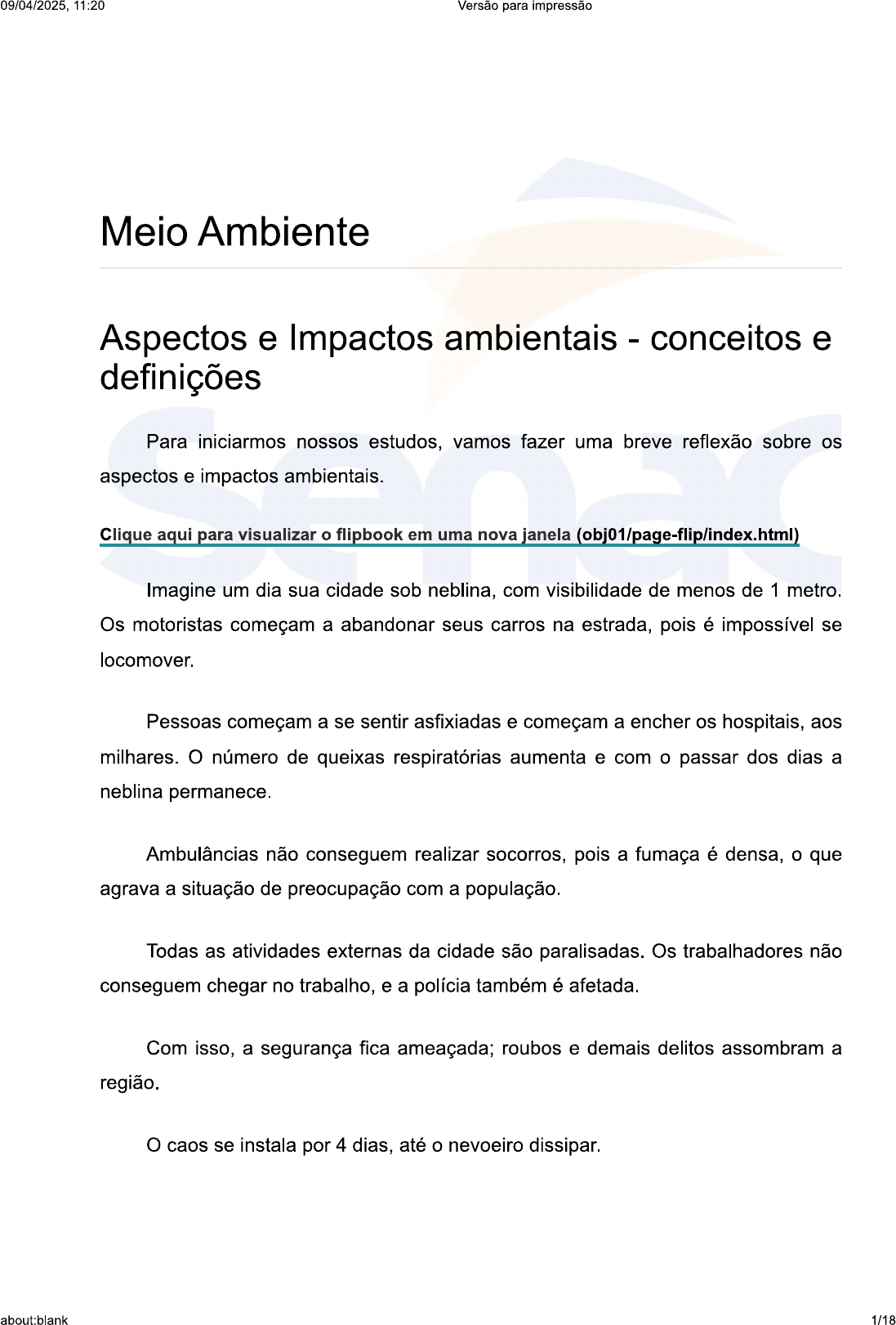 09/04/2025, 11:20 Versão para impressão Meio Ambiente Aspectos e Impactos ambientais - conceitos e definições Para iniciarmos nossos estudos, vamos fazer uma breve reflexão sobre os aspectos e impactos ambientais. Clique aqui para visualizar flipbook em uma nova janela (obj01/page-flip/index.html) Imagine um dia sua cidade sob neblina, com visibilidade de menos de 1 metro. Os motoristas começam a abandonar seus carros na estrada, pois é impossível se locomover. Pessoas começam a se sentir asfixiadas e começam a encher os hospitais, aos milhares. número de queixas respiratórias aumenta e com o passar dos dias a neblina permanece. Ambulâncias não conseguem realizar socorros, pois a fumaça é densa, o que agrava a situação de preocupação com a população. Todas as atividades externas da cidade são paralisadas. Os trabalhadores não conseguem chegar no trabalho, e a polícia também é afetada. Com isso, a segurança fica ameaçada; roubos e demais delitos assombram a região. O caos se instala por 4 dias, até o nevoeiro dissipar. about:blank 1/1811:20 Versão para impressão Essa história, que parece vinda de um filme apocalíptico, pasmem, aconteceu em Londres, entre os dias 5 e 9 de dezembro de 1952. Calcula-se que até 10 mil pessoas morreram por conta desse evento e outros milhares tiveram doenças graves nos pulmões. Verificou-se que a queima de combustíveis fósseis, junto a características meteorológicas daqueles dias, concentrou no meio urbano, poluentes danosos a saúde. A população foi literalmente sufocada por gases. Na internet há vídeos e mais informações sobre essa tragédia, procure por "Grande nevoeiro de Londres". Ao analisar o ocorrido percebe-se que naquela época não havia estudos sobre identificação dos aspectos ambientais, da industrialização massiva de Londres. Qualquer elemento originado das atividades, produtos ou serviços, que interajam com o meio, é denominado de aspecto ambiental. Esse conhecimento é crucial para identificar se algum desses elementos irá causar impactos ambientais. Você lembra o que é impacto ambiental? Segundo o CONAMA "considera-se impacto ambiental qualquer alteração das propriedades físicas, químicas e biológicas do meio ambiente, causada por qualquer forma de matéria ou energia resultante das atividades humanas". Portanto, ao compreendermos os aspectos ambientais resultantes de um produto, serviço ou atividade de uma organização, damos o primeiro passo para levantar os impactos ambientais. No exemplo do Grande Nevoeiro de Londres, os compostos liberados pela queima do carvão, tais como enxofre e gás carbônico, estão relacionados ao aquecimento da Terra, à chuva ácida e à toxicidade em humanos. Você percebeu que os impactos ambientais são tanto na esfera de saúde quanto de mudanças perigosas ao meio ambiente? Dessa maneira os riscos ambientais são classificados das seguintes formas: about:blank 2/1809/04/2025, 11:20 Versão para impressão Risco interno é a situação de risco ambiental dentro da empresa. A atividade pode prejudicar a saúde do trabalhador ou contaminar determinado local. Ao pensarmos no caso inglês, os funcionários das termelétricas ou indústrias que queimavam carvão tinham real risco de contaminação com os poluentes. Risco externo é o potencial de contaminação que o empreendimento ou organização pode realizar na comunidade e até nas regiões mais afastadas. Reflita sobre o Grande Nevoeiro de Londres, você acha que se encaixa nessa classificação? Risco de contaminação dos produtos, ou seja, mercadorias que podem causar danos à saúde, seja pelo seu condicionamento inadequado ou composição. Alguns produtos bem conhecidos, e que apresentam esse problema, são a telha e a caixa d'água de amianto, que é um elemento cancerígeno. Há uma polêmica no país sobre se o uso de amianto nesses itens é realmente perigoso. Sinta-se a vontade para pesquisar sobre o amianto e descubra o que os especialistas afirmam sobre o tema! O contato com contaminantes muitas vezes não é de forma direta, como no caso dos poluentes atmosféricos. O acúmulo de elementos tóxicos no organismo muitas vezes perpassa a cadeia alimentar e alcança os humanos. Esse é um processo muito dinâmico e que varia de acordo com o tipo de ecossistema em questão. Os metais pesados, a radiação e os componentes orgânicos sintéticos (artificiais) são os principais elementos de contaminação que se acumulam no organismo. É muito comum nos primeiros níveis da cadeia alimentar (peixes, moluscos, crustáceos, plâncton, plantas). É importante frisar que a ocorrência de qualquer um dos impactos citados anteriormente é grave. Além disso, a empresa ou organização será a culpada e responderá, segundo a legislação ambiental vigente e assim sujeitos a penalização. E é justamente para seguir as regras ambientais, e evitar as consequências da infração, que há a necessidade dos profissionais do meio ambiente dominarem os aspectos e impactos ambientais. about:blank 3/1809/04/2025, 11:20 Versão para impressão O estudo de aspecto e impacto ambiental também é crucial antes da instalação do empreendimento em uma área. Existem certas áreas, que podemos chamar de "zonas de alto risco"; nelas os acidentes ambientais são mais propensos a acontecer, por causa dos fatores impostos pelo homem ou ainda por características do próprio ambiente. Assim, definimos que: Aspectos particulares dos ambientes podem agir como agravantes dos impactos ambientais negativos. Condições de riscos presumidos são fatores que podem ser previstos mediante análise técnica. A atuação do Poder Público deve ser ativa, principalmente nesses locais. Dados da Organização Mundial da Saúde indicam que 10% das mortes mundiais devem-se a fatores ambientais, agravados por impactos ambientais negativos. No entanto, podemos ter uma situação inversa: os fatores ambientais também podem agir 