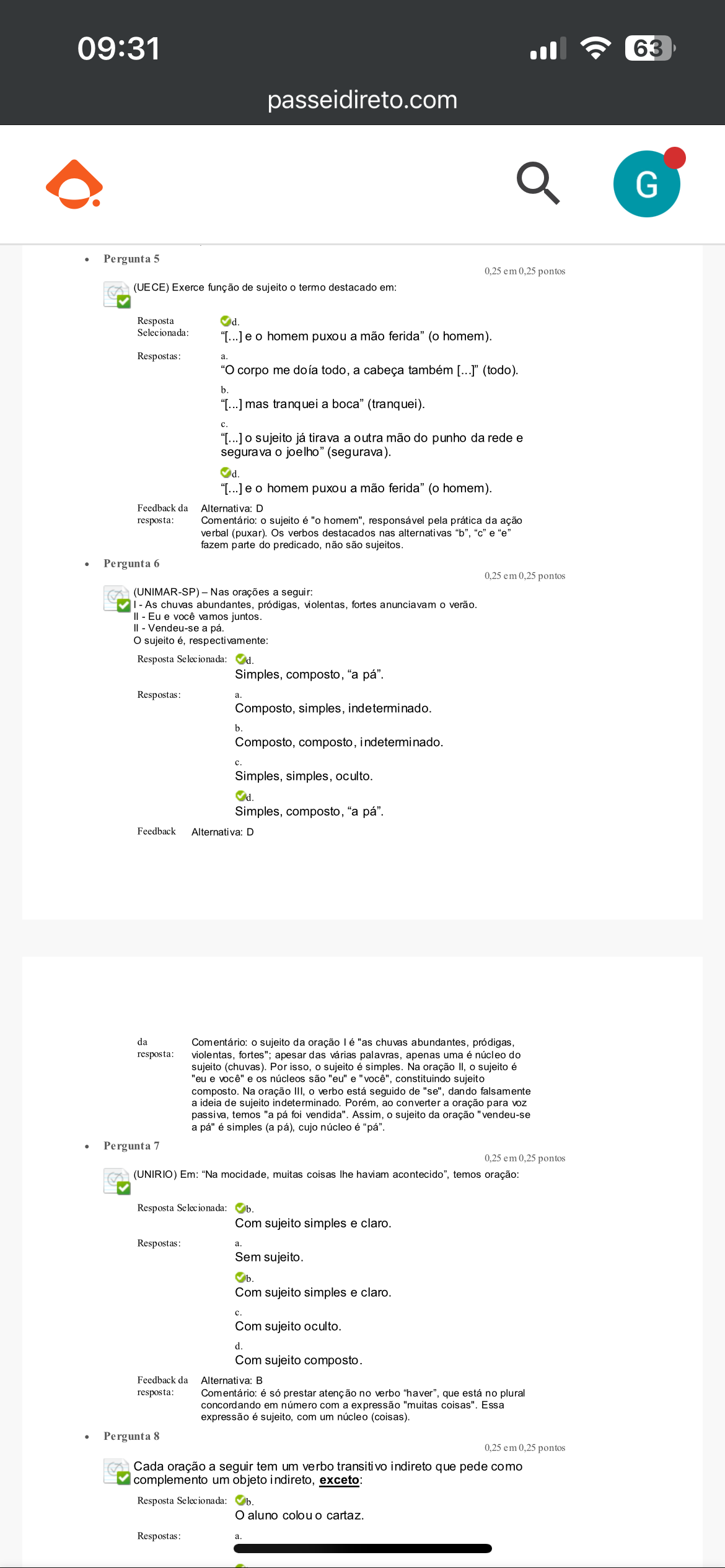 09:31 63 passeidireto.com G Pergunta 5 0,25 em pontos (UECE) Exerce função de sujeito o termo destacado em: Resposta Selecionada: o homem puxou a mão (o homem). Respostas a. "O corpo me doía todo, a cabeça também [...]" (todo). b. "[...]mas tranquei a boca" (tranquei). "[...] o sujeito já tirava a outra mão do punho da rede e segurava o joelho" (segurava). "[...] e o homem puxou a mão ferida" (o homem). Feedback da Alternativa: D resposta: Comentário: o sujeito é "o responsável pela prática da ação verbal Os verbos destacados nas alternativas "b", "c" fazem parte do predicado, não são sujeitos. Pergunta 6 0,25 em 0.25 pontos (UNIMAR-SP) Nas orações a seguir: I As chuvas abundantes, pródigas, violentas, fortes anunciavam o verão. Eu e você vamos juntos. Vendeu-se o sujeito é, respectivamente: Resposta Selecionada: Simples, composto, "a Respostas: a. Composto, simples, indeterminado. b. Composto, composto, indeterminado. c Simples, simples, Simples, composto, "a pá". Feedback Alternativa: D da Comentário: o sujeito da oração é "as chuvas abundantes, pródigas, resposta: violentas, apesar das várias palavras, apenas uma é núcleo do sujeito (chuvas). Por o sujeito é simples. Na oração o sujeito é "eu e você" e os núcleos são "eu" e "você", constituindo sujeito composto. Na oração III, o verbo está seguido de dando falsamente a ideia de sujeito indeterminado. ao converter a oração para voz passiva, temos "a pá foi vendida". Assim, o sujeito da oração "vendeu-se a pá" é simples (a pá), cujo núcleo é "pá" Pergunta 7 0,25 em pontos (UNIRIO) Em: "Na mocidade, muitas coisas lhe haviam acontecido", temos oração: Resposta Selecionada: Com sujeito simples e claro. Respostas: a Sem sujeito. Com sujeito simples e claro. Com sujeito oculto. d. Com sujeito composto. Feedback da B resposta: Comentário: é só prestar atenção no verbo que está no plural concordando em número com a expressão "muitas coisas". Essa expressão é sujeito, com um núcleo (coisas). Pergunta 8 0.25 em 0.25 pontos Cada oração a seguir tem um verbo transitivo indireto que pede como complemento um objeto indireto, exceto: Resposta Selecionada: aluno colou o cartaz. Respostas: a.