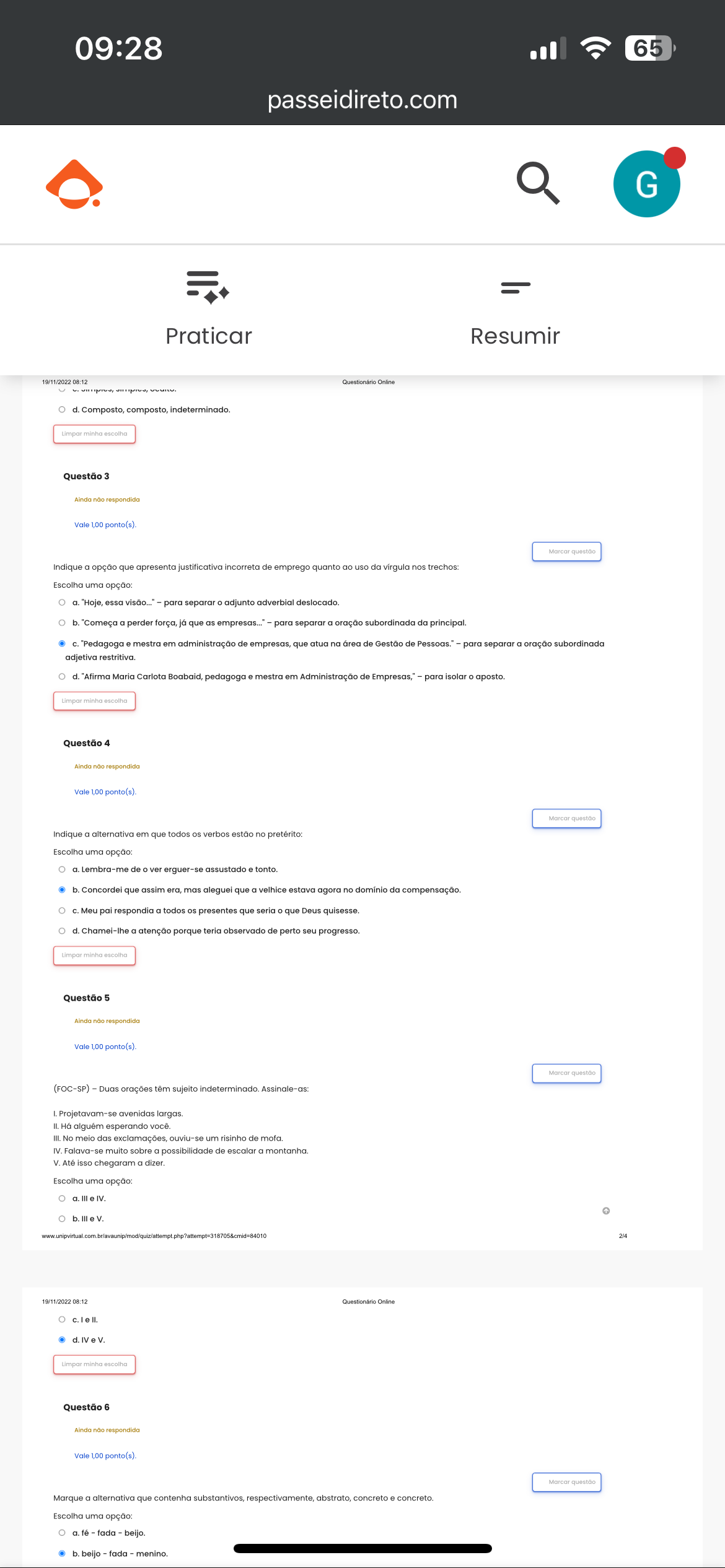 09:28 65 passeidireto.com G Praticar Resumir 19/11/2022 08: 12 Questionário Online - - d. Composto, composto, minha escolha Questão 3 Ainda não respondido Vale 1,00 ponto(s) Marcar questão Indique a opção que apresento justificativa incorreto de emprego quanto uso da vírgula nos Escolha uma opção: "Hoje, esso visão. - para separar adjunto b. a perder força, que as empresas... - para separar a oração subordinada da e mestra em administração de empresas, que atua na área de Gestão de para separar a oração adjetiva d. "Afirma Maria Carlota Boabaid pedagoga e mestra em Administração de Empresas," - para isolar minha escolho Questão 4 Ainda não respondido Vale ponto(s) Marca questão Indique a alternativa em que todos os verbos estão no Escolha uma opção: a Lembra-me de ver erguer-se assustado e tonto. Concordei que assim era mas aleguei que a velhice estava agora no domínio da compensação. Meu pai respondio a todos os presentes que serio que Deus Chamei-lhe a atenção porque teria observado de perto seu progresso. minha escolho Questão 5 Ainda não respondido Vale ponto(s) questão (FOC-SP) Duas orações têm sujeito Assinale-as Projetavam-se avenidas Há esperando você. III. No meio das exclamações, ouviu-se um risinho de mofa IV Falava-se muito sobre a possibilidade de escalar a V. Até isso chegaram Escolho IV. T V. 2/4 19/11/2022 08:12 Questionário Online e V. minha Questão 6 Ainda não respondido Vale 1,00 questão Marque a alternativa que contenha substantivos, respectivamente, abstrato, concreto e Escolha uma opção: fada beijo. beijo fada menino