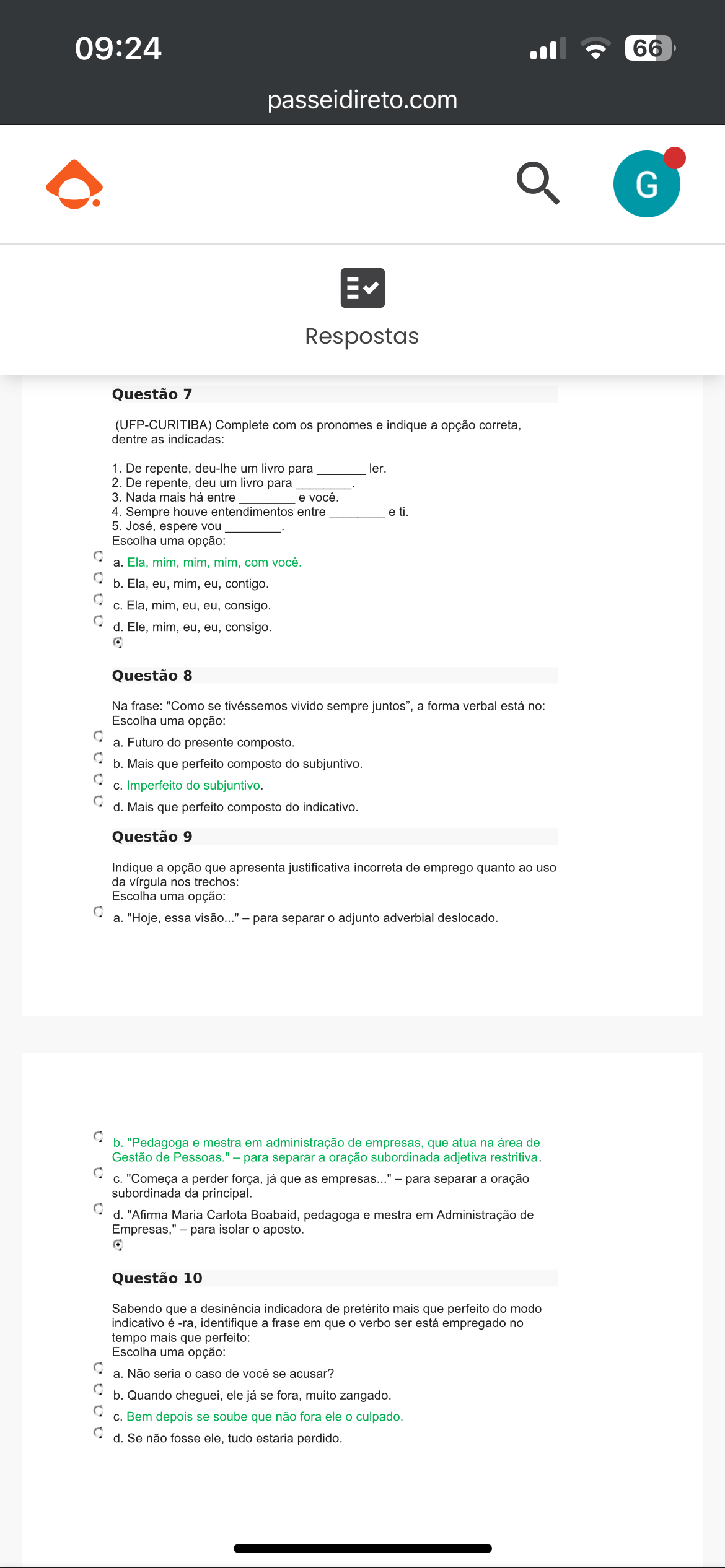 09:24 66 passeidireto.com G Respostas Questão 7 (UFP-CURITIBA) Complete com os pronomes e indique a opção correta, dentre as indicadas: 1. De repente, deu-lhe um livro para ler. 2. De repente, deu um livro para . 3. Nada mais há entre e você. 4. Sempre houve entendimentos entre e ti 5. José, espere you Escolha uma opção: a. Ela, mim, mim, mim, com você. b. Ela, eu, mim, eu, contigo. C. Ela, mim, eu, eu, consigo. d. Ele, mim, eu, eu, consigo. Questão 8 Na frase: "Como se tivéssemos vivido sempre juntos", a forma verbal está no: Escolha uma opção: a. Futuro do presente composto. b. Mais que perfeito composto do subjuntivo. C. Imperfeito do subjuntivo. d. Mais que perfeito composto do indicativo. Questão 9 Indique a opção que apresenta justificativa incorreta de emprego quanto ao uso da vírgula nos trechos: Escolha uma opção: a. "Hoje, essa visão..." - para separar o adjunto adverbial deslocado. "Pedagoga e mestra em administração de empresas, que atua na área de Gestão de Pessoas." - para separar a oração subordinada adjetiva restritiva. C. "Começa a perder força, já que as empresas..." - para separar a oração subordinada da principal. d. "Afirma Maria Carlota Boabaid, pedagoga e mestra em Administração de Empresas," - para isolar o aposto. Questão 10 Sabendo que a desinência indicadora de pretérito mais que perfeito do modo indicativo é -ra, identifique a frase em que o verbo ser está empregado no tempo mais que perfeito: Escolha uma opção: a. Não seria o caso de você se acusar? b. Quando cheguei, ele já se fora, muito zangado. C. Bem depois se soube que não fora ele o culpado. d. Se não fosse ele, tudo estaria perdido.