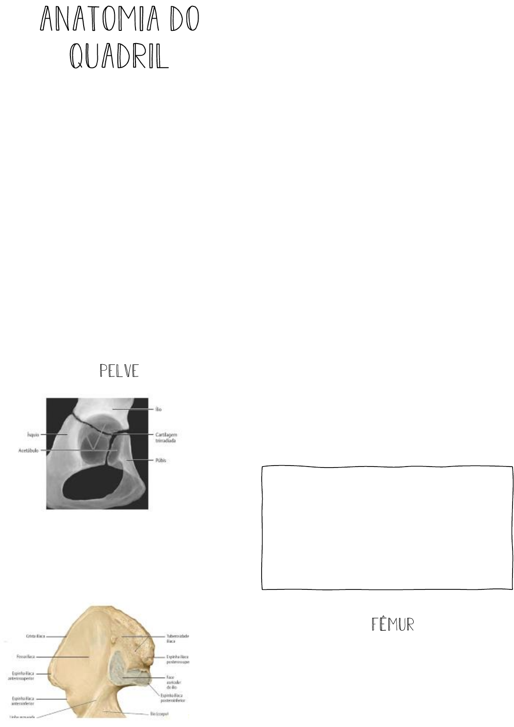 Cíngulo/cintura: PELVE • estrutura anatômica que faz a união do esqueleto axial com o apendicular • suporte do peso • proteção das vísceras • é um grande ponto de inserção muscular • extreamente importante pelo parto – o osso pelve que aumenta a mobilidade para a passagem do bebe -PARTO NORMAL (vaginal) OSSOS: Sacro Cóccix Pelve – ílio, ísquio e púbis Fêmur Osso plano 3 ossos diferentes que se fundem ao longo da vida ILÍO (ilíaco) • Crista ilíaca – crista do ilio • Fossa ilíaca – fossa do ilio – recebe o musculo ilíaco • Face auricular (ou face sacropélvica) • Espinha ilíaca ântero-superior • Espinha ilíaca ântero-inferior • Espinha ilíaca póstero-superior • Espinha ilíaca póstero-inferior • Face glútea PÚBIS: • Ramo inferior do púbis – é possível encontrar outro acidente ósseo que é a linha pectinea e na extremidade do ramo inferior do púbis o tubérculo púbico • Face sinfisial – forma a articulação sínfise púbica (quando se articula com a outra face sinfisial) • Tubérculo púbico • Ramo superior do púbis • Corpo do púbis ÍSQUIO: • Incisura isquiática maior • Incisura isquiática menor • Tuber isquiático – fixação de músculos. Sentamos em cima dele • Ramo do ísquio (ramo pubo isquiático – junção do ramo do ísquio com o ramo inferior do púbis) • Espinha isquiática forame obturado: formado entre o corpo púbico e do ísquio. Passa artéria, veia e nervo obturado serve para diminuir o peso da pelve acetábulo ele tem parte do ilio, do púbis e do ísquio ponto anatômico de fusão do ilio, púbis e do ísquio • Cabeça do fêmur • Fóvea da cabeça do fêmur • Colo do fêmur • Trocante maior • Trocante menor • Linha intertrocantea (entre os trocantes – parte ANTERIOR) • Crista intertrocantéria • Corpo do fêmur • Linha áspera • Face poplítea • Condilo medial • Epicôndilo medial • Condilo lateral • Fossa intercondilar Sacroilíaca – osso do sacro e osso ilíaco interposta por cápsula articular – ARTICULAÇÃO SINOVIAL Sacrococcígea – osso do sacro cóccix interposta por disco de fibrocartilagem – ARTICULAÇÃO CARTILAGINEA DO TIPO SÍNFISE Sínfise púbica – entre os ossos púbicos cobertas por cartilagem hialina e separadas por discos de fibrocarilagem – ARTICULAÇÃO CARTILAGINEA DO TIPO SÍNFISE Coxofemoral – entre a cabeça do fêmur do acetábulo no ilíaco interposta por cápsula articular – ARTICULAÇÃO SINOVIAL • Ligamento Iliofemoral – É um feixe bastante resistente, situado anteriormente à articulação. Está intimamente unido à cápsula e serve para reforçá-la. • Ligamento Pubofemoral – Insere-se na crista obturatória e no ramo superior da pube; distalmente, funde-se com a cápsula e com a face profunda do feixe vertical do ligamento iliofemoral. • Ligamento Isquiofemoral – Consiste de um feixe triangular de fibras resistentes, que nasce no ísquio distal e posteriormente ao acetábulo e funde-se com as fibras circulares da cápsula. • Ligamento da Cabeça do Fêmur – É um feixe triangular, um tanto achatado, inserindo-se no ápice da fóvea da cabeça do fêmur e na incisura da cavidade do acetábulo. Tem pequena função como ligamento e algumas vezes está ausente. • Orla Acetabular – É uma orla fibrocartilagínea inserida na margem do acetábulo, tornando assim mais profunda essa cavidade. Ao mesmo tempo protege e nivela as desigualdades de sua superfície, formando assim um círculo completo que circunda a cabeça do fêmur e auxilia na contenção desta em seu lugar. • Ligamento Transverso do Acetábulo – É uma parte da orla acetabular, diferindo dessa por não ter fibras cartilagíneas entre suas fibras. Consiste em fortes fibras achatadas que cruzam a incisura acetabular. • Glúteo máximo Inserção Medial: Linha glútea posterior do íleo, sacro, cóccix e ligamento sacrotuberoso. Inserção Lateral: Trato íleotibial da fáscia lata e tuberosidade glútea do fêmur. Inervação: Nervo Glúteo Inferior (L5 – S2). Ação: Extensão e rotação lateral do quadril. • Glúteo médio Inserção Superior: Face externa do íleo entre a crista ilíaca, linha glútea posterior e anterior. Inserção Inferior: Trocânter maior. Inervação: Nervo Glúteo Superior (L4 – S1). Ação: Abdução e rotação medial da coxa. • Glúteo mínimo Inserção superior: asa ilíaca (entre a linha glútea anterior e inferior) Inserção inferior: trocânter maior Inervação: nervo glúteo superior (L4-S1) Ação: abdução e rotação medial da coxa. As fibras anteriores realizam flexão do quadril. • Tensor da fáscia lata Inserção proximal: crista ilíaca e EIAS Inserção distal: trato íleo-tibial Inervação: nervo do glúteo superior (L4-S1) Ação: flexor, abdução e rotação medial do quadril e rotação lateral do joelho ROTATORES LATERAIS PROFUNDOS • Quadrado femoral Inserção medial: tuberosidade isquiática Inserção lateral: crista intertrocantérica Inervação: nervo para o M. quadrado femural e gêmeo inferior (L4-S1) Ação: rotação lateral e adução da coxa • Piriforme Inserção medial: superfície pélvica do sacro e margem da incisura isquiática maior Inserção lateral: trocânter maior Inervação: nervo para o músculo piriforme (S2) Ação: abdução e rotação lateral da coxa • Gêmeo superior Inserção medial: espinha isquiática Inserção lateral: trocânter maior Inervação: nervo para o M. gêmeo superior (L5-S2) Ação: rotação lateral da coxa • Gêmeo inferior Inserção medial: tuberosidade isquiática Inserção lateral: trocânter maior Inervação: nervo para o músculo gêmeo inferior e quadrado femoral (L4-S1) Ação: rotação lateral da coxa • Obturador interno Inserção medial: face interna da membrana obturatória e ísquio Inserção lateral: trocânter maior e fossa trocantéria do fêmur Inervação: nervo