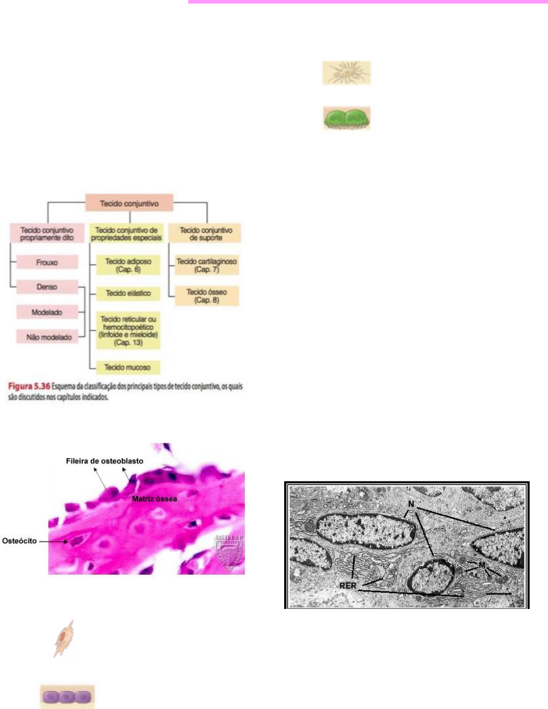 tecido ósseo Função: Suporte Proteção Depósito de Ca+, P Tipo especializado de tecido conjuntivo → formado por células e material extracelular calcificado Componentes do tecido ósseo • Células osteogênicas – da origem ao osteoblastos • Osteoblastos • Osteócitos • Osteoclastos • Matriz óssea o Agua, fibras colágenas e minerais OSTEOBLASTOS • Células formadoras de osso • Células jovens • Sintetizam o A parte orgânica da matriz óssea Colágeno tipo , proteoglicanos e glicoproteínas o Osteonectina – facilita deposição de Ca o Osteocalcina – estimula a atividade dos osteoblastos • Concentram fosfato de cálcio → Ca3(PO4)2 • Localizadas nas superficieis osseas • Iniciam a calcificação Normalmente encontrados revestindo a camada da matriz que estão produzindo → Grande quantidade de CG, RER, mitocôndrias (M) e Núcleo eucromático (N) = características de células produtoras de grande quantidade de proteínas CALCIFICAÇÃO • Cristais se cobinam com outros minerais: carbonato de cálcio, magnésio, fluoreto, potássio e sulfato → Conforme esses sais são depositados na estrutura formada pelas fibras de colágeno da matriz extracelular, eles cristalizam e o tecido endurece CALCIFICAÇÃO → INICIADO PELOS OSTEOBLASTOS OSTEOBLASTO → OSTEÓCITO “uma vez que os próprios osteoblastos são cobertos por matriz extracelular, tornam-se aprisionados em suas secreções e transformam-se em osteócitos OSTEOCITOS • Interior da matriz óssea • Lacunas/canalículos → prolongamentos estabelecem contato • Células achatadas • Exigem pouco REG, CG e núcleo com cromatina condensada • Podem conter granulócitos • Morte celular → seguida por reabsorção da matriz • Pouca atividade sintética → mas essenciais para a manutenção da MATRIZ ÓSSEA OSTEOCLASTOS • Macrófagos do tecido ósseo • Células moveis e gigantes • Multinucleadas → derivadas de cerca de 50 monócitos • Extensamente ramificados • Se concentram em endósteo • Irregulares → formato e espessura variável • Originados a partir de precursores mononucleados da medula óssea → em contato com o tecido ósseo, se unem REABSORÇÃO ÓSSEA • Superfície ativa voltada para a matriz óssea • Prolongamentos vilosos • Ao redor dessa área → Zona citoplasmática = zona clara o Pobre em organelas o Com filamento de actina o Local de adesão de osteoclasto à matriz óssea → microambiente fechado reabsorção óssea o Secretam ácido, colagenase (digestão de colágeno) e matriz orgânica e dissolve cristais de sais de cálcio • Atividade coordenada por citocinas e por hormônios (calcitonina e PTH) • Osteoclastos localizados em depressões → loocunas de reabsorção (Howship) • A superfície ativa dos osteoclastos fica voltada para a matriz óssea, num local de adesão no qual ocorre secreção de colagenase e enzimas que digerem os componentes orgânicos da matriz óssea • Cristais de hidroxipatita → dissolvidas pela liberação de íons H+ - tornam o microambiente ácido • Calcitonina e paratormônio – influenciam a atividade dos osteoclastos de forma antagônica → PTH promove reabsorção óssea → calcitonina reduz a atividade dos osteoclastos MATRIZ EXTRACELULAR DO TECIDO ÓSSEO • Matriz extracelular abundante entre células bem separadas → 15% água, 30% fibras colágenas e 55% de sais minerais cristalizados • Parte orgânica – 95% colágeno tipo 1, proteoglicanas e glicoproteínas • Parte inorgânica → 50% da matriz óssea o Fosfato, Ca, Bicarbonato, Magnésio, Potássio, Sódio e Citrato o Hidroxipatita com capa de hidratação facilita a troca de íons entre o cristal e o liíquido intersticial MATRIZ EXTRACELULAS DO TECIDO ÓSSEO • Associação de hidroxlapatita + fibras colágenas → RIGIDEZ E RESISTENCIA DO TECIDO ÓSSEO • Remoção do cálcio, os ossos mantem sua forma intacta → não são tão flexíveis quanto os tendões • Remoção do colágeno, ossos mantem a forma intacta → quebradiça ESTRUTURAÇÃO ÓSSEA • Superfícies internas e externas dos ossos são recobertos por células osteogênicas e tecido conjuntivo → constituem o endósteo e o periósteo • Ossos tem centro esponjoso e camada compactada → nos longos o canal medular é ocupado por medula óssea ESTRUTURA ÓSSEA • Periósteo o Camada mais superficiais/externa o Fibras colágenas e fibroblastos o Fibras de Sharpey → feixes de fibras colágenas que penetram no tecido ósseo e prendem firmemente o periósteo ao osso • Endósteo o Camada mais interna o Osteoblastos e osteoclastos TECIDO ÓSSEO PRIMÁRIO X SECUNDÁRIO • Osso primário → imaturo o 1% dos minerais o 1% de fibras colágenas o 1% de osteócitos o Temporário → é substituído por secundário o Substituído gradativamente por secundário o No adulto é pouco frequente: suturas do crânio, alvéolos dentários, inserção de tendões o Fibras em várias direções • Osso secundário → maduro o Osso mineralizado o Fibras colágenas → lamelas ósseas formadas o Fibras se organizam em lamelas → sistema de Havers o Contem fibras colágenas organizadas em lamelas paralelas o Em torno de canais e vasos → ósteons (sistema de Havers) o Acumulo de substancia cimentante → matriz mineralizada com pouco colágeno ÓSTEONS (SISTEMA DE HAVERS) E VOLKMANN • Função dos sistemas é nutrir, mineralizar e inervar o osso • Havers (ósteon) Série de tubos estreitos dentro dos ossos por onde passam vasos e células nervosas → regiões compacta do caso de diáfise óssea • Volkmann: comunicações menores e transversais entre os canais de Havers OSTEOGÊNESE • Ossificação intramembranosa o Ocorre em meio a uma membrana de mesênquima o Ocorre em áreas de típico mesênquima vascularizado o Osteoblastos se diferenciam em tecido conjuntivo mesenquimal vascularizado o EX: ossos chatos do crânio, parte da mandíbula, clavícula • Ossificação
