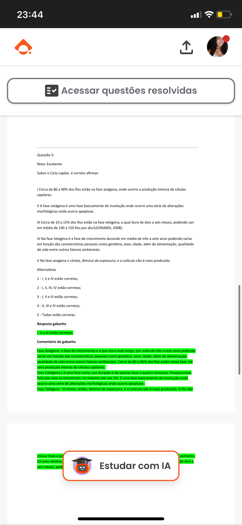 Acessar questões resolvidas Questão 5: Nota: Excelente Sobre o Ciclo capilar, é correto Cerca de 80 a 90% dos fios estão na fase onde ocorre a produção intensa de células capilares. II A fase é uma fase basicamente de involução onde ocorre uma série de alterações morfológicas onde ocorre apoptose. III Cerca de 10 a 15% dos fios estão na fase telógena, a qual dura de dois a seis meses, podendo cair em média de 100 a 150 fios por dia (LEONARDI, 2008). IV Na fase telogéna é a fase de crescimento durando em média de três a sete anos podendo variar em função das características pessoais como genética, sexo, idade, além de alimentação, qualidade de vida entre outros fatores V Na fase diminui de espessura, e a não é mais produzida. Alternativas 1 I, e IV estão corretas; 2 II, III, IV estão corretas; 3 I, e III estão 4 - II, III e IV estão corretas; 5 Todas estão Resposta gabarito e III estão corretas Comentário do gabarito Fase Anágena- a fase de crescimento e a que dura mais longa, por volta de três a sete anos podendo variar em função das características pessoais como genética, sexo, idade, além de alimentação qualidade de vida entre outros fatores Cerca de 80 a 90% dos fios estão nessa fase Há uma produção intensa de células capilares Fase uma fase curta, sua duração é de apenas duas a quatro semanas. nela se encontram, no máximo até uns 2%. uma fase basicamente de involução onde ocorre uma série de alterações morfológicas onde ocorre apoptose Fase Telógena córtex, então, diminui de espessura, e a não é mais produzida o fio não cresce mais e pe portanto, há uma relativa de dois a seis meses, pode Estudar com IA