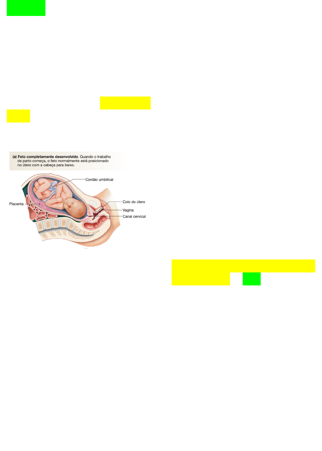 APG 23 - JOÃO VICTOR ROLIM OBJ 1 - ESTUDAR A FISIOLOGIA DO PARTO O parto normalmente ocorre entre a 38a e a 40a semana de gestação. O parto inicia com o trabalho de parto, as contrações rítmicas do útero que empurram o feto para o mundo Os sinais que iniciam essas contrações podem começar na mãe, no feto ou em ambos. os níveis de progesterona não diminuem até que o trabalho de parto esteja em andamento. Outro possível desencadeante do trabalho de parto é a ocitocina, um hormônio pepEdico que causa a contração do músculo uterino. Quando a gestação se aproxima do final, o número de receptores para ocitocina no útero aumenta. Entretanto, estudos têm mostrado que a secreção de ocitocina não aumenta antes do início do trabalho de parto. A ocitocina sintéLca frequentemente é uLlizada para induzir o trabalho de parto nas mulheres grávidas, mas nem sempre é eficaz. --- Aparentemente, o início do trabalho de parto requer algo mais do que quanLdades adequadas de ocitocina. Outra possibilidade para a indução do trabalho de parto é que o feto libere alguns sinais que indiquem que o seu desenvolvimento está completo. Uma teoria apoiada por evidências clínicas é a de que o hormônio liberador da corLcotrofina (CRH) secretado pela placenta é o sinal que começa o trabalho de parto. (O CRH também é um fator liberador hipotalâmico que controla a liberação do ACTH pela adeno- hipófise.) Nas semanas anteriores ao parto, os níveis de CRH no sangue materno aumentam rapidamente Ainda que não seja conhecido com certeza o que inicia o parto, entendemos a sequência de eventos Nos dias que antecedem o início do trabalho de parto aLvo, o colo do útero torna-se mais macio (“amadurece”), e os ligamentos que mantêm os ossos pélvicos unidos se afrouxam à medida que as enzimas desestabilizam o colágeno do tecido conecLvo. O controle desses processos não é claro e pode ser devido ao estrogênio ou ao hormônio pepEdico relaxina, a qual é secretada pelos ovários e pela placenta. Uma vez que as contrações do trabalho de parto começam, inicia-se uma alça de retroalimentação posiLva que consiste em fatores mecânicos e hormonais. ----O Feto geralmente está orientado de cabeça para baixo No incío do trabalho de parto, ele reposiciona-se sozinho na parte inferior do abdome (“o bebê desceu”) e a sua cabeça pressiona o colo do útero amolecido À medida que as contrações do trabalho de parto se intensificam, o feto move-se para baixo através da vagina para fora do útero (Fig. 26.16c), ainda ligado à placenta. A placenta, então, se solta da parede uterina e é expelida pouco tempo depois. As contrações uterinas comprimem os vasos sanguíneos maternos e ajudam a impedir o sangramento excessivo, embora geralmente a mãe perca cerca de 240 ml de sangue no parto. O esLramento cervical desencadeia contrações uterinas que se deslocam como uma onda do topo do útero para baixo, empurrando o feto mais para dentro da pelve. A porção inferior do útero permanece relaxada, e o colo esLra-se e dilata-se. O dilatamento cervical inicia um ciclo de retroalimentação posiLva de contrações progressivas OBJ 2 - COMPREENDER A CONTRAÇÃO DO MÚSCULO LISO NO PARTO o músculo liso pode ser dividido em seis grupos principais: ►Pela localização vascular (paredes dos vasos sanguíneos), gastrintesLnal (paredes do tubo digestório e órgãos associados, como a vesícula biliar), urinário (paredes da bexiga e dos ureteres), respiratório (vias aéreas), reproduLvo (útero das fêmeas e outras estruturas tanto em machos quanto em fêmeas) e ocular (olhos). ►Pelo padrão de contração O músculo liso pode ser classificado em relação ao padrão de contração: se o músculo alterna entre estados de contração e relaxamento ou se ele se mantém conLnuamente contraído contração e relaxamento----- músculos lisos fásicos, ex; parede do esôfago inferior contraídos de forma conEnua----- músculos lisos tônicos, ex; es`ncteres do esôfago e da bexiga urinaria ►Pelo modo de comunicação entre as células vizinhas. Em alguns músculos lisos, as células estão conectadas eletricamente por junções comunicantes e contraem como uma unidade coordenada. Esses músculos consLtuem o chamado músculo liso unitário. No músculo liso mulLunitário, as células não estão ligadas eletricamente, e cada célula muscular funciona de modo independente. O músculo liso multiunitário é encontrado em parte do trato reprodutor masculino e no útero (exceto no período logo antes do parto). De modo surpreendente, o músculo liso multiunitário presente no útero se transforma em músculo liso unitário durante os estágios finais da gestação. Os genes que codificam as proteínas conexinas das junções comunicantes são ativados provavelmente pela influência dos hormônios da gestação. A adição de junções comunicantes às células musculares do útero permite a sincronização dos sinais elétricos, fazendo a musculatura uterina contrair de modo mais eficaz durante o trabalho de parto. A OCITOCINA CAUSA CONTRAÇA, O DO U. TERO A ocitocina é um hormônio secretado pela neuro-hipófise que, especificamente, causa contrações uterinas. Existem quatro razões para se acreditar que a ocitocina pode ser importante para aumentar a contraLlidade do útero próximo ao termo: (GUYTON, 13a ed.) • A musculatura uterina aumenta seus receptores de ocitocina e, portanto, aumenta sua sensibilidade a uma determinada dose de ocitocina nos últimos meses de gravidez. • A secreção de ocitocina pela neuro-hipófise é, consideravelmente, maior no momento do parto • Experimentos em animais indicam que a irritação ou a dilatação do colo uterino, como ocorre durante o trabalho de parto, pode causar reflexo neurogênico (alterações do sistema nervoso afetam a regulação do organismo), através dos núcleos paraventricular e supraóptico, que faz com que a hipófis