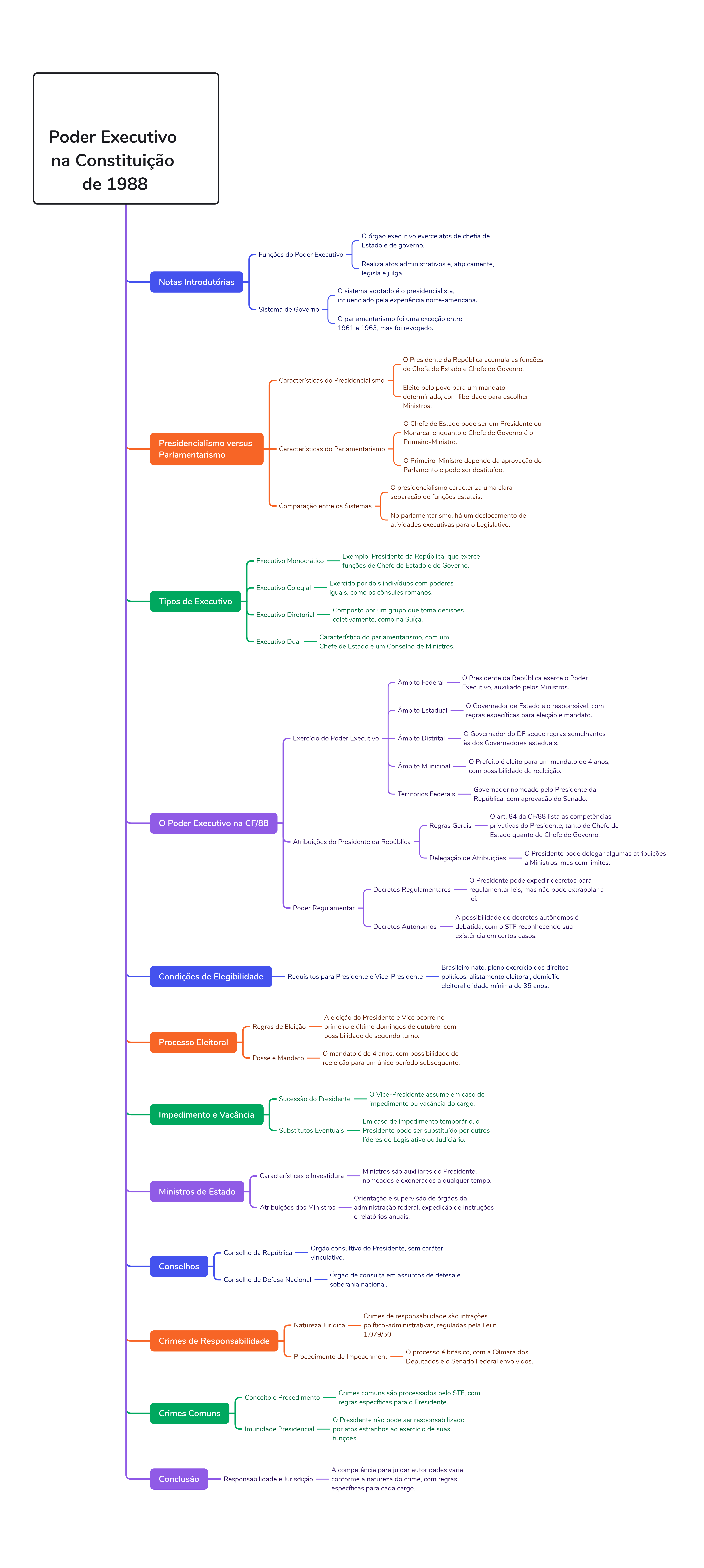 Poder Executivo na Constituição de 1988 o órgão executive exerce atos de chefia de Estado Funções Poder Executive Realiza atos administrativos legisla Notas Introdutórias sistema adotado influenciado pela experiência norte Sistema de Governo parlamentarismo foi uma exceção entre 1961 1963 mas Presidente da República acumula as funções de Chefe de Estado Chefe de Governo Características do Presidencialismo Eleito pelo povo para um mandato determinado com liberdade para escolher Ministros Chefe de Estado pode ser um Presidente ou Monarca enquanto Chefe de Governo Presidencialismo versus Primeiro Ministro Características do Parlamentarismo Parlamentarismo Primeiro dependo da aprovação do Parlamento pode ser destituído presidencialismo caracteriza uma clara separação de funções estatais Comparação entre Sistemas No há um deslocamento de atividades executivas para Legislativo Exemplo: Presidente da República que Executivo Monocrático funções de Chefe de Estado de Exercido por dois indivíduos com poderes Colegia iguais como os cônsules romanos Tipos de Executivo Executivo Diretoria Composto por um grupo toma decisões coletivamente como na Característico do parlamentarismo com um Dual do Estado um Conselho de Ministros Federal Presidente da República exerce Poder Executivo auxiliado pelos Ministros o Governador do Estado responsável com Ambito Estadual regras específicas para eleição mandato Exercício do Poder Executivo Distrita Governador do DF segue regras semelhantes às dos Governadores Municipal Prefeito eleito para um de anos com possibilidade reeleição Governador pelo Presidente da Territórios Federais com aprovação do Senado o art. 84 da lista as competências Poder Executivo na CF/88 Regras Gerais privativas do Presidente tanto Estado quanto de Chefe de Governo Atribuições do Presidente da República Delegação Atribuições o Presidente pode delegar algumas atribuições a Ministros mas com limites Presidente pode expedir decretos para Decretos Regulamentares regulamentar mas não pode extrapolar a lei Poder Regulamentar A possibilidade de decretos autônomos é Decretos Autônomos debatida com reconhecendo sua existência em certos casos Brasileiro nato exercício dos direitos Condições de Elegibilidade Requisitos para Presidente Vice-Presidente alistamento eleitoral domicílio eleitoral idade mínima de 35 A eleição do Presidente Vice ocorre no Regras Eleição primeiro último domingos de outubro com possibilidade de segundo turno Processo Eleitoral mandato de anos com possibilidade de Posse Mandato reeleição para um único período subsequente Vice assumo em caso do Sucessão do Presidente impedimento ou vacância do cargo Impedimento Vacância Em caso de impedimento Substitutos Eventuais Presidente podo ser substituído por outros líderes do Legislativo ou Judiciário Características Investidura Ministros são auxiliares do Presidente, nomeados qualquer tempo Ministros de Estado Orientação supervisão de órgãos da Atribuições dos Ministros administração expedição de instruções e relatórios anuais Órgão consultivo do Presidente sem Conselho da República vinculativo Conselhos Conselho de Defesa Nacional Órgão de consulta em assuntos de defesa e soberania nacional Crimes do são infrações Natureza Jurídica reguladas pela Lein Crimes de Responsabilidade processo bifásico com Câmara dos Procedimento de Impeachment Deputados Senado Federal envolvidos Conceito Procedimento Crimes comuns são processados pelo STF com regras específicas para Presidente Crimes Comuns O Presidente não pode ser responsabilizado Imunidade Presidencia por atos estranhos ao exercício de suas funções A competência para julgar autoridades varia Conclusão Responsabilidade Jurisdição conforme natureza do crime com regras específicas para cada cargo.