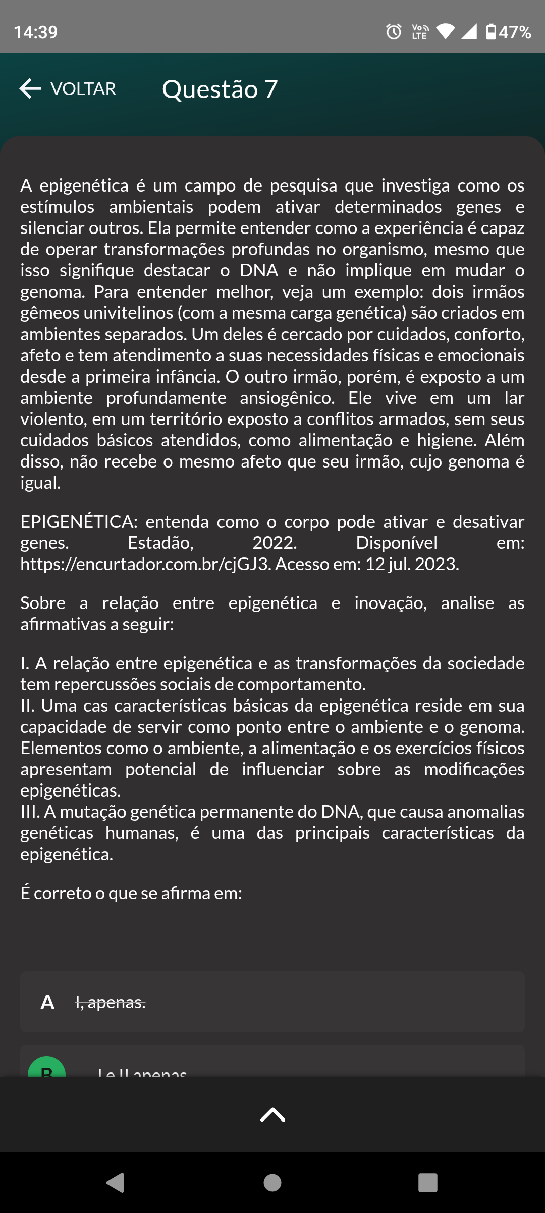 14:39 LTE 47% VOLTAR Questão 7 A epigenética é um campo de pesquisa que investiga como os estímulos ambientais podem ativar determinados genes e silenciar outros. Ela permite entender como a experiência é capaz de operar transformações profundas no organismo, mesmo que isso signifique destacar O DNA e não implique em mudar O genoma. Para entender melhor, veja um exemplo: dois irmãos gêmeos univitelinos (com a mesma carga genética) são criados em ambientes separados. Um deles é cercado por cuidados, conforto, afeto e tem atendimento a suas necessidades físicas e emocionais desde a primeira infância. O outro irmão, porém, é exposto a um ambiente profundamente ansiogênico. Ele vive em um lar violento, em um território exposto a conflitos armados, sem seus cuidados básicos atendidos, como alimentação e higiene. Além disso, não recebe O mesmo afeto que seu irmão, cujo genoma é igual. EPIGENÉTICA: entenda como O corpo pode ativar e desativar genes. Estadão, 2022. Disponível em: https://encurtador.com.br/cjGJ3 Acesso em: 12 jul. 2023. Sobre a relação entre epigenética e inovação, analise as afirmativas a seguir: I. A relação entre epigenética e as transformações da sociedade tem repercussões sociais de comportamento. II. Uma cas características básicas da epigenética reside em sua capacidade de servir como ponto entre O ambiente e O genoma. Elementos como O ambiente, a alimentação e os exercícios físicos apresentam potencial de influenciar sobre as modificações epigenéticas. III. A mutação genética permanente do DNA, que causa anomalias genéticas humanas, é uma das principais características da epigenética. É correto O que se afirma em: A