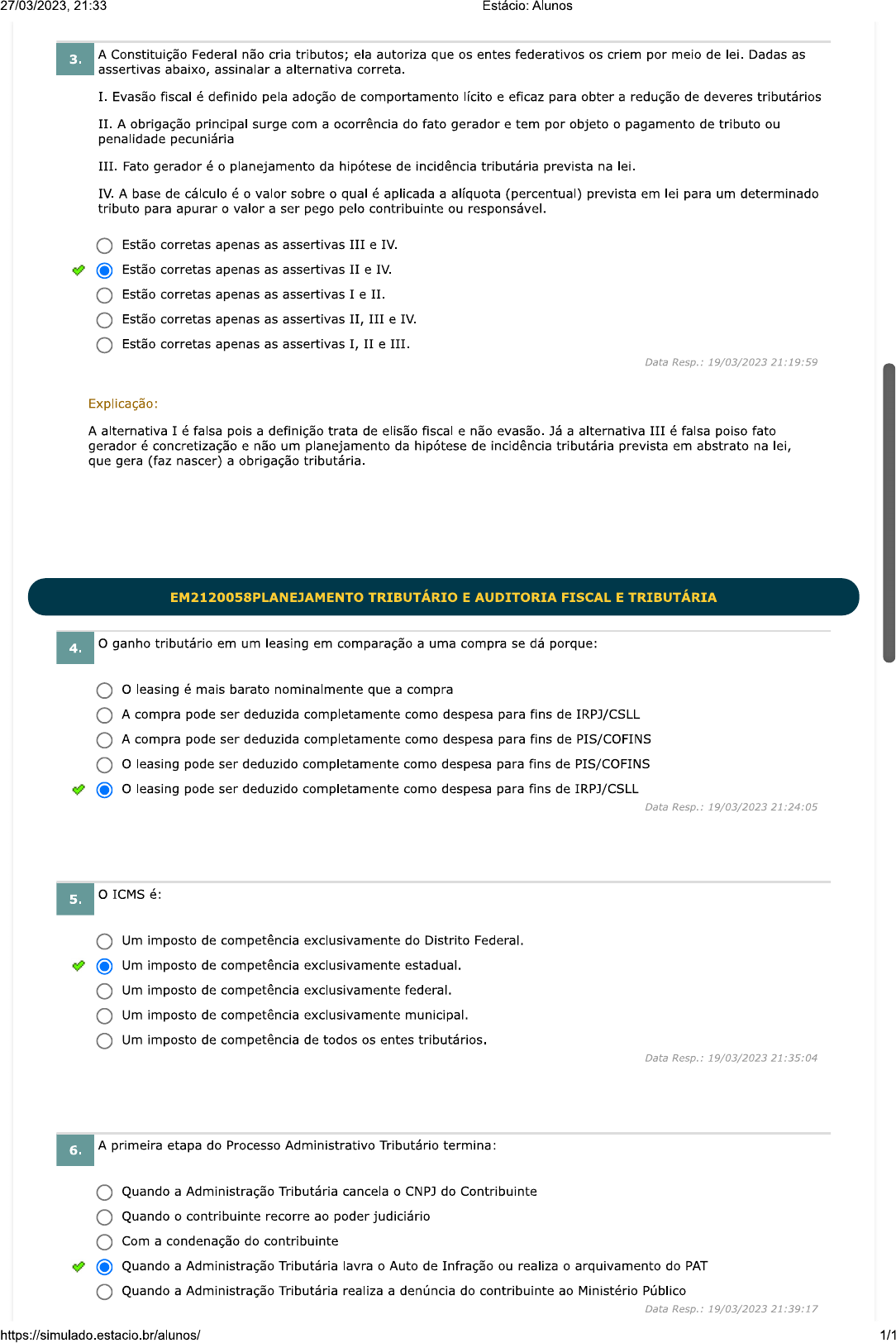 27/03/2023, 21:33 Estácio: Alunos 3. A Constituição Federal não cria tributos; ela autoriza que os entes federativos os criem por meio de Dadas as assertivas abaixo, assinalar a alternativa correta. I. Evasão fiscal é definido pela adoção de comportamento lícito e eficaz para obter a redução de deveres tributários II. A obrigação principal surge com a ocorrência do fato gerador e tem por objeto o pagamento de tributo ou penalidade pecuniária III. Fato gerador é o planejamento da hipótese de incidência tributária prevista na lei. IV. A base de cálculo é o valor sobre o qual é aplicada a alíquota (percentual) prevista em lei para um determinado tributo para apurar o valor a ser pego pelo contribuinte ou responsável. Estão corretas apenas as assertivas III e IV. Estão corretas apenas as assertivas II e IV. Estão corretas apenas as assertivas I e II. Estão corretas apenas as assertivas II, III e IV. Estão corretas apenas as assertivas I, II e III. Data Resp.: 19/03/2023 21:19:59 Explicação: A alternativa I é falsa pois a definição trata de elisão fiscal e não evasão. Já a alternativa III é falsa poiso fato gerador é concretização e não um planejamento da hipótese de incidência tributária prevista em abstrato na lei, que gera (faz nascer) a obrigação tributária. EM2120058PLANEJAMENTO TRIBUTÁRIO E AUDITORIA FISCAL E TRIBUTÁRIA 4. ganho tributário em um leasing em comparação a uma compra se dá porque: leasing é mais barato nominalmente que a compra A compra pode ser deduzida completamente como despesa para fins de IRPJ/CSLL A compra pode ser deduzida completamente como despesa para fins de PIS/COFINS o leasing pode ser deduzido completamente como despesa para fins de PIS/COFINS leasing pode ser deduzido completamente como despesa para fins de IRPJ/CSLL Data Resp.: 19/03/2023 21:24:05 5. ICMS é: Um imposto de competência exclusivamente do Distrito Federal. Um imposto de competência exclusivamente estadual. Um imposto de competência exclusivamente federal. Um imposto de competência exclusivamente municipal. Um imposto de competência de todos os entes tributários. Data Resp.: 19/03/2023 21:35:04 6. A primeira etapa do Processo Administrativo Tributário termina: Quando a Administração Tributária cancela o CNPJ do Contribuinte Quando o contribuinte recorre ao poder judiciário Com a condenação do contribuinte Quando a Administração Tributária lavra o Auto de Infração ou realiza o arquivamento do PAT Quando a Administração Tributária realiza a denúncia do contribuinte ao Ministério Público Data 19/03/2023 21:39:17 https://simulado.estacio.br/alunos/ 1/1