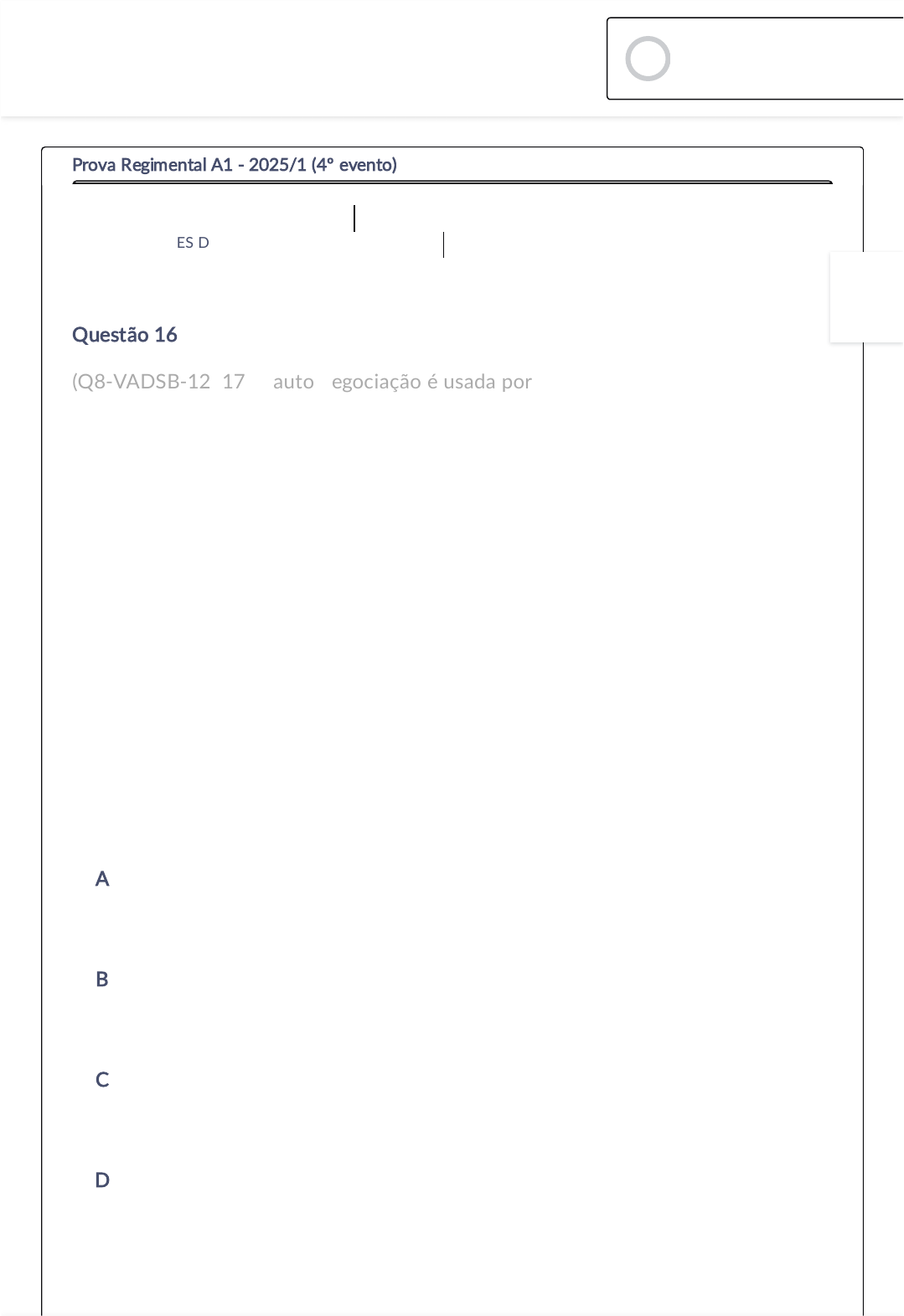 Prova Regimental A1 - 2025/1 (4º evento) Questão 16 (Q8-VADSB-12017) A auto negociação é usada por alguns equipamentos a fim de se adequar à transmissão e recepção de pacotes/quadros. Veja abaixo algumas afirmações a respeito de auto negociação. I) Dois equipamentos interligados por interfaces que têm velocidades de transmissão diferentes, se comunicam pela velocidade mais alta oferecida por uma destas duas interfaces Ex. Placa de rede 10/100 Mbps se comunicando com Switch 100/1000 Mbps, a velocidade escolhida será 1000 Mbps. II) Dois equipamentos interligados por interfaces que têm velocidades de transmissão diferentes, se comunicam pela velocidade mais baixa oferecida por uma destas duas interfaces. Ex. Placa de rede 10/100 Mbps se comunicando com Switch 100/1000 Mbps, a velocidade escolhida será 100 Mbps. III) Na auto negociação, além da velocidade de transmissão, são negociados também se elas irão se comunicar no modo half duplex ou full duplex. Está(ão) correta(s): A B C D Curso: CST EM BANCO DE DADOS (61) Disciplina: REDES DE COMPUTADORES (1403); +1 Turma: Turma_005 (2078090_1403); +1 Somente a afirmativa III Somente a afirmativa I Somente a afirmativa II As afirmativas I e II BRUNO LUIZ COSTA DA SILVA 75_4439229002:53:25 BS 01/06/2025, 20:02 AvaliA Online :: AvaliA Online https://graduacaocruzeirodosul.grupoa.education/avalia-online/ 1/2 E As afirmativas II e III BRUNO LUIZ COSTA DA SILVA 75_4439229002:53:25 BS Anterior 16/16 Ir para o resumo 01/06/2025, 20:02 AvaliA Online :: AvaliA Online https://graduacaocruzeirodosul.grupoa.education/avalia-online/ 2/2