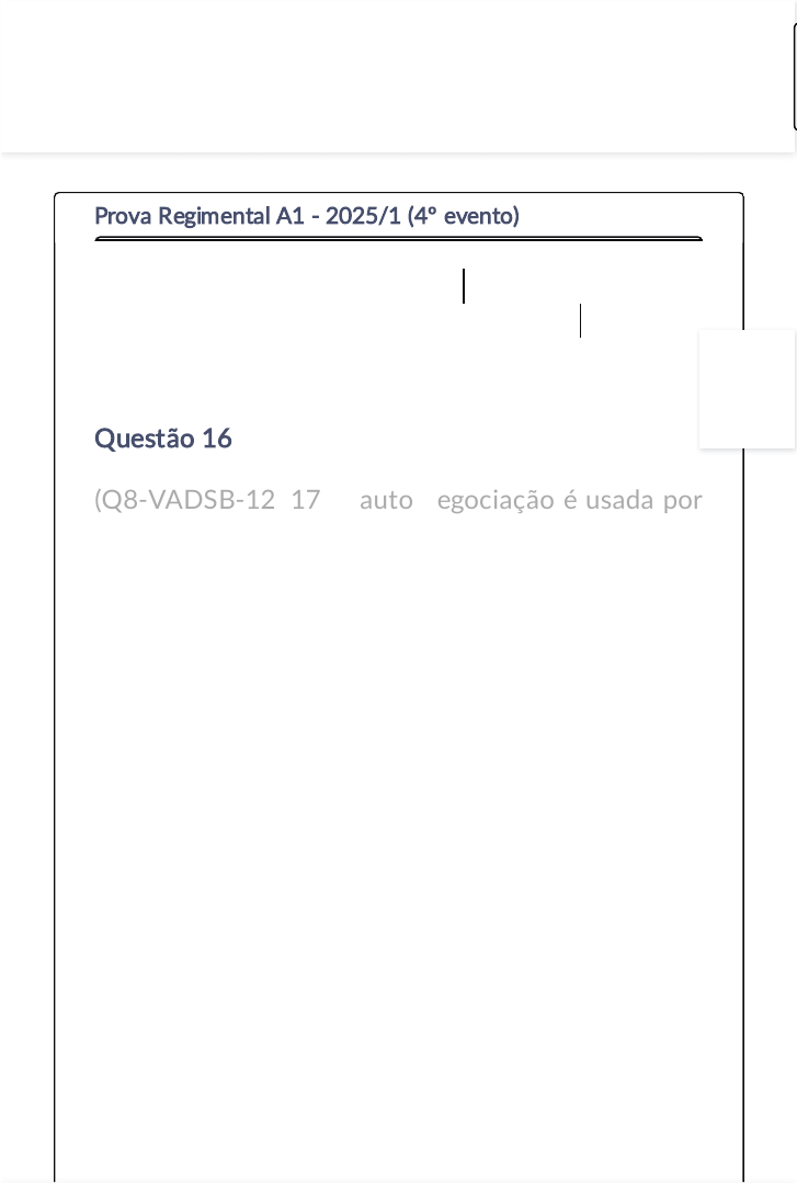 Prova Regimental A1 - 2025/1 (4º evento) Questão 16 (Q8-VADSB-12017) A auto negociação é usada por alguns equipamentos a fim de se adequar à transmissão e recepção de pacotes/quadros. Veja abaixo algumas afirmações a respeito de auto negociação. I) Dois equipamentos interligados por interfaces que têm velocidades de transmissão diferentes, se comunicam pela velocidade mais alta oferecida por uma destas duas interfaces Ex. Placa de rede 10/100 Mbps se comunicando com Switch 100/1000 Mbps, a velocidade escolhida será 1000 Mbps. II) Dois equipamentos interligados por interfaces que têm velocidades de transmissão diferentes, se comunicam pela velocidade mais baixa oferecida por uma destas duas interfaces. Ex. Placa de rede 10/100 Mbps se comunicando com Switch Curso: CST EM BANCO DE DADOS (61) Disciplina: REDES DE COMPUTADORES (1403); +1 Turma: Turma_005 (2078090_1403); +1 02:47:34 01/06/2025, 20:20 AvaliA Online :: AvaliA Online https://graduacaocruzeirodosul.grupoa.education/avalia-online/ 1/2 100/1000 Mbps, a velocidade escolhida será 100 Mbps. III) Na auto negociação, além da velocidade de transmissão, são negociados também se elas irão se comunicar no modo half duplex ou full duplex. Está(ão) correta(s): A B C D E Somente a afirmativa III Somente a afirmativa I Somente a afirmativa II As afirmativas I e II As afirmativas II e III 02:47:34 Anterior 16/16 Ir para o resumo 01/06/2025, 20:20 AvaliA Online :: AvaliA Online https://graduacaocruzeirodosul.grupoa.education/avalia-online/ 2/2
