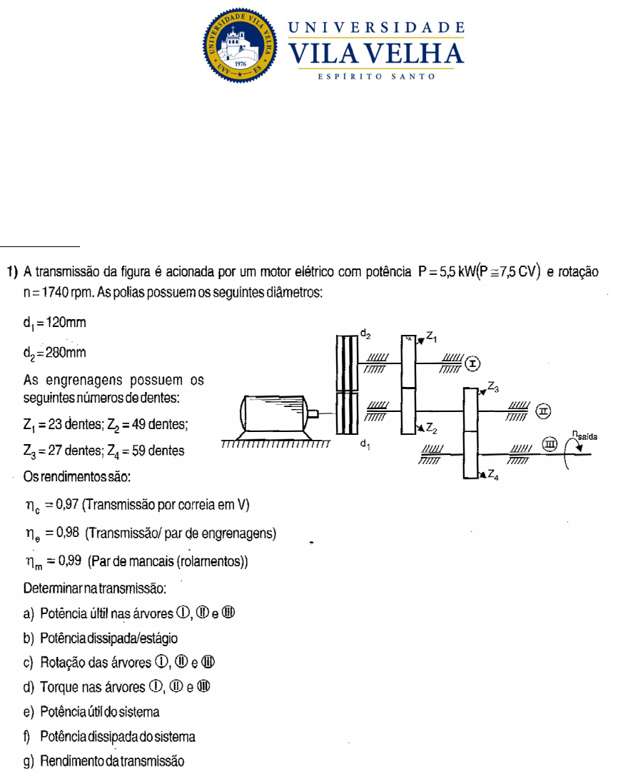 1 LISTA DE EXERCÍCIOS - 2º BIMESTRE ELEMENTOS DE MÁQUINAS I 2025/1 Valor 3 pontos Prof. Newton Valladão Junior EXERCÍCIO 1 2 EXERCÍCIO 2 EXERCÍCIO 3 Um sistema de içamento é composto por um motor, um redutor com 3 estágios, redução total de 15:1, tambor de içamento de 1 metro de diâmetro. O rendimento do tambor de içamento é de 0,98 e de cada engrenamento helicoidal de 0,985. Considere a rotação de entrada no redutor pelo motor de 1200 RPM. Considerando as perdas nos mancais desprezíveis, calcule a velocidade da carga, a potência do motor e o montante das perdas, quando o sistema estiver içando uma carga de 1000 Kg. EXERCÍCIO 4 Uma transmissão, formada por duas engrenagens e utilizada para aumentar a velocidade angular, tem seu eixo de entrada conectado a um motor que gira a 1200 rpm e fornece 56 KW de potência mecânica. Considerando que as engrenagens possuem 60 e 15 dentes e que a eficiência da transmissão é 0,9, calcule torque na engrenagem menor. 3 EXERCÍCIO 5 Calcular a potência de um redutor para a seguinte situação: - Agitador de líquidos com carga uniforme. - Redutor com 2 estágios de transmissão - Motor elétrico: N=1750 rpm - Potência efetiva requerida pelo agitador = 10 cv - Rotação no eixo do agitador: N=120 rpm - Ciclo operativo = 12 horas/dia - 30 Partidas por hora. Obs.: Usar as tabelas do material Rendimento das transmissões. EXERCÍCIO 6 Um compressor de ar é do tipo pistão, gira a 800rpm, acionado por um motor elétrico CA, trifásico de 1800 rpm, com potência de 2 cv. Considerações: - Distância entre centros de 800 mm ± 10 mm - Serviço de 2 turnos de 8 horas por dia - Coeficiente de atrito correia-polia de 0,25 - Utilizar correia Gates Super HC Determinar: a) Número de correias necessárias b) Especificação da correia (Número de Referência Gates) c) Diâmetro das polias motora e movida d) Distância entre centros com a correia especificada Obs.: Usar as tabelas do material de aula.